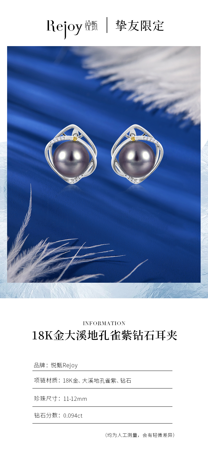 【挚友限定】 悦甄 18k金 孔雀紫珍珠钻石耳夹 星辰