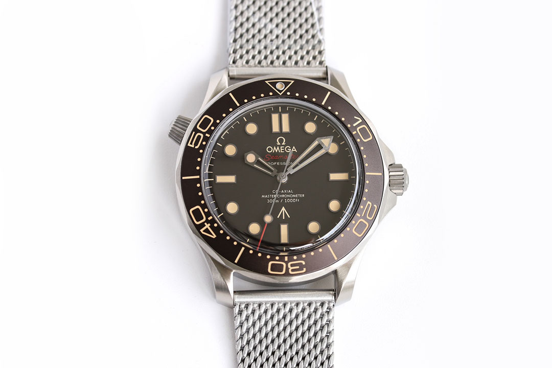 腕表外圈是铝合金材质而不是陶瓷制成,同样的盘面也是铝合金材质,整体偏磨砂的效果,外圈刻度深浅有致, 搭配棕色的时标刻度,呈现出复古表款历经岁月所展现的“tropical”色调,在颜色上与原版并无色差,并且外圈刻度对准盘面内时标,细节处到位。盘面的刻度和指针,也采用了棕色的设计,并涂覆复古Super-LumiNova荧光物料,远看有点像最近流行的“三文鱼”色。和现款海马300不同的是,在六点钟的位置,取消了日历的显示,显得更加干脆利落。在表盘六点钟位置和后盖上都有一个“阔箭头”的标记。 不过这种颜色填充的夜光涂料,虽然在颜色上同步正品,但是唯一不足的一点就是夜光上达不到原版的亮度,虽然VS宣称使用了super夜光涂料不过实测中夜光还是有所差距。不过日常佩戴中影响并不是很大,毕竟室内关灯的情况都是睡觉前看手机多而不是看腕表了。