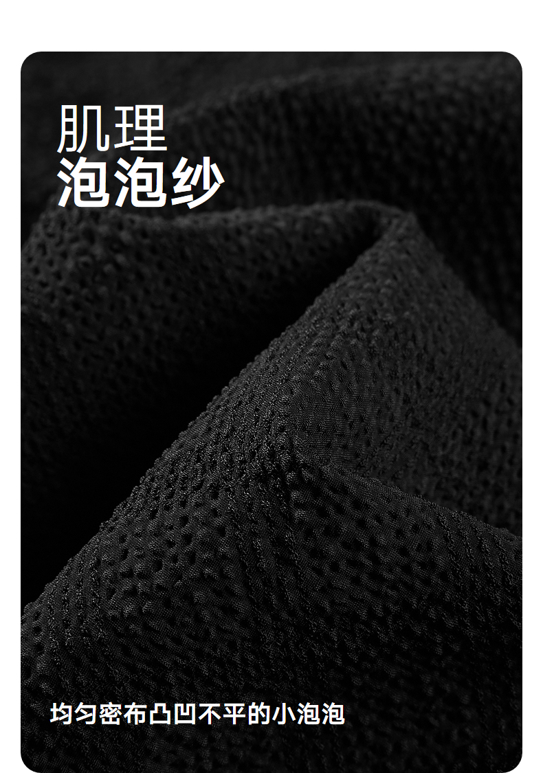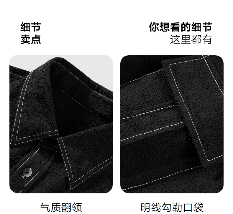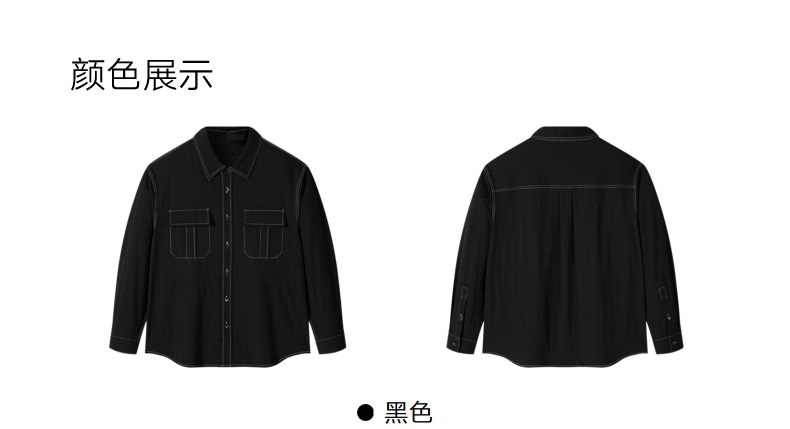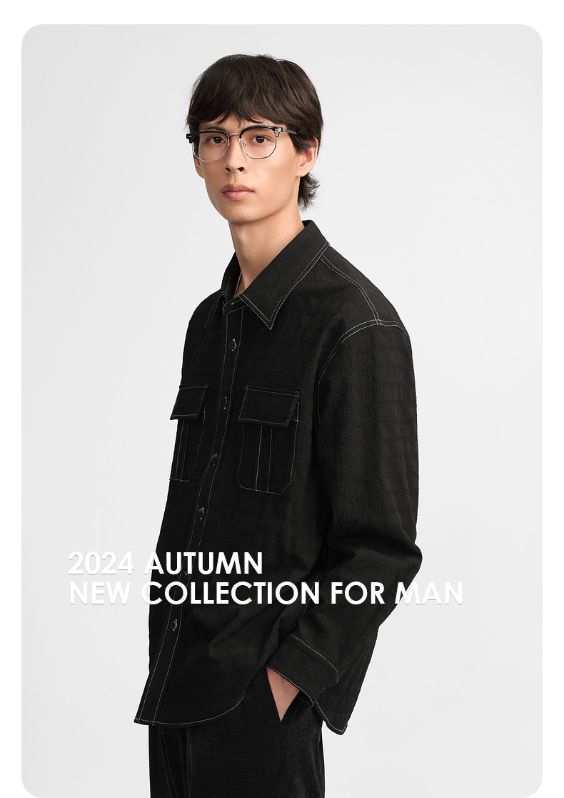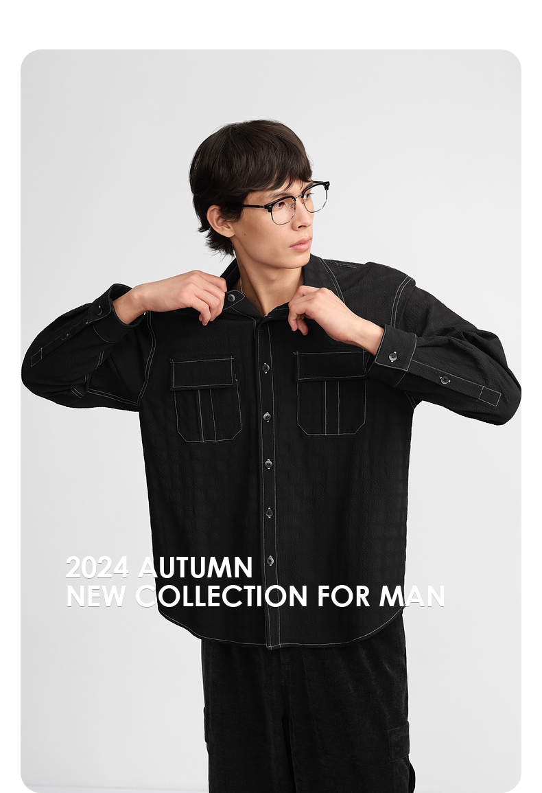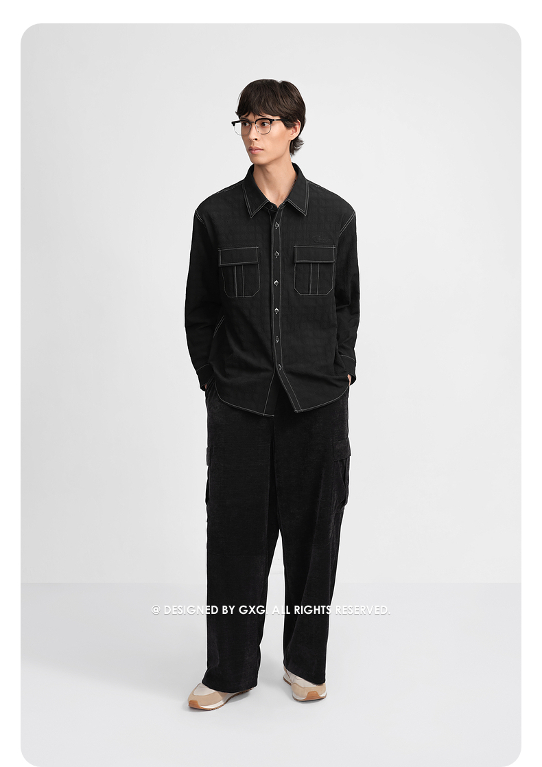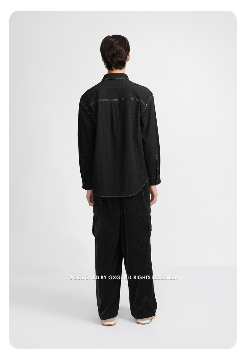 GXG男装 黑色泡泡纱肌理撞色格纹休闲宽松长袖衬衫男 24秋季热卖