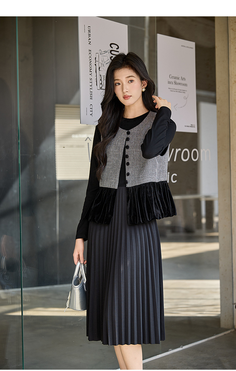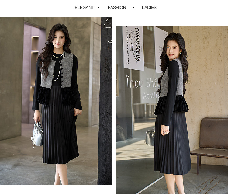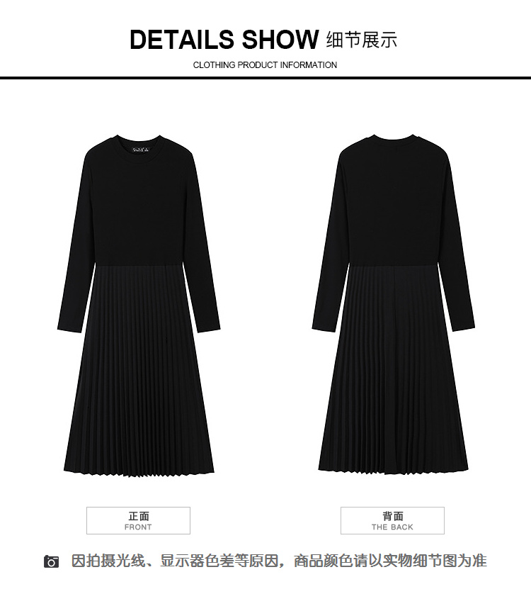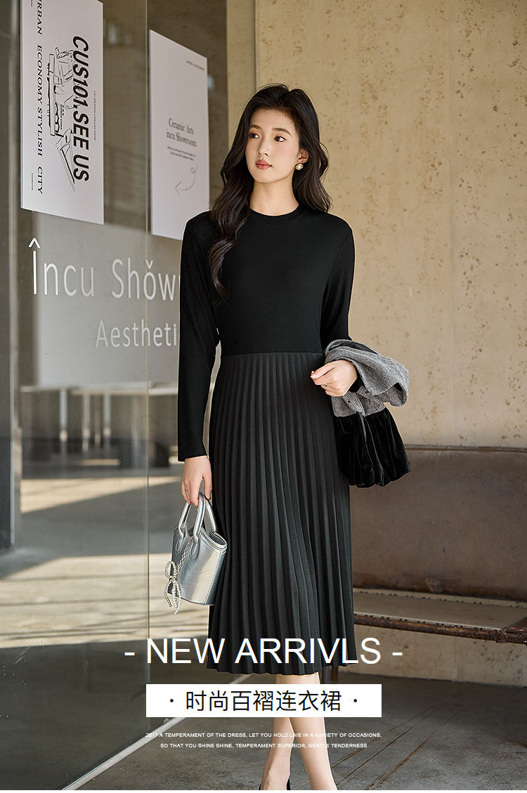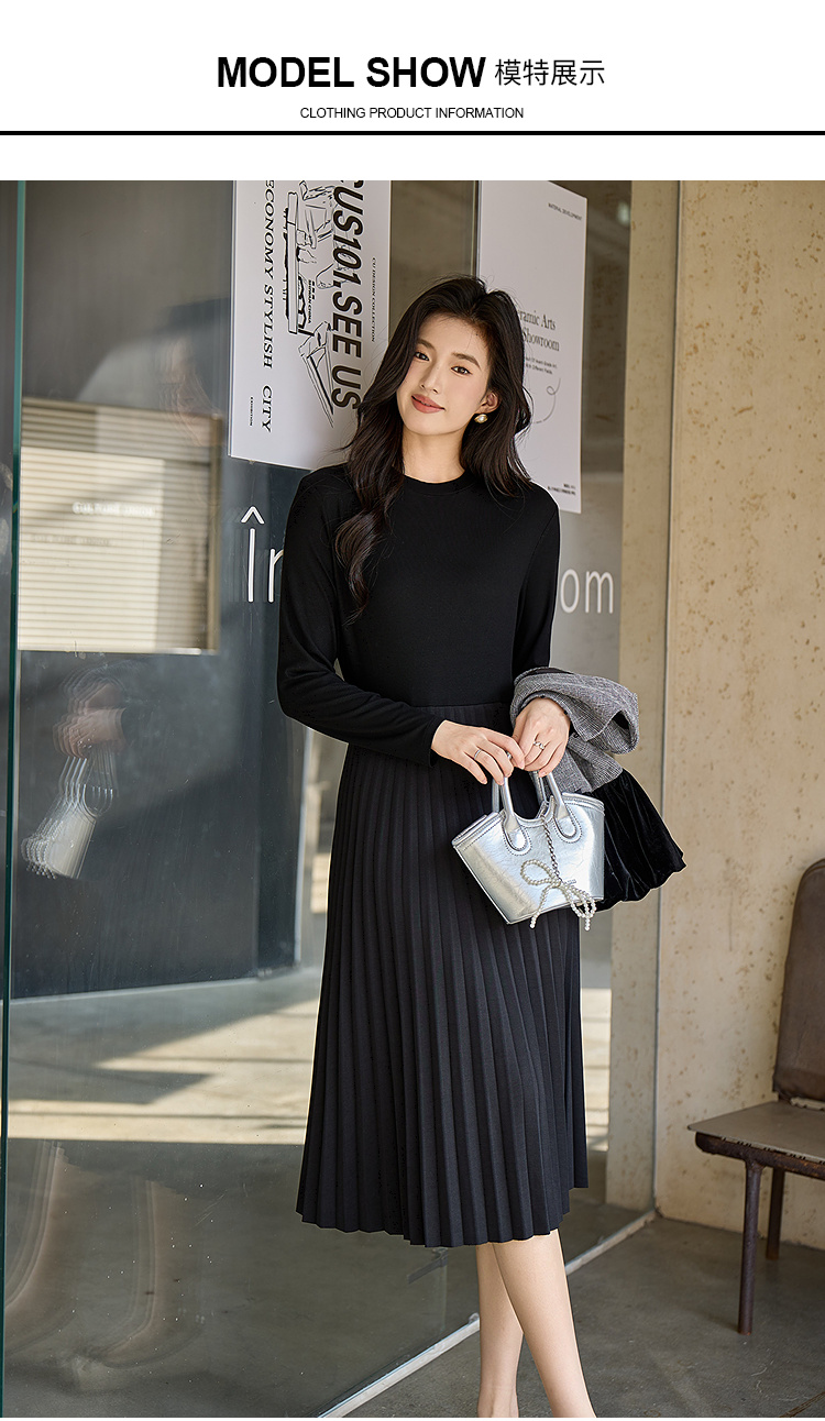 奢姿大码女装2025冬季简约圆领小黑裙胖妹妹针织拼接百褶连衣裙9954853711B