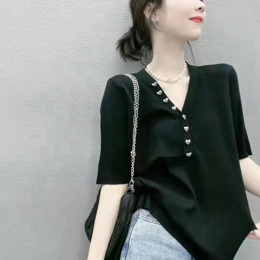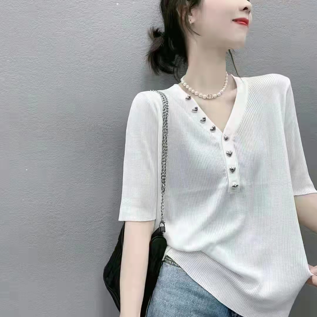 丽人轩小衫今年的流行款。Ⅴ领设计时尚减龄面料有弹性穿着舒适透气性好,颜色条纹白色黑百搭时尚款尺码均码号从90斤穿到140斤