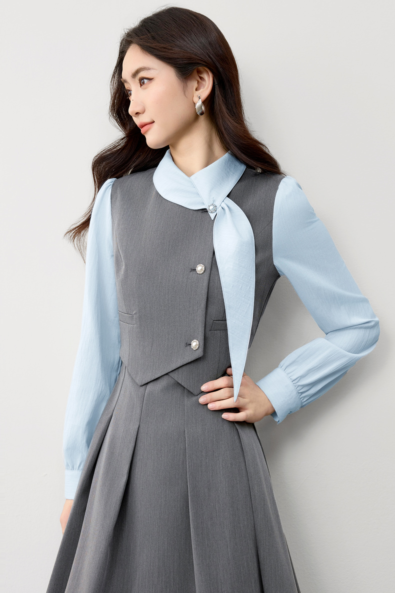 【内购】【假两件】优雅通勤撞色拼接飘带翻领裙摆压褶收腰长袖A字连衣裙-153LI2741
