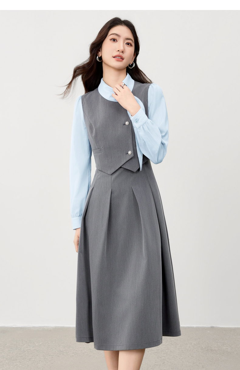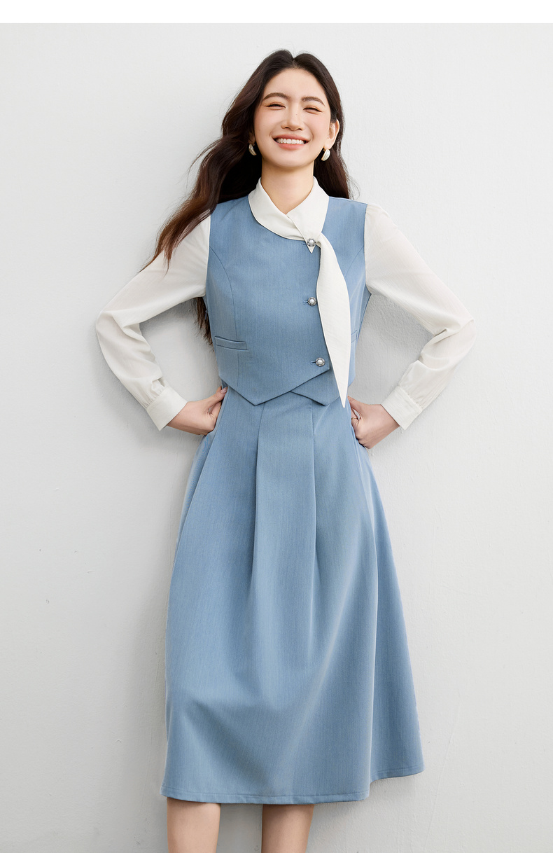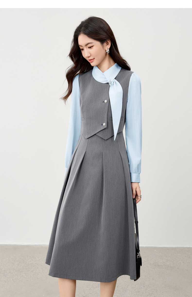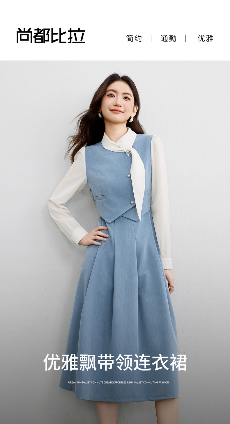 【内购】【假两件】优雅通勤撞色拼接飘带翻领裙摆压褶收腰长袖A字连衣裙-153LI2741 商品图3
