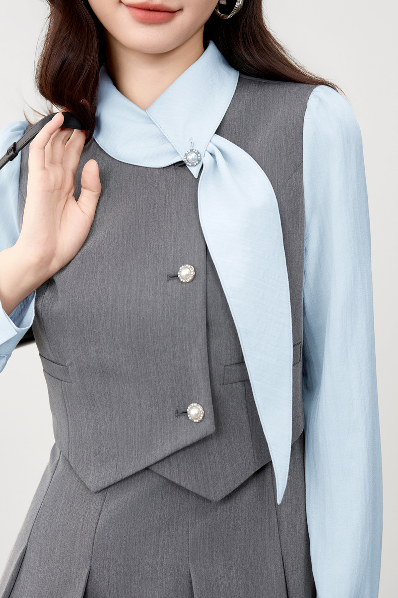 【内购】【假两件】优雅通勤撞色拼接飘带翻领裙摆压褶收腰长袖A字连衣裙-153LI2741 商品图4