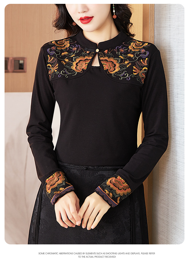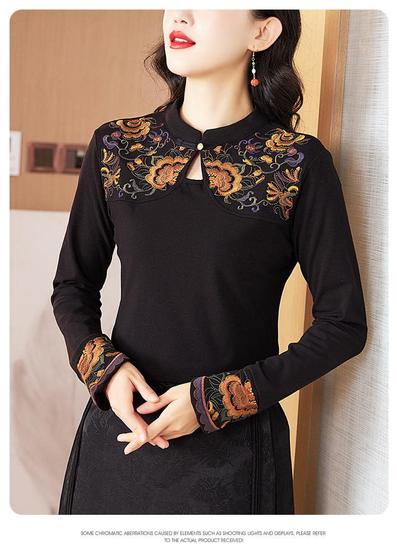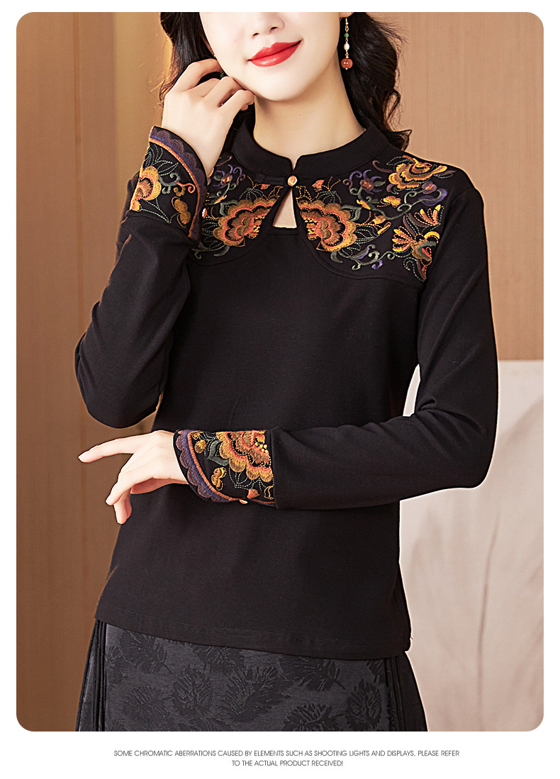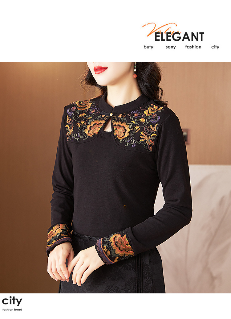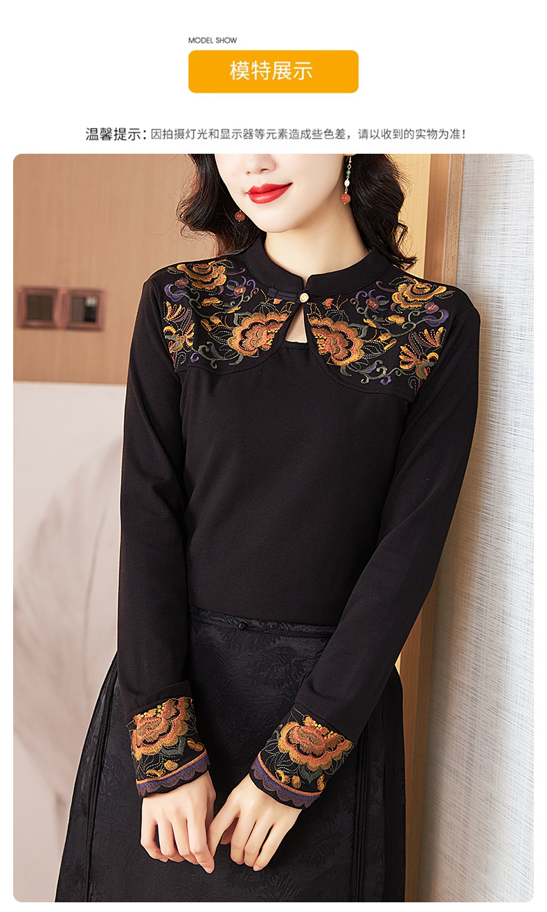 秋新款民族风秋装长袖刺绣T恤,绣花上衣圆领套头黑色打底衫KQL-422H2286