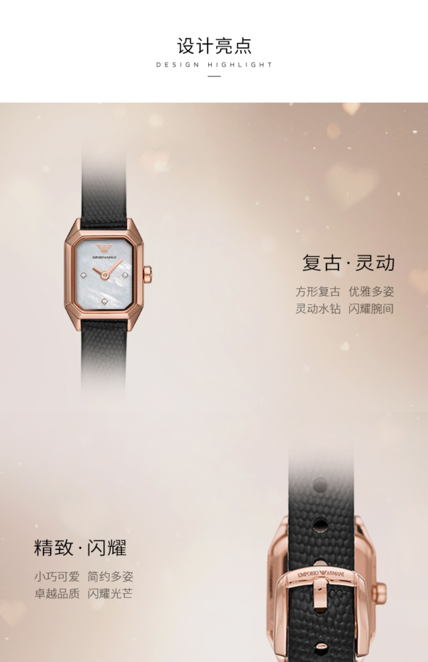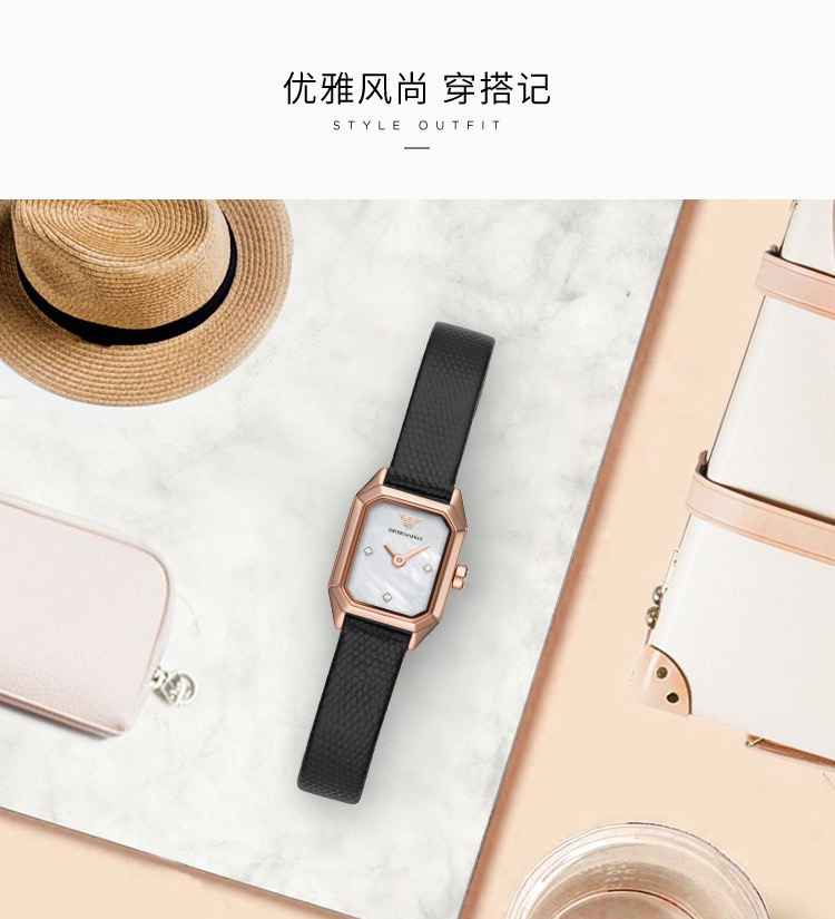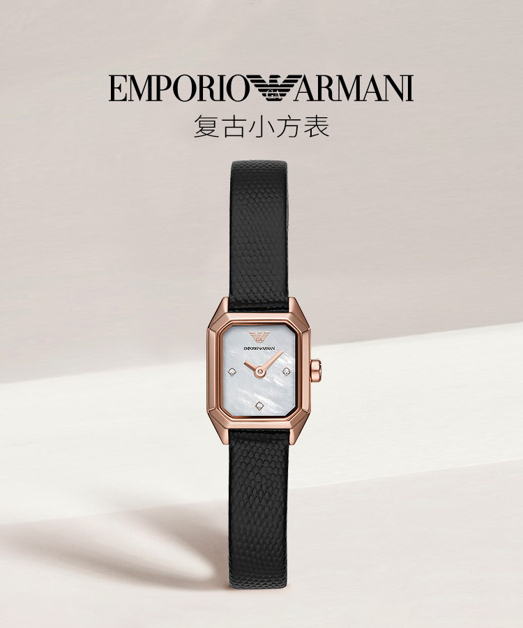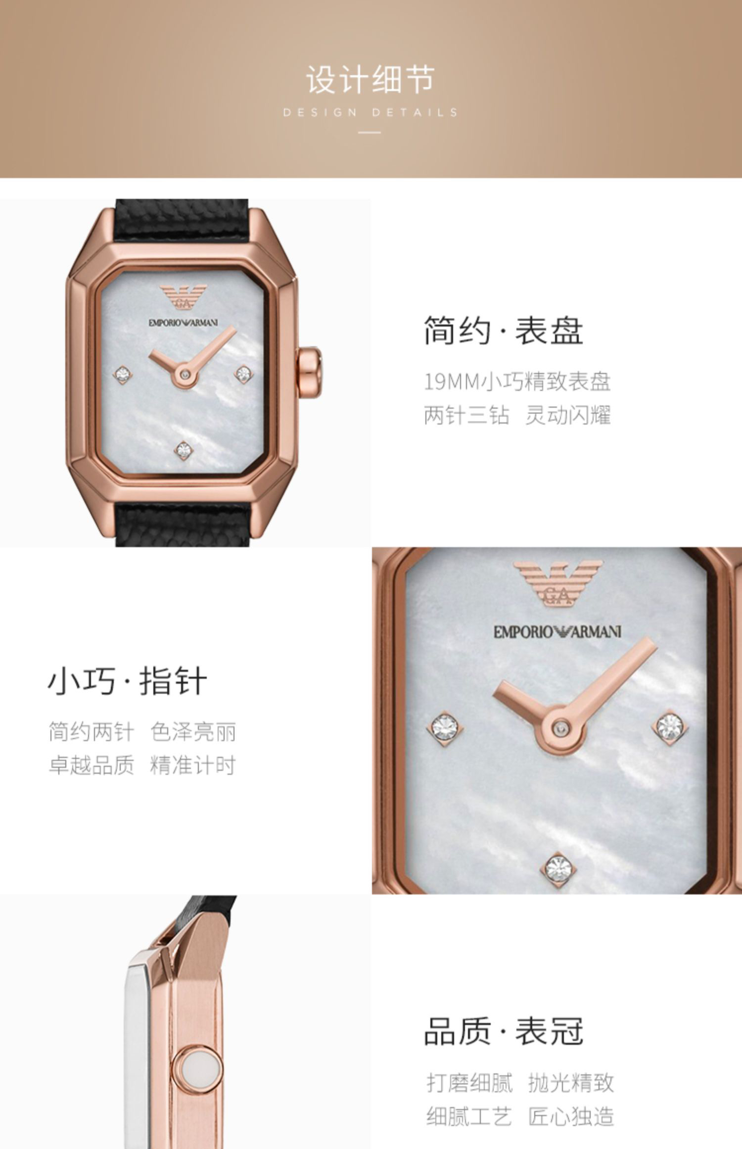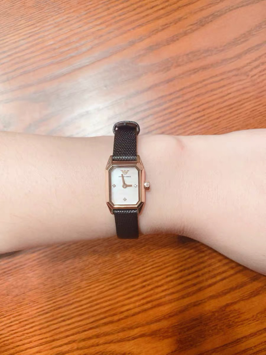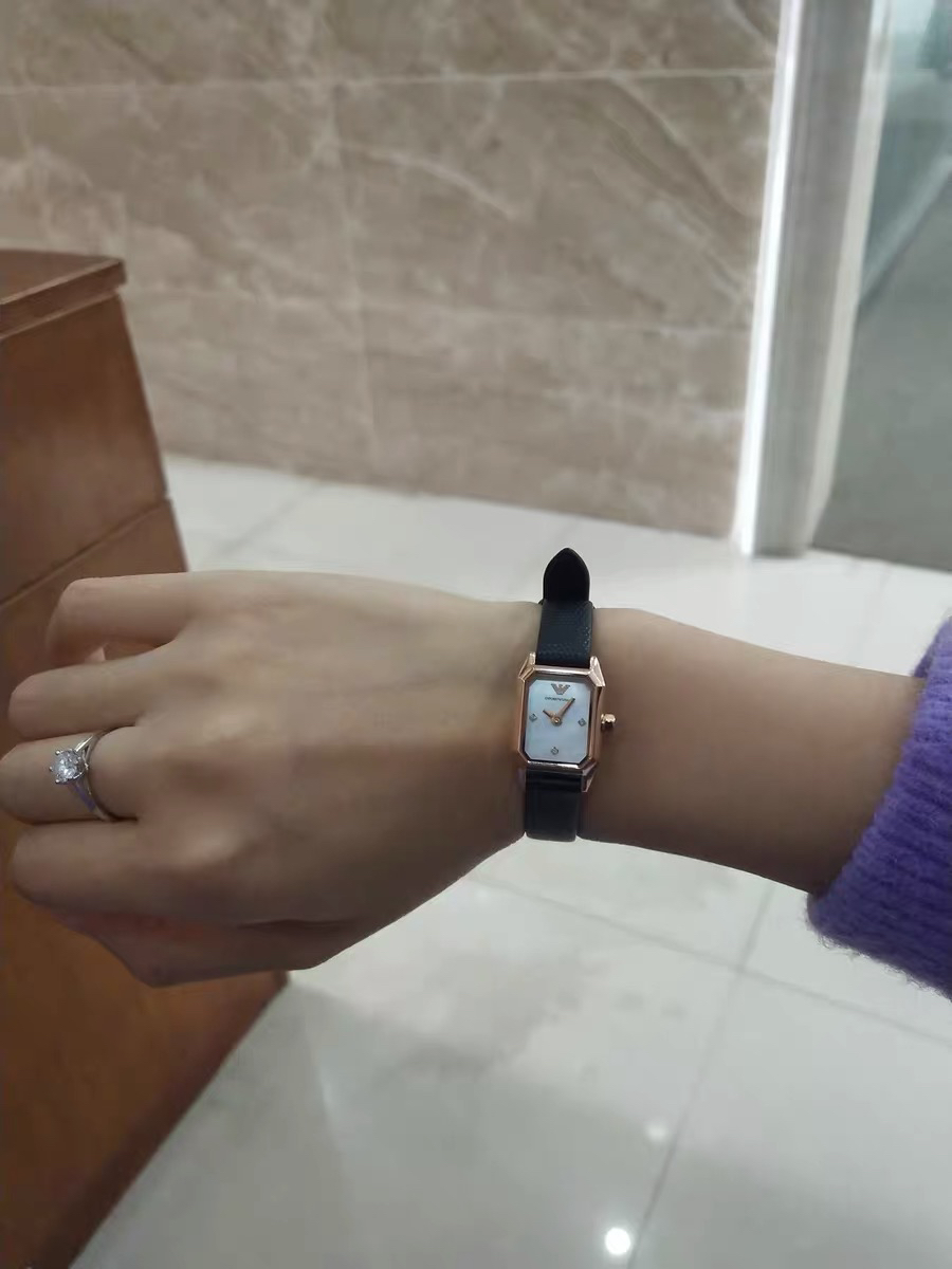 很多买家秀,阿玛尼出了很多大表盘的亮钻表,这种皮质表带 小的贝壳方表盘的是内敛女生首选