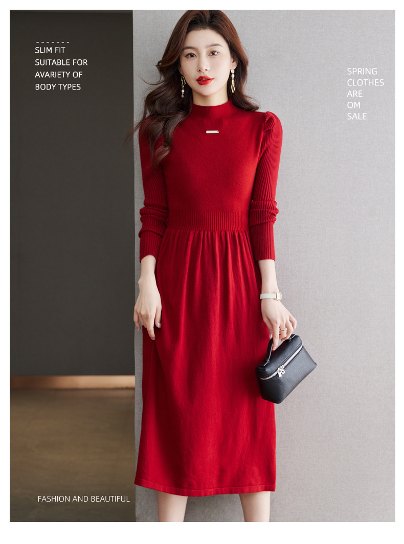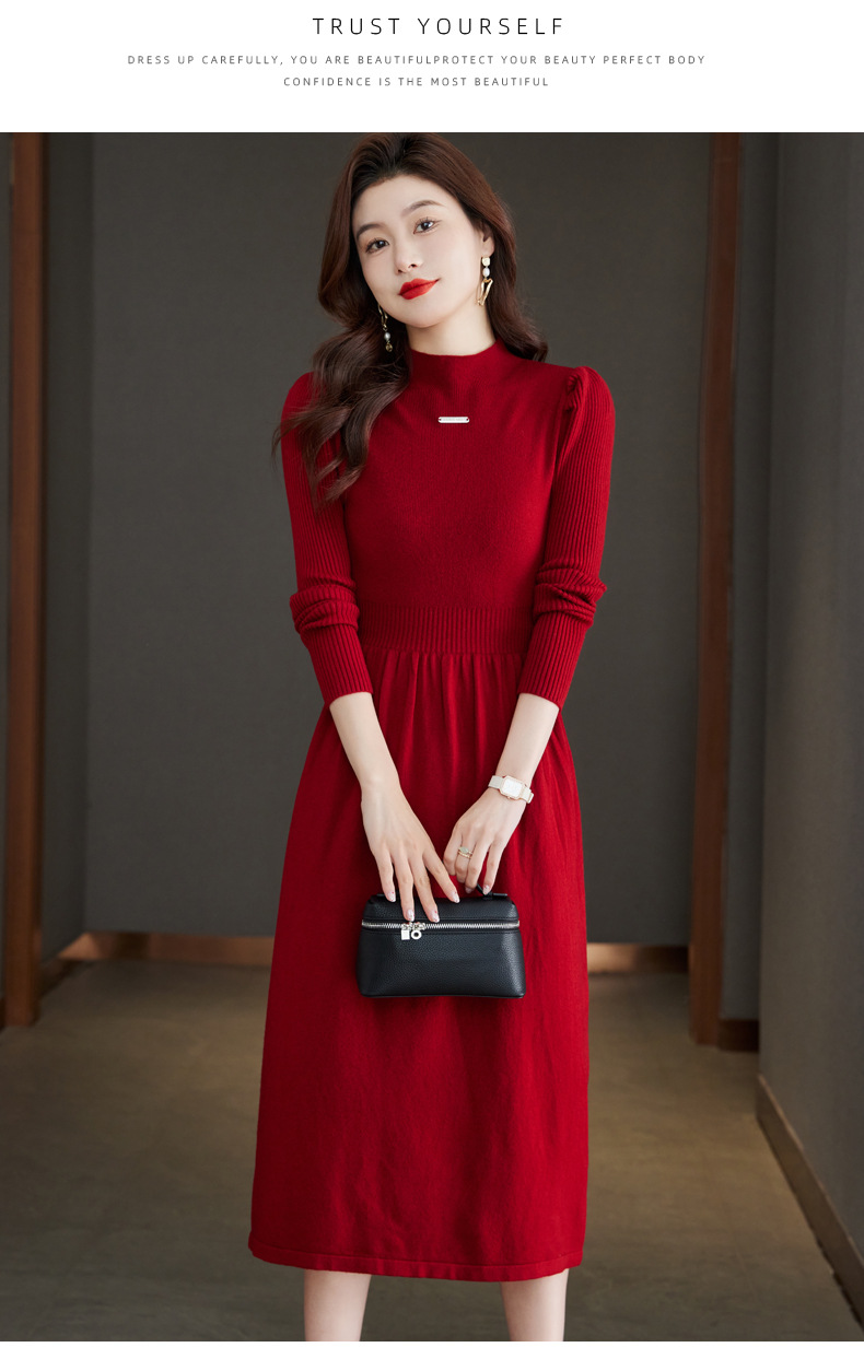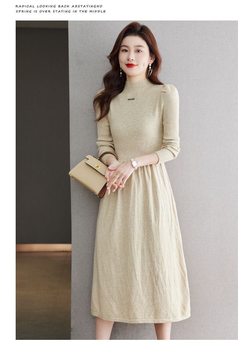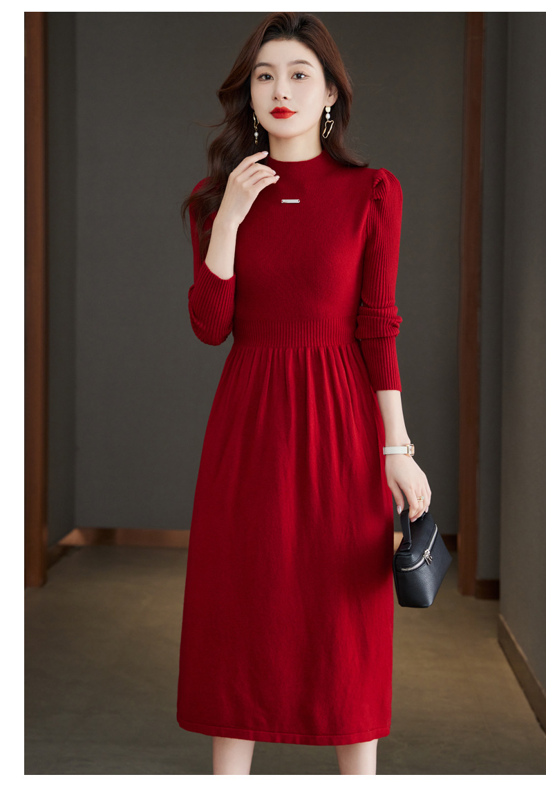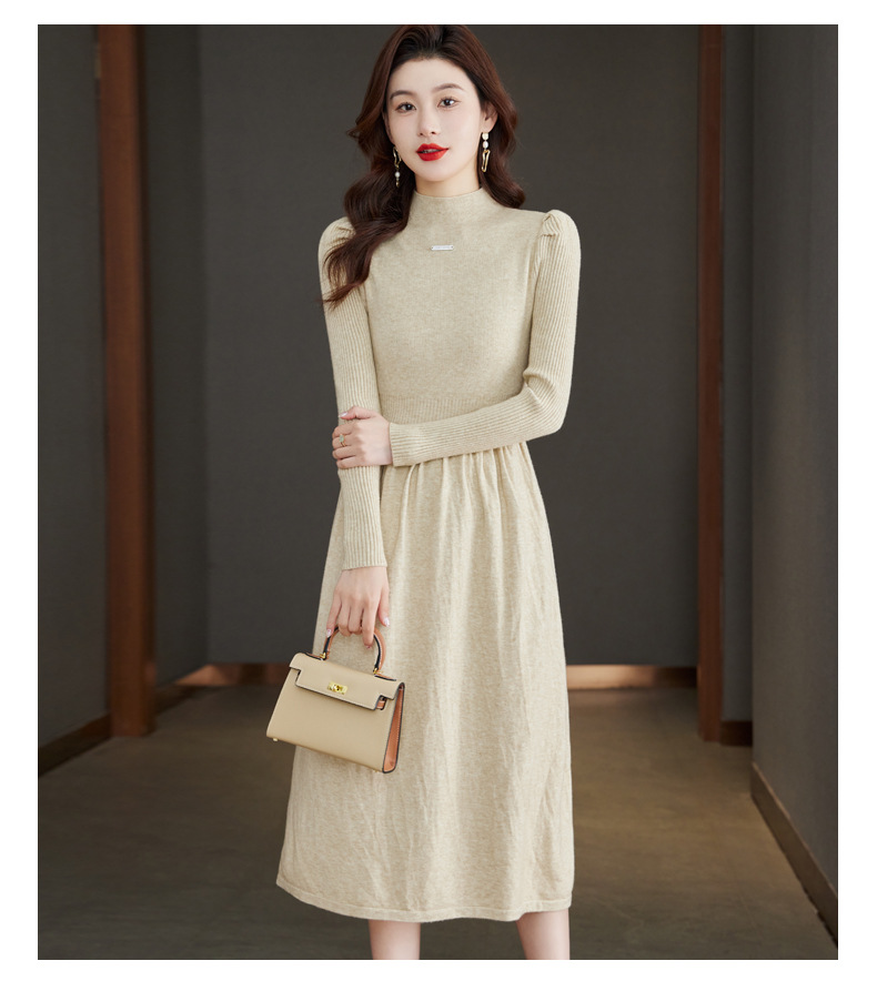 法式泡泡袖针织连衣裙,女秋冬新款小个子内搭收腰打底毛衣裙CC-QL-W8379