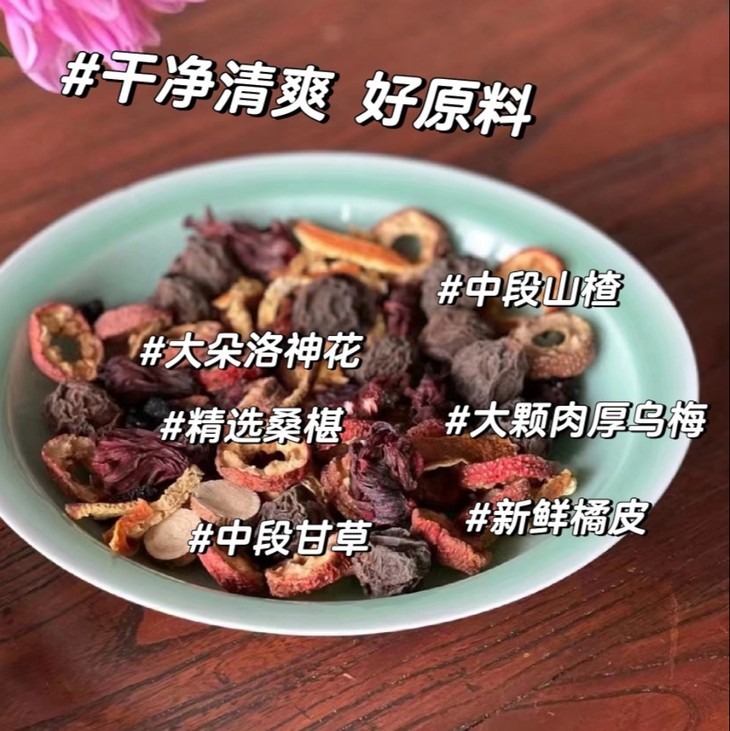 酸梅汤的甘草、山楂干只选用新鲜的中段肉厚的真乌梅、大朵的玫瑰茄洛神花、橘皮,高品质的没有任何添加剂的原材料