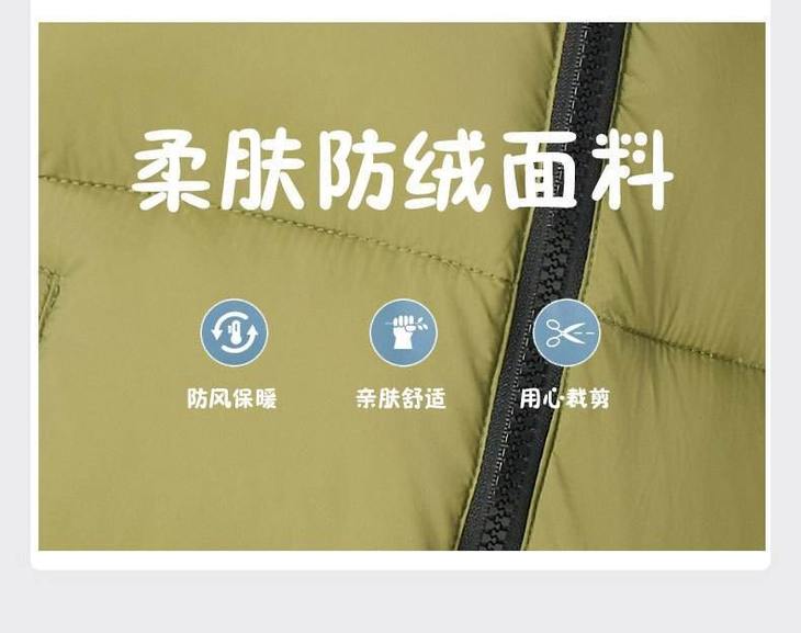 黑科技防钻绒 升级锁绒工艺!不跑绒不钻绒! 升级锁绒工艺,面料防钻性能拉满💯!肤感防钻绒面料, 搭配德国防绒针,羽绒根本钻不出~还做了分格锁绒,充绒均匀又保暖❄。 主打 0 压感✨!蓬松又温暖,用的是安心绒,锁温保暖效果好,面料还亲肤舒适,孩子穿着自在又暖和🥰~