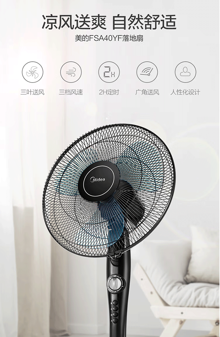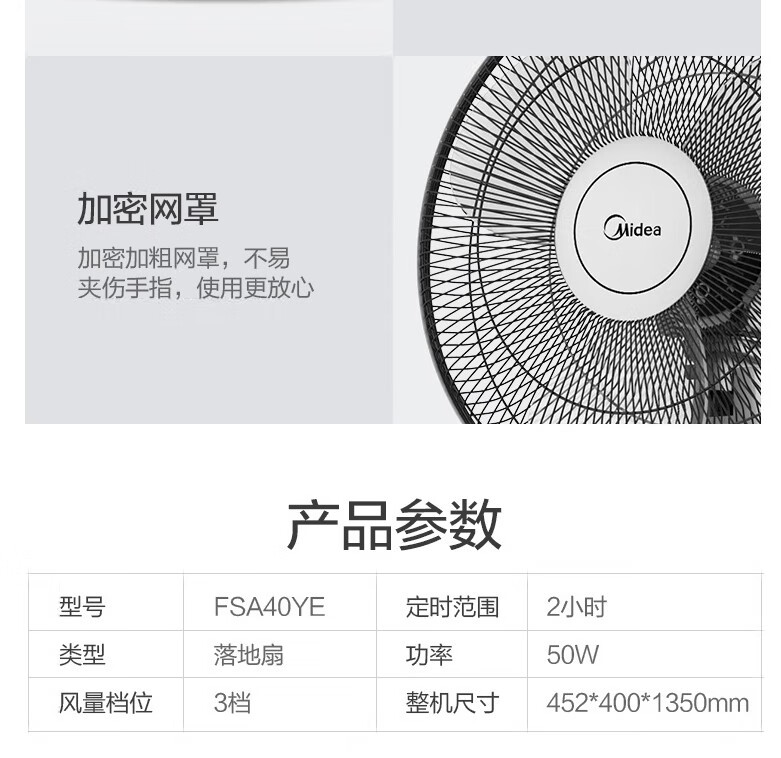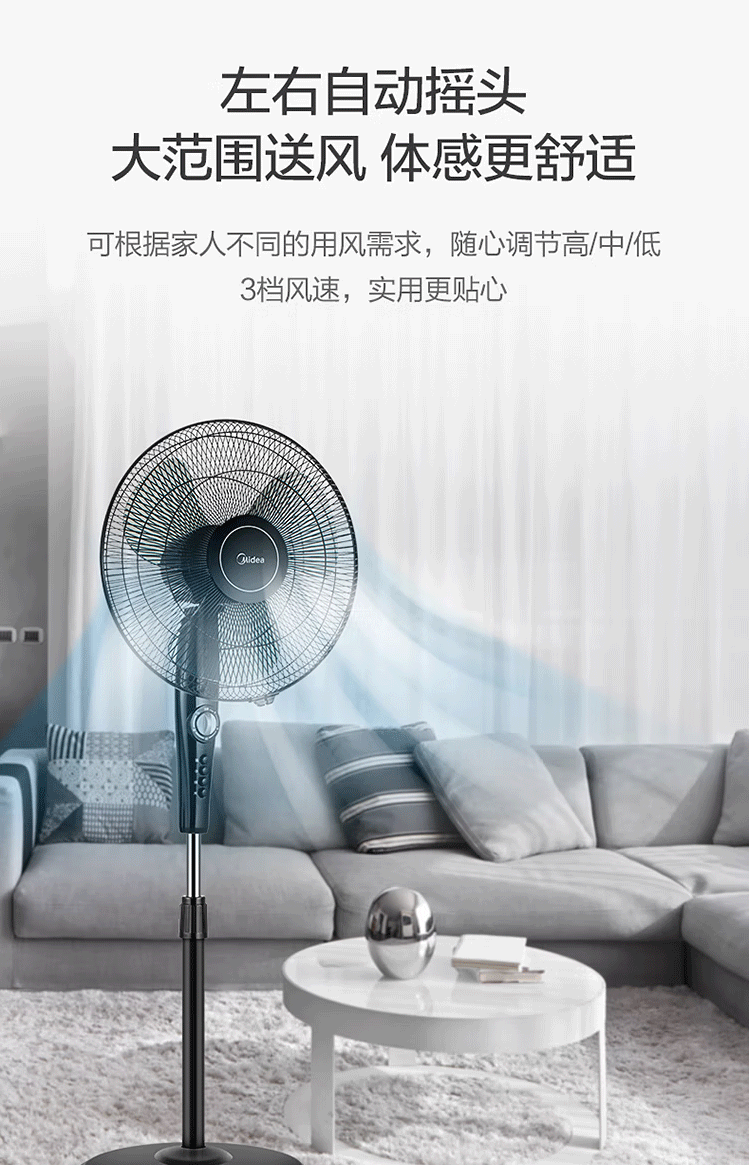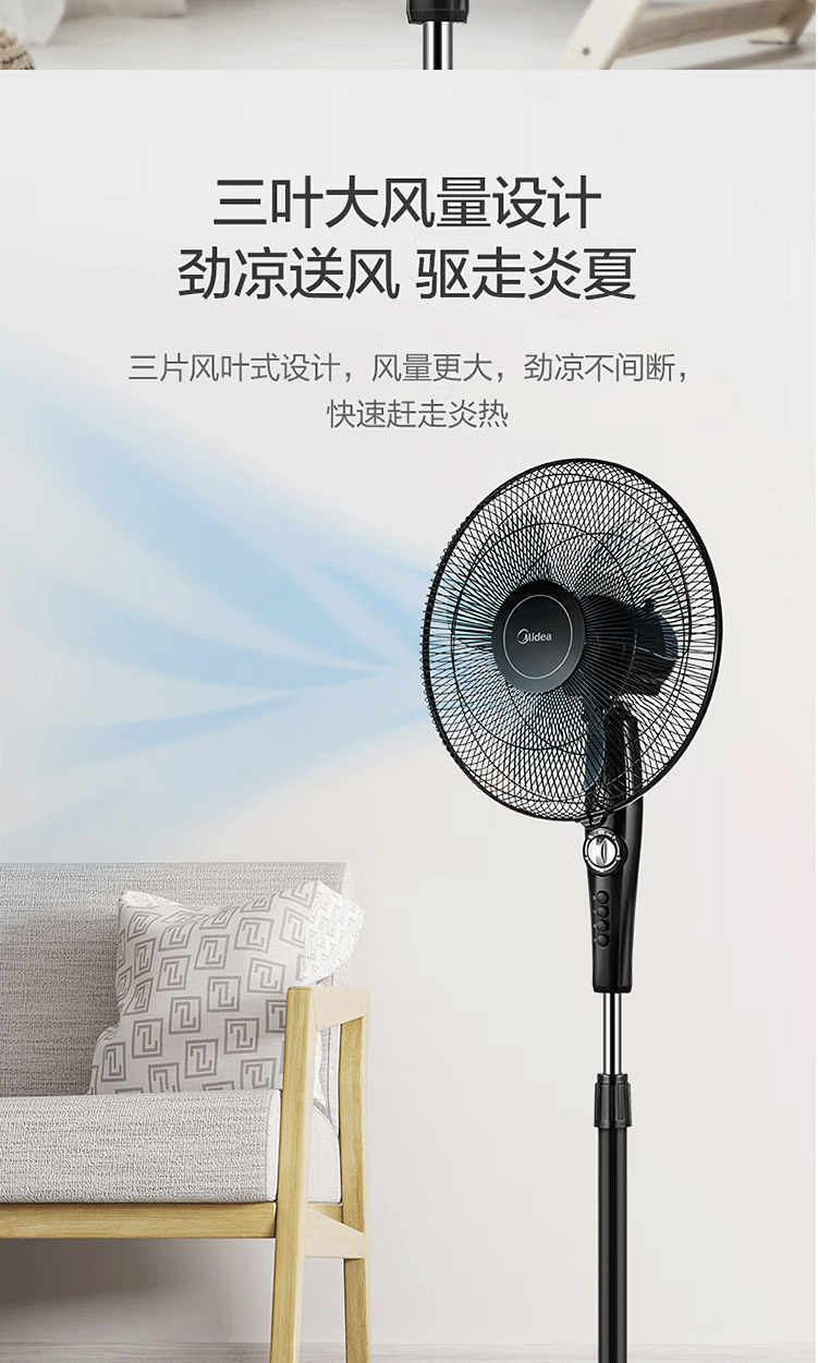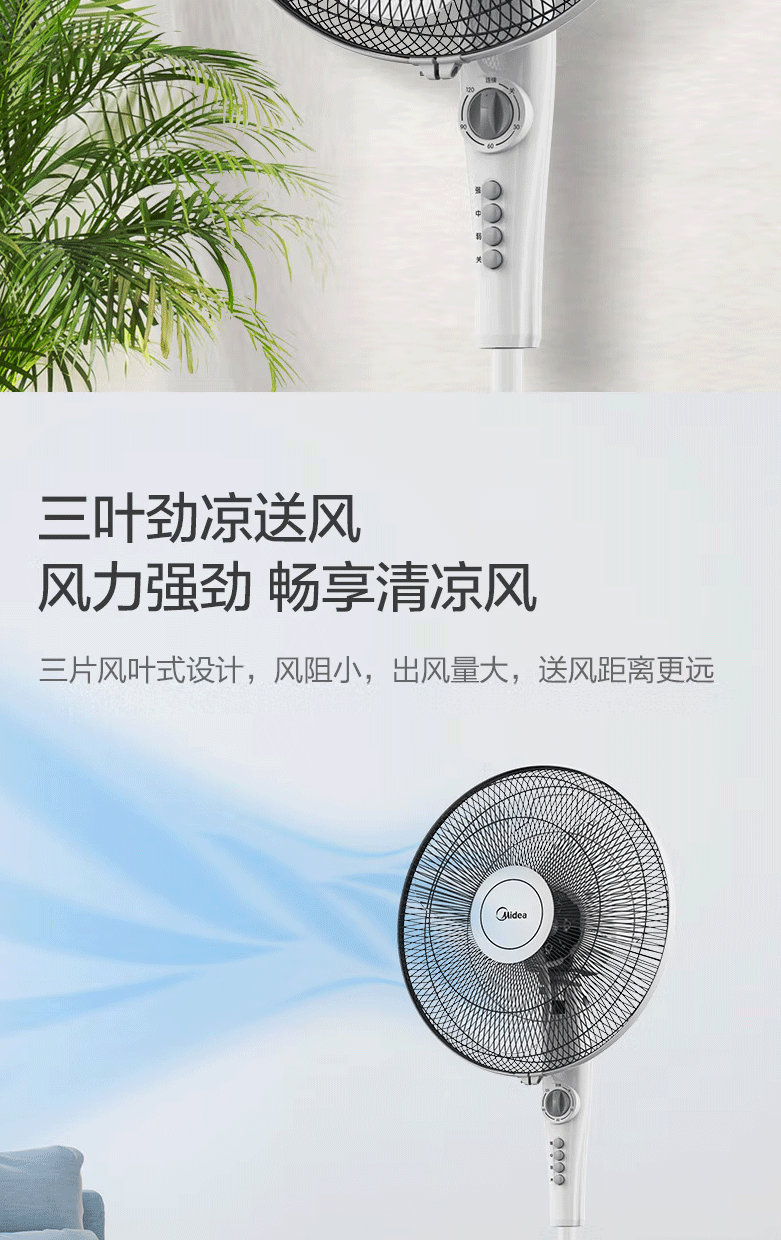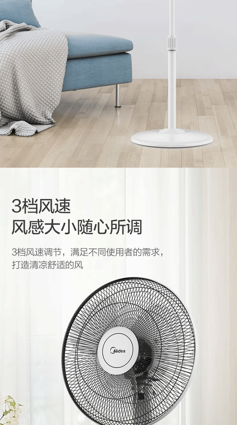 美的(Midea)16英寸电风扇 定频落地扇 家用三叶扇 大风量电风扇 立式按键旋钮 宿客厅 灰白色16寸 FSA40YE