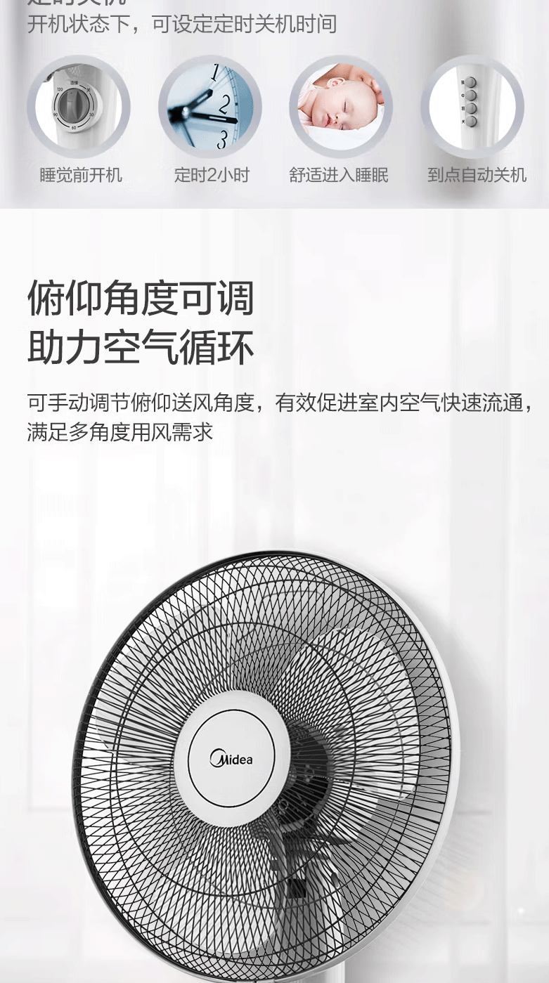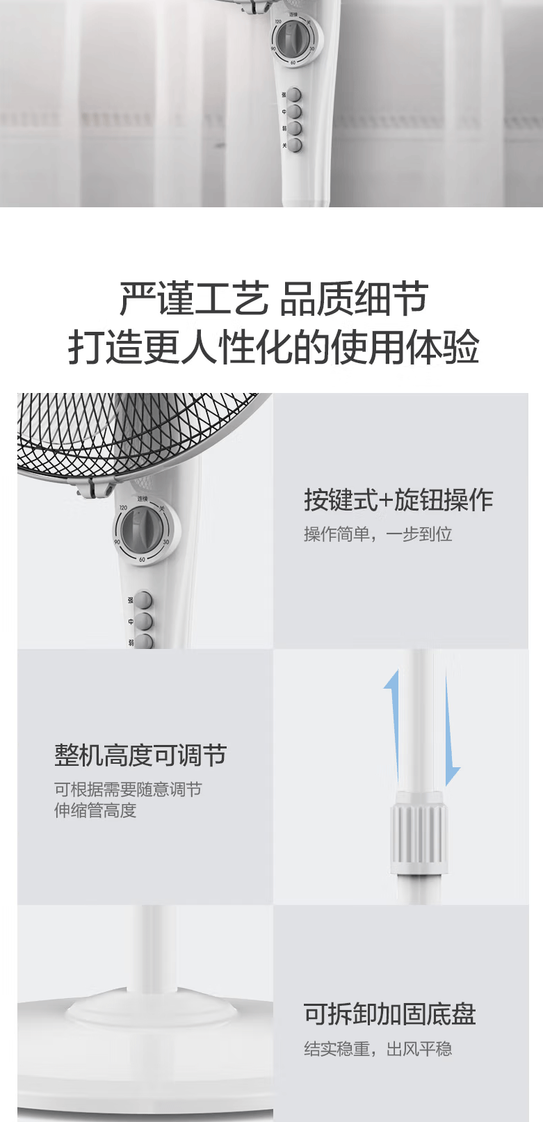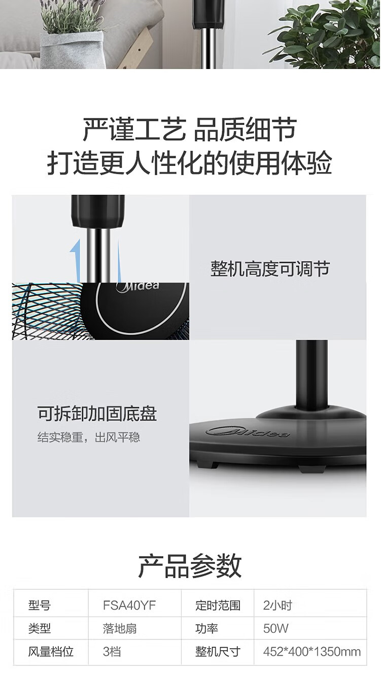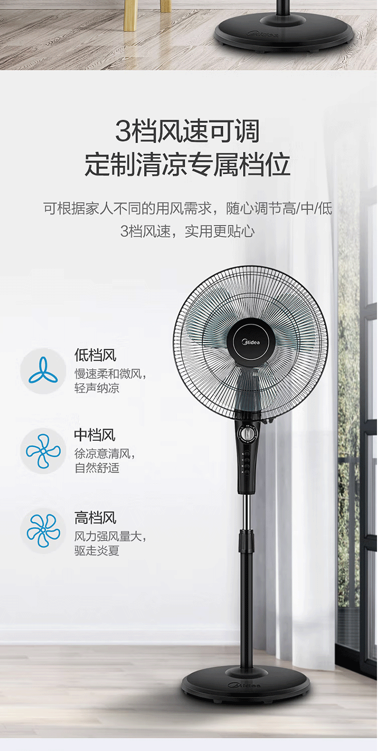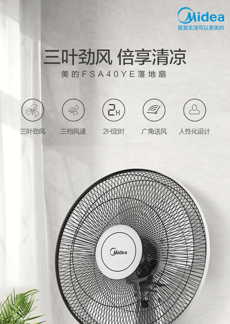 美的(Midea)16英寸电风扇 定频落地扇 家用三叶扇 大风量电风扇 立式按键旋钮 宿客厅 灰白色16寸 FSA40YE