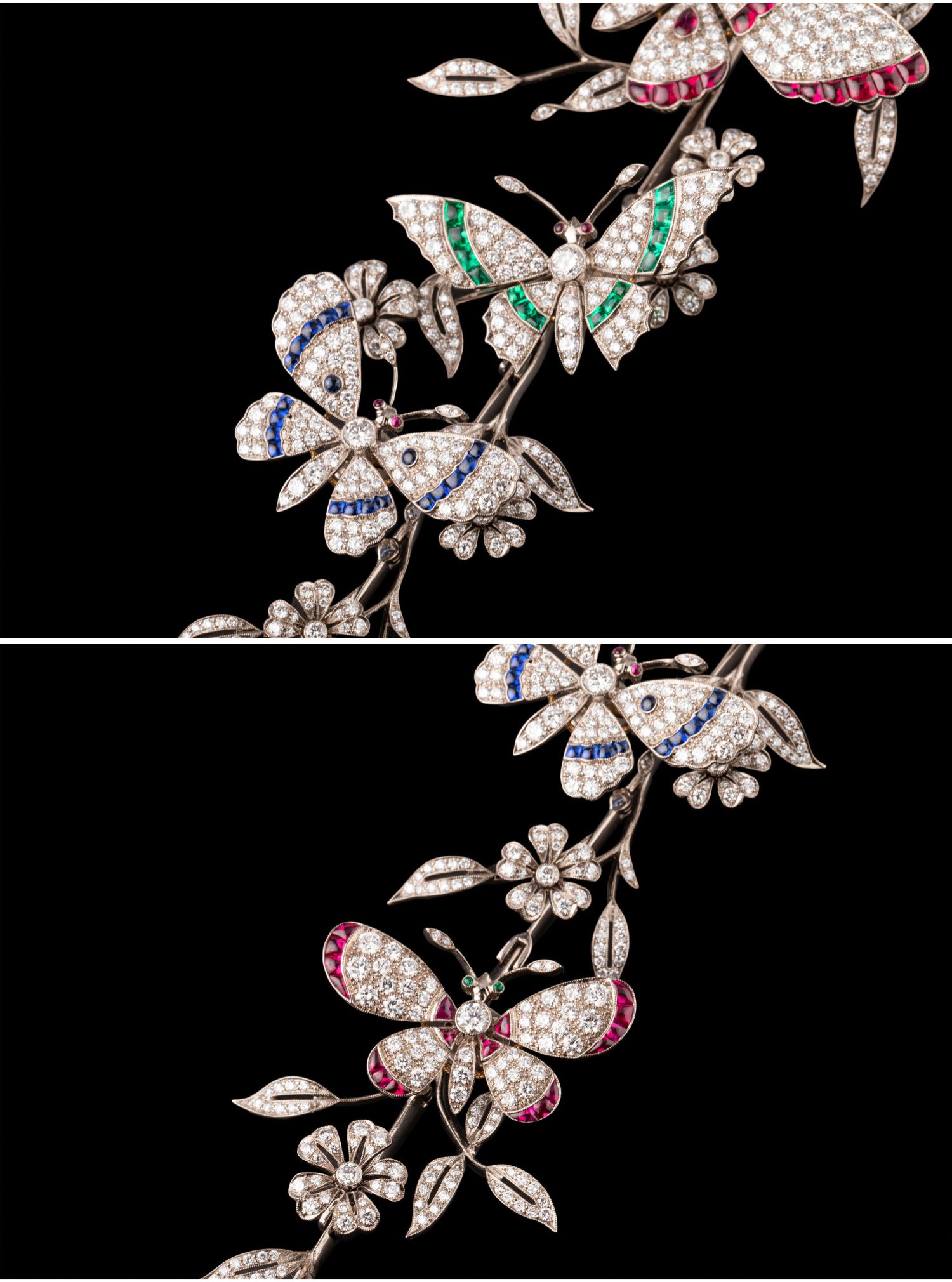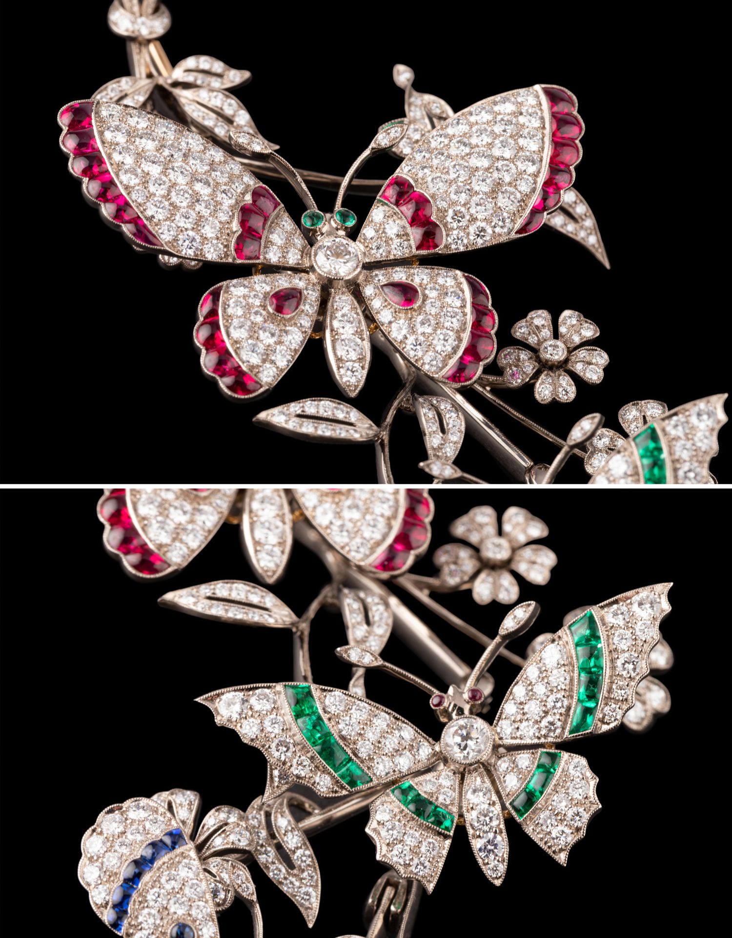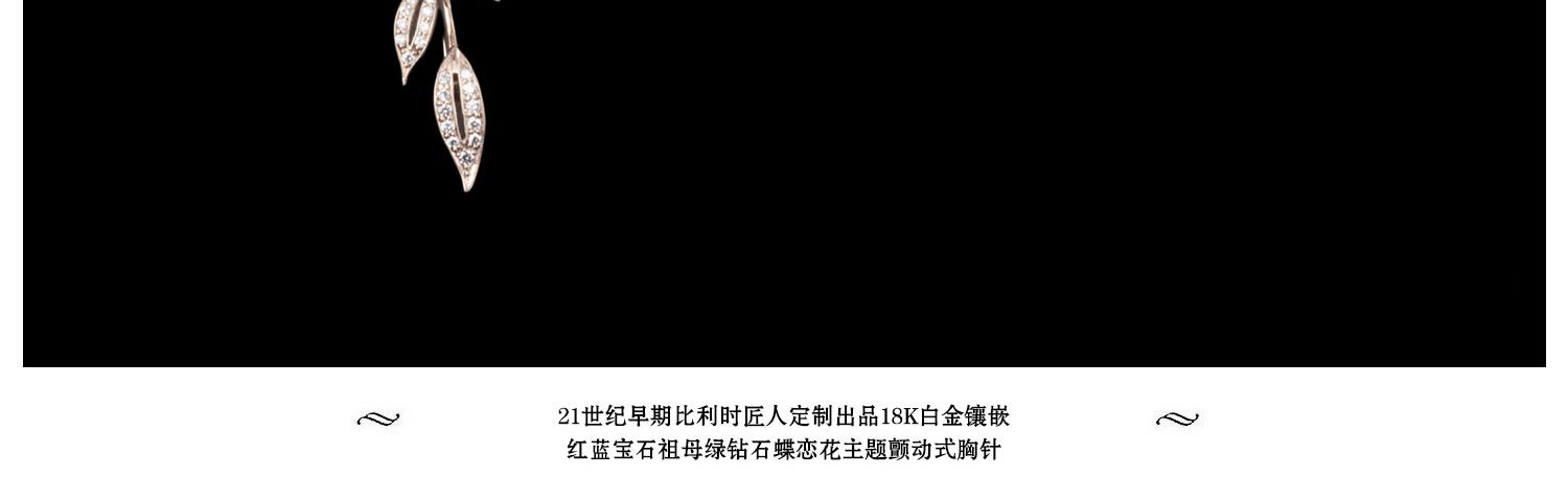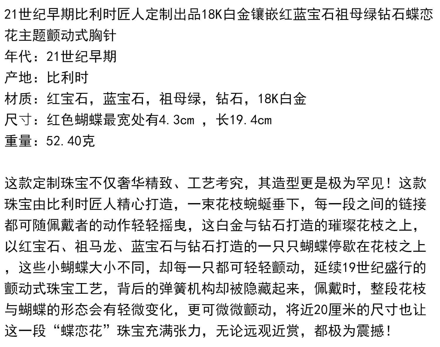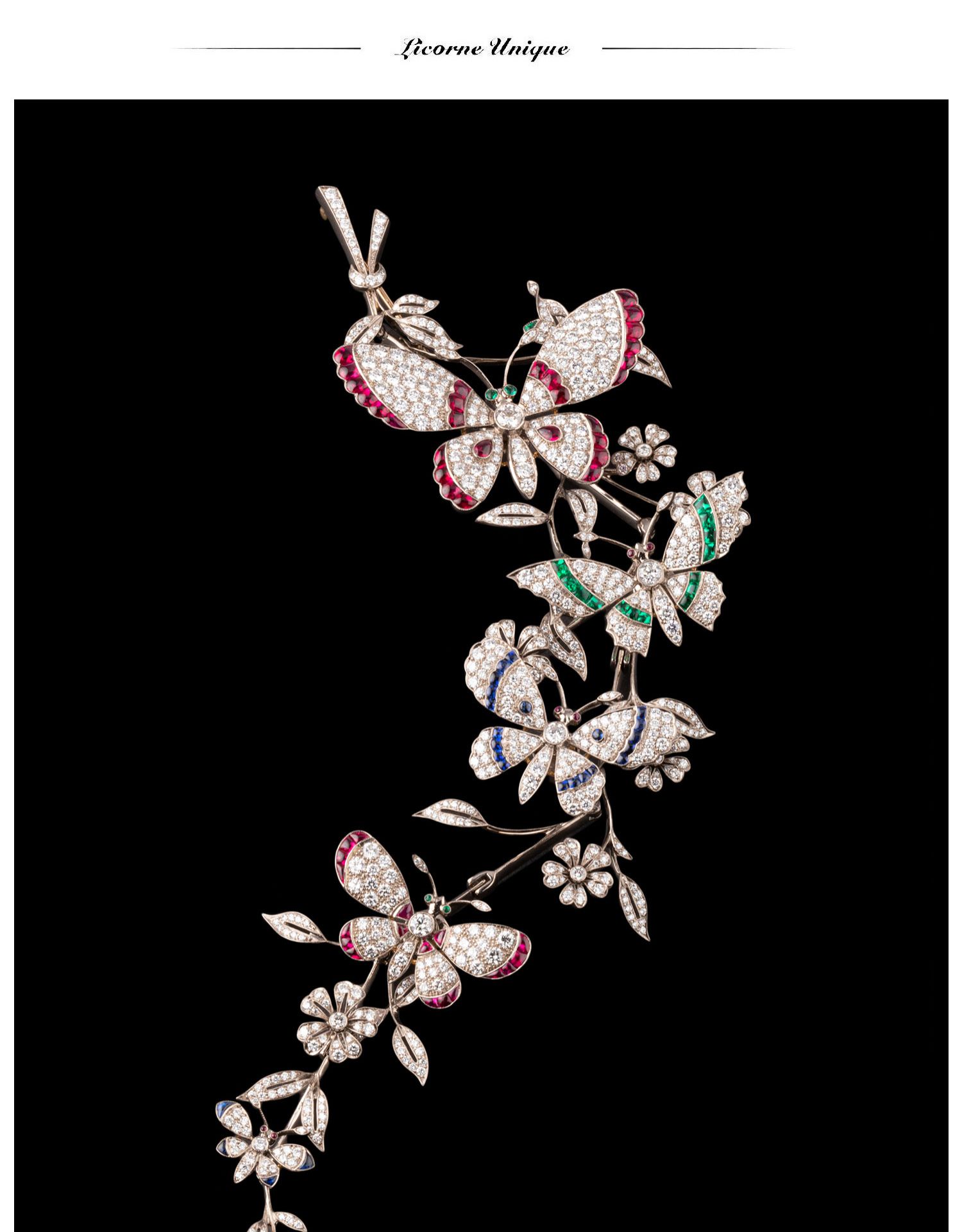 独角鹿西洋古董18K白金镶嵌红蓝宝石祖母绿钻石蝶恋花颤动式胸针