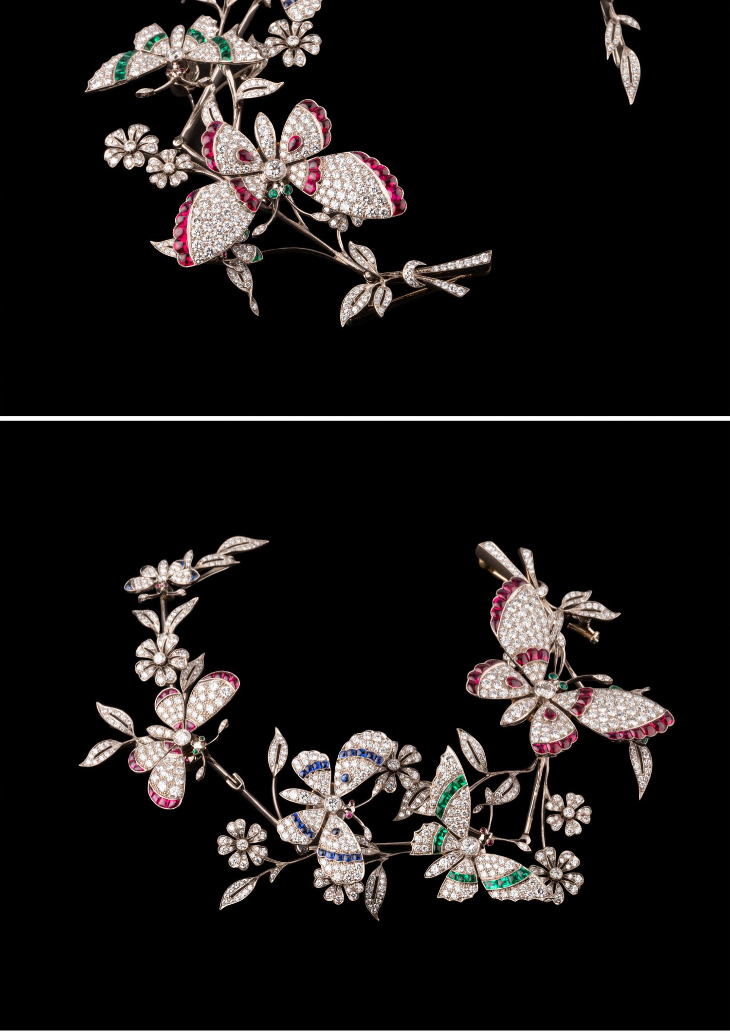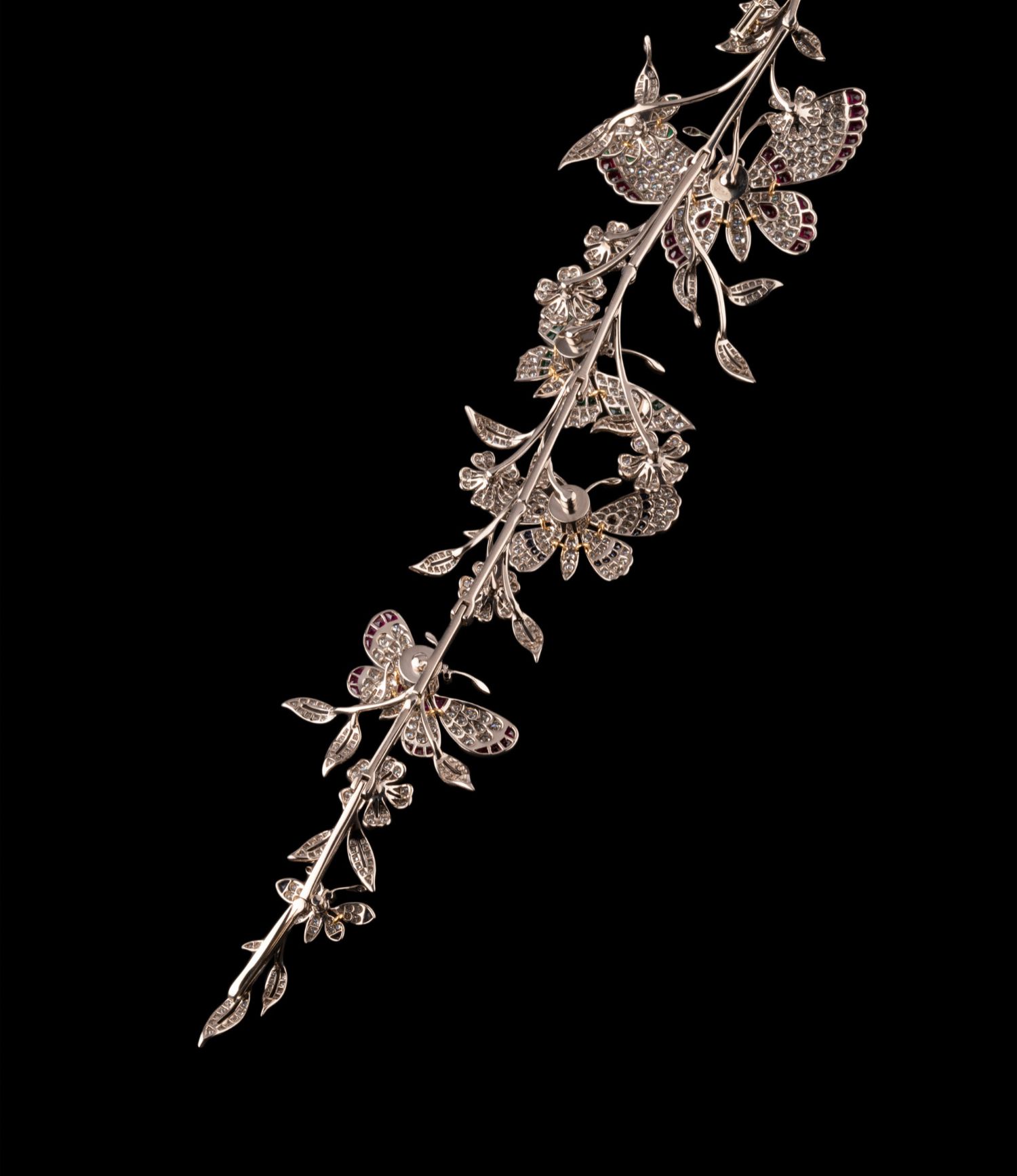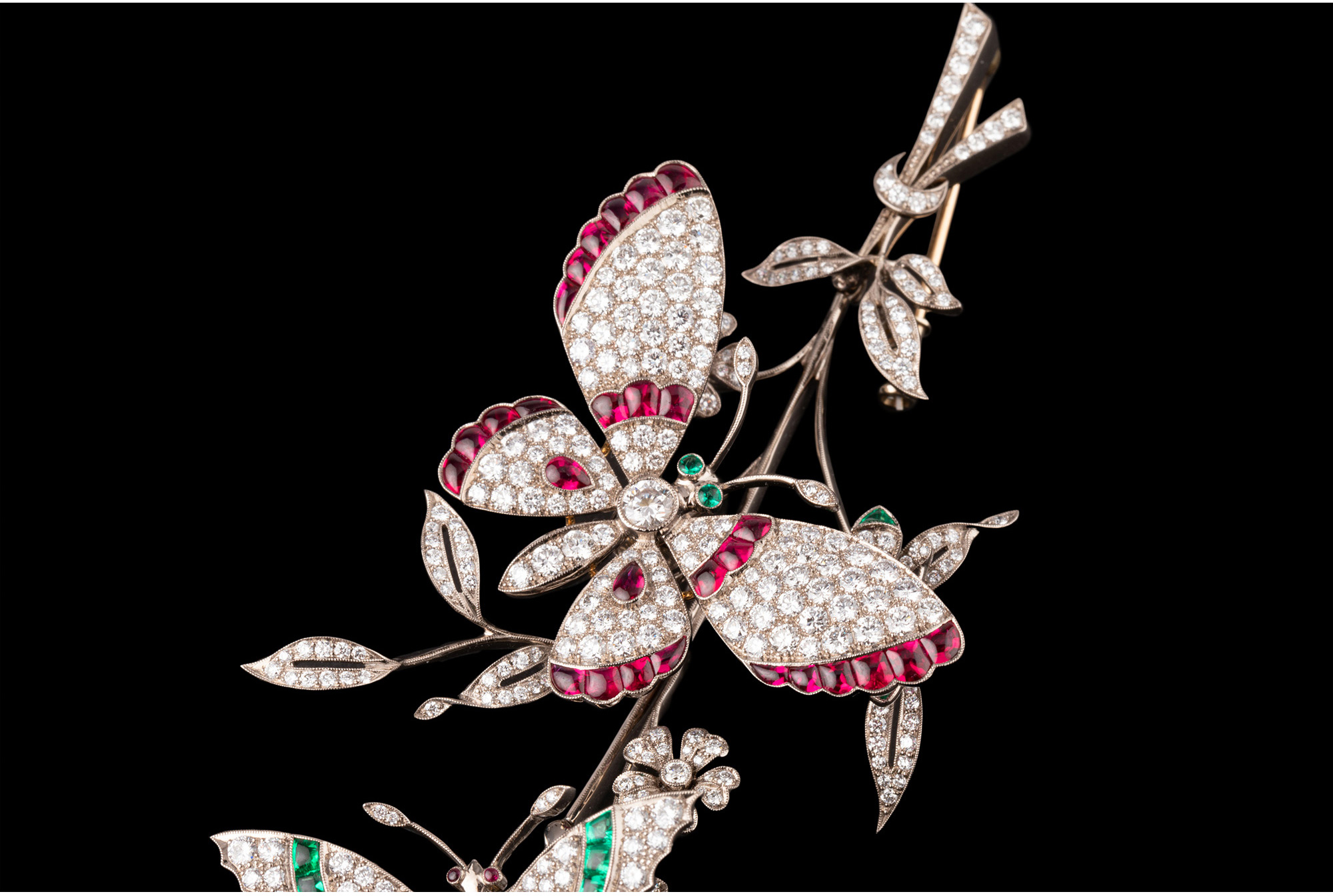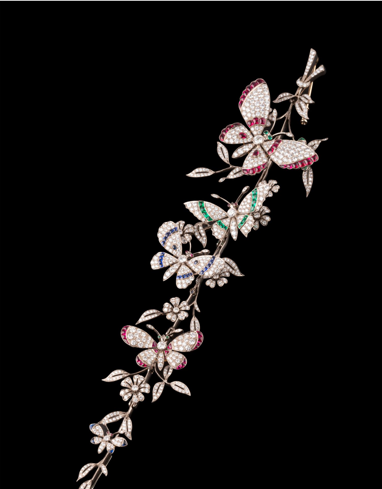独角鹿西洋古董18K白金镶嵌红蓝宝石祖母绿钻石蝶恋花颤动式胸针