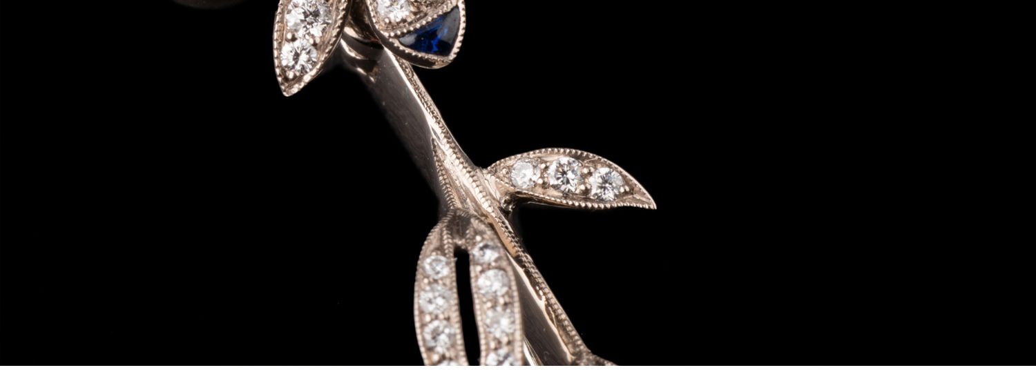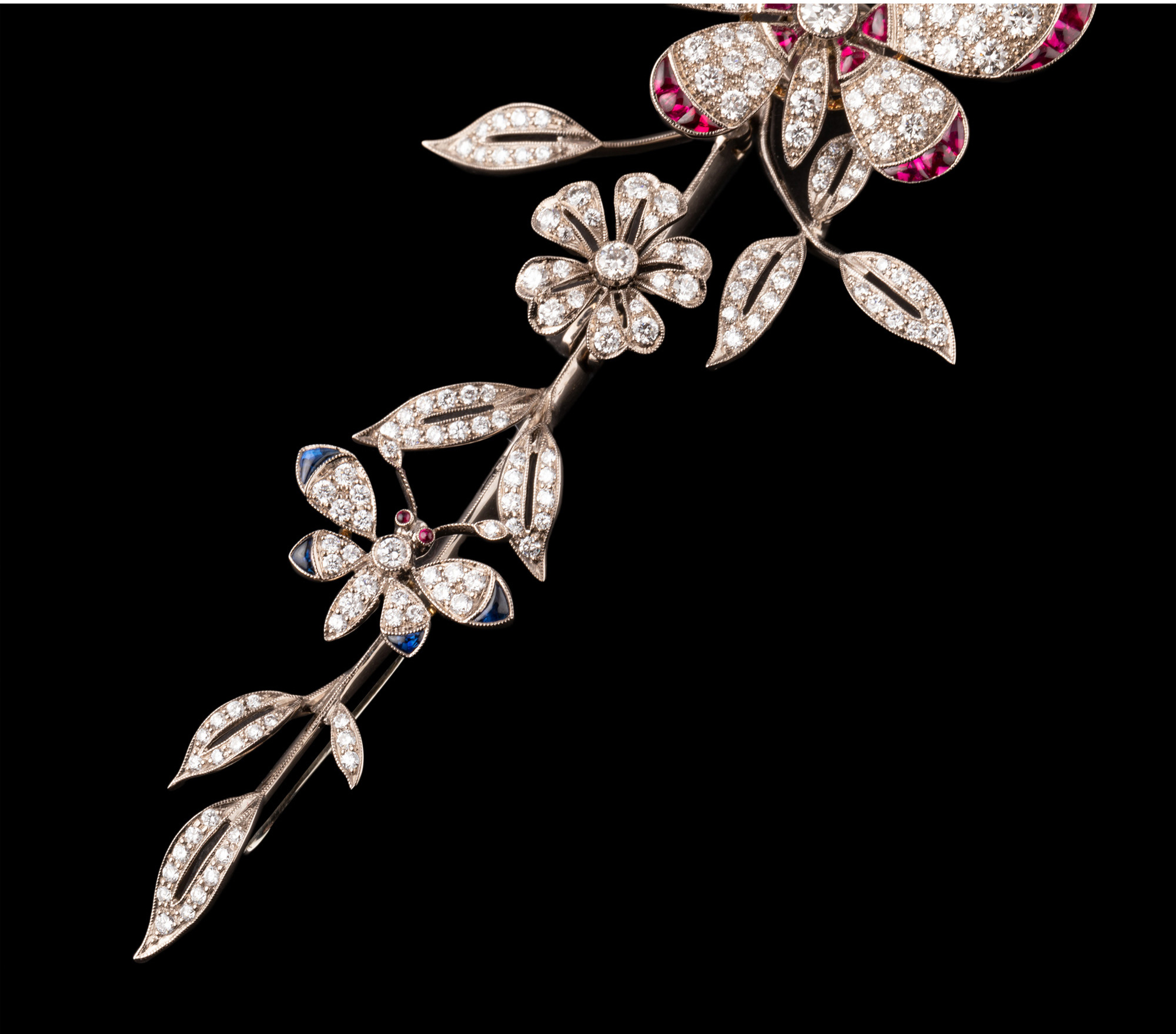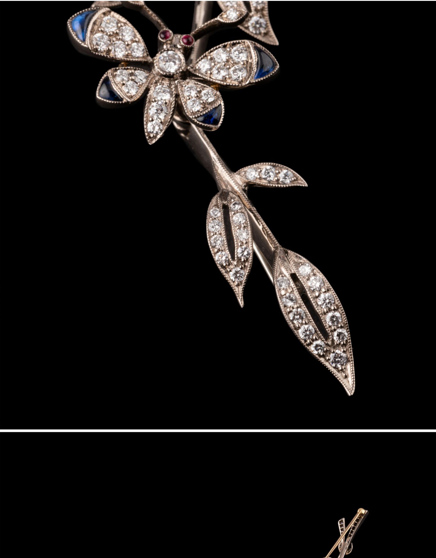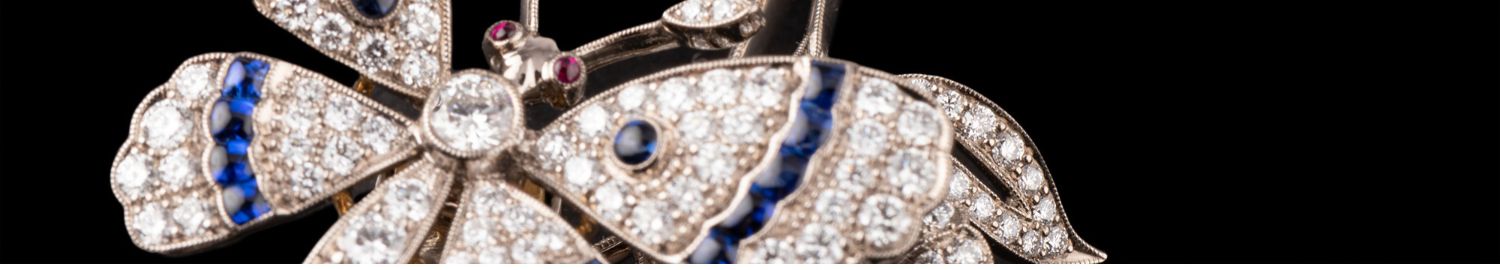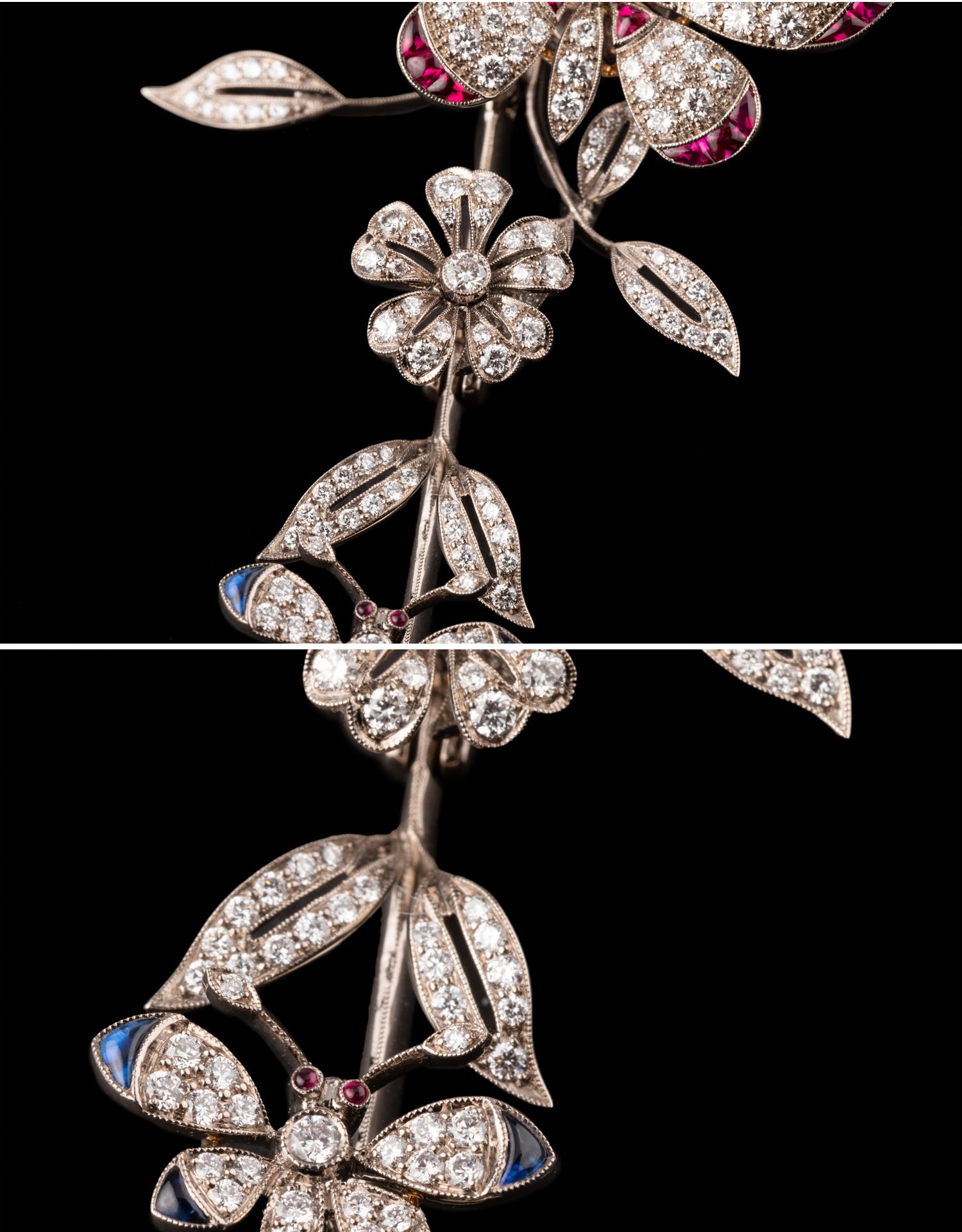 独角鹿西洋古董18K白金镶嵌红蓝宝石祖母绿钻石蝶恋花颤动式胸针