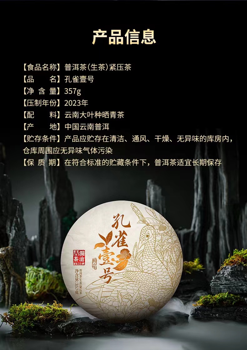 孔雀壹号,精选2010-2020年间积存的布朗山核心产地大树茶、古树茶为原料,新老料搭配,传统手工技艺,融入制茶匠人57年制茶工艺精制而成。茶与时光的结合,造就了孔雀壹号的绝好品质。