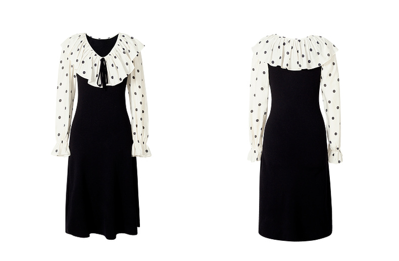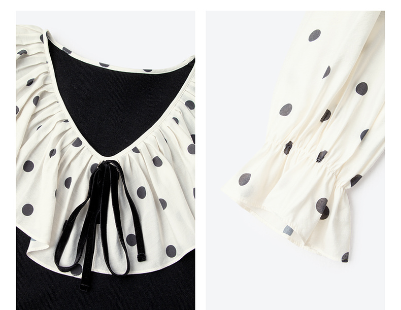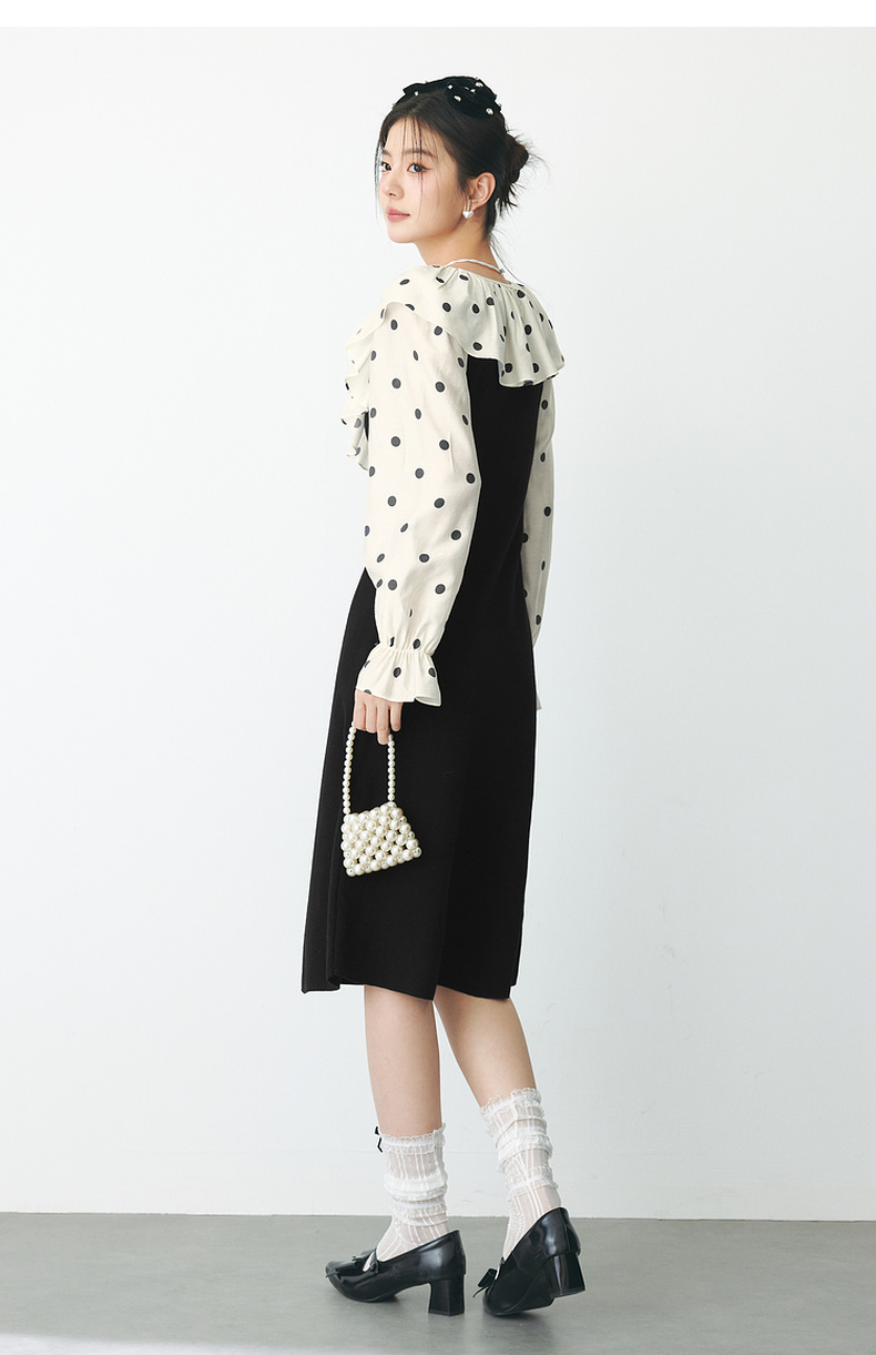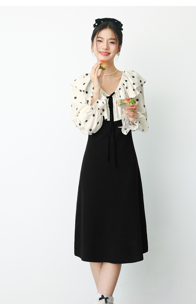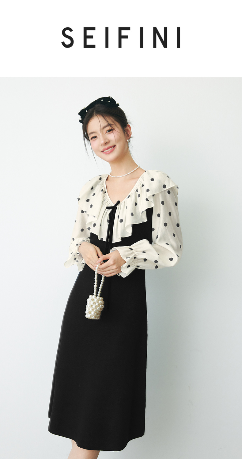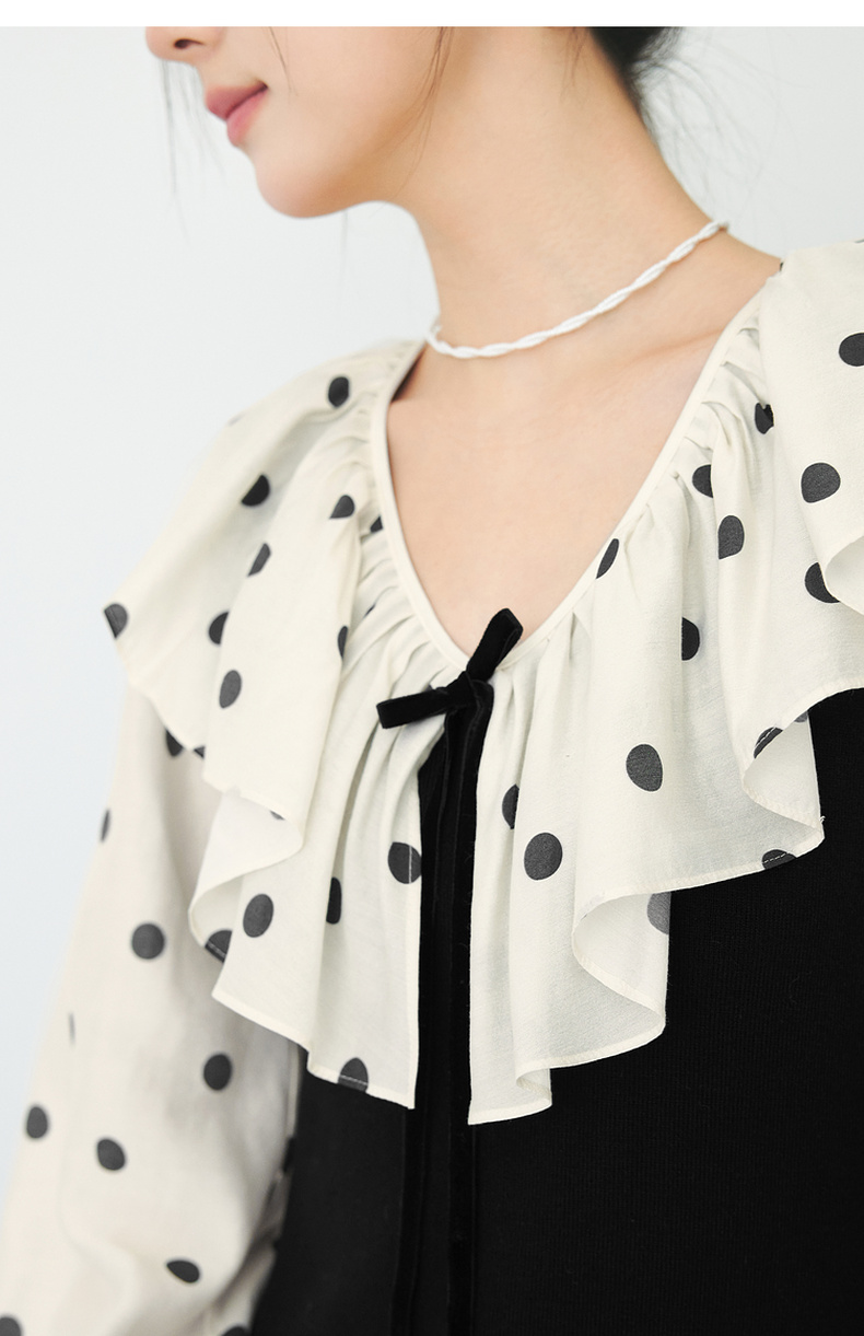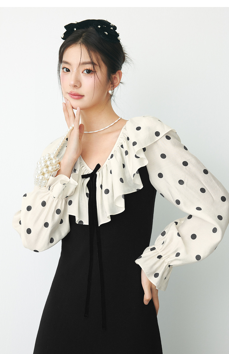 【严选】诗凡黎春领子拼接植绒波点法式浪漫荷叶领公主泡泡袖连衣裙SF1290211