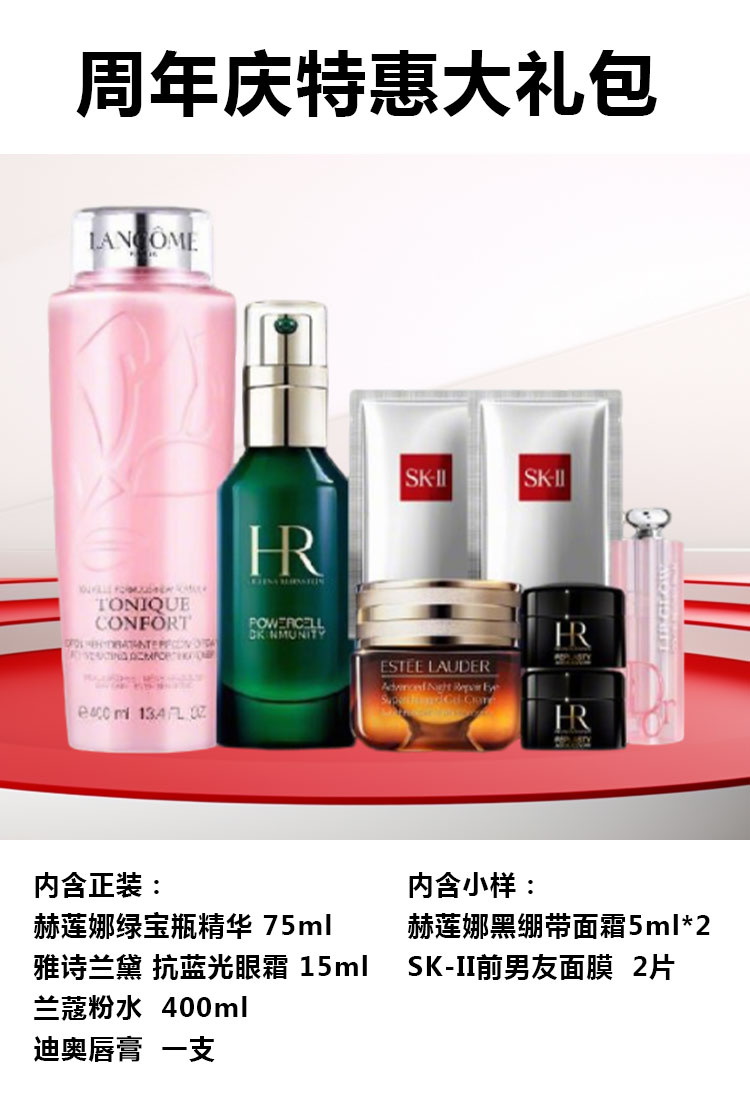 【周年庆特惠大礼包】绿宝瓶精华75ml,抗蓝光眼霜15ml,兰蔻粉水400ml,迪奥唇膏正装一支,黑绷带面霜小样5ml*2 ,前男友面膜2片