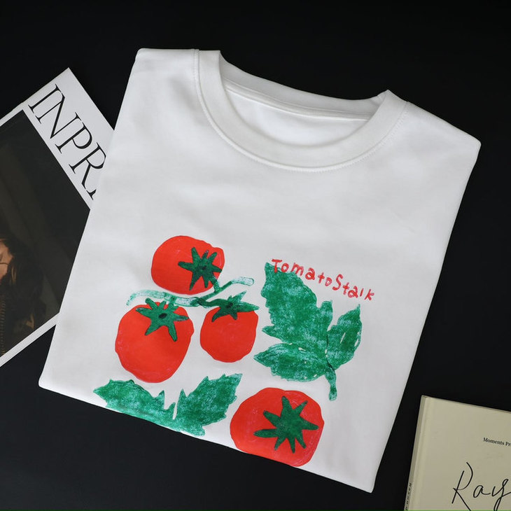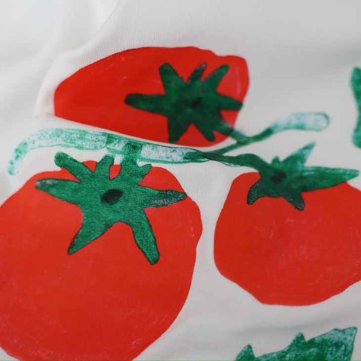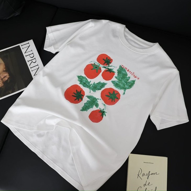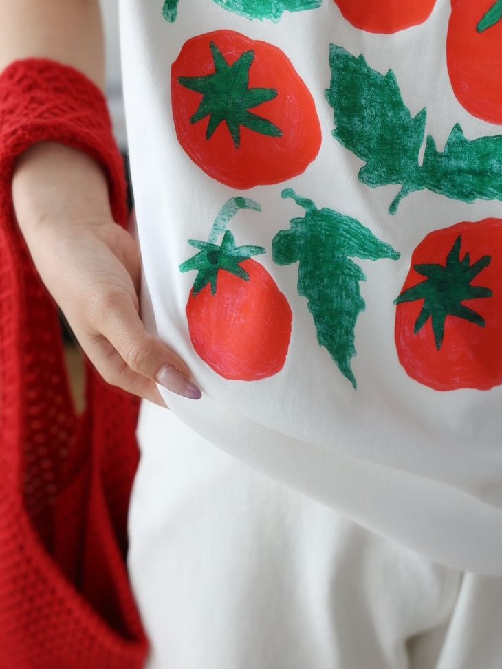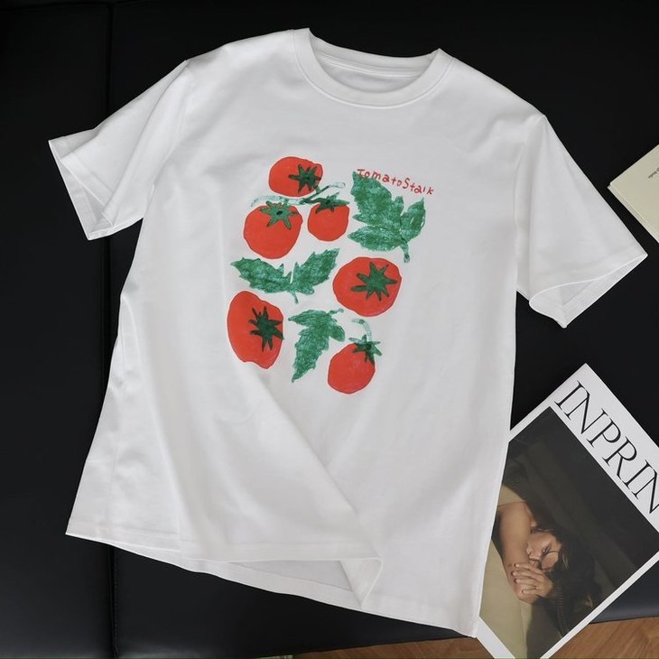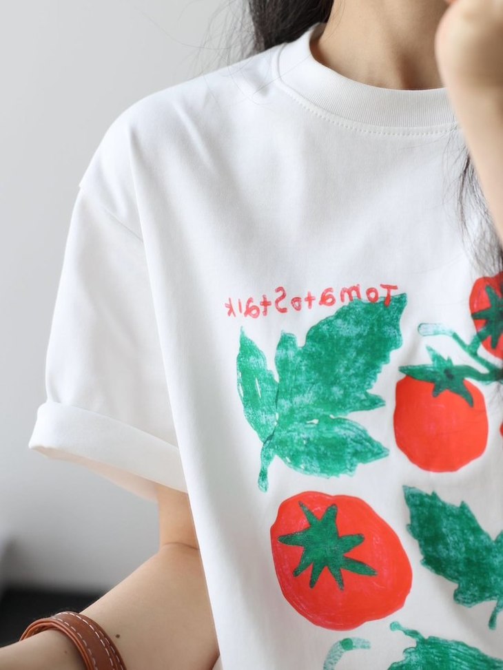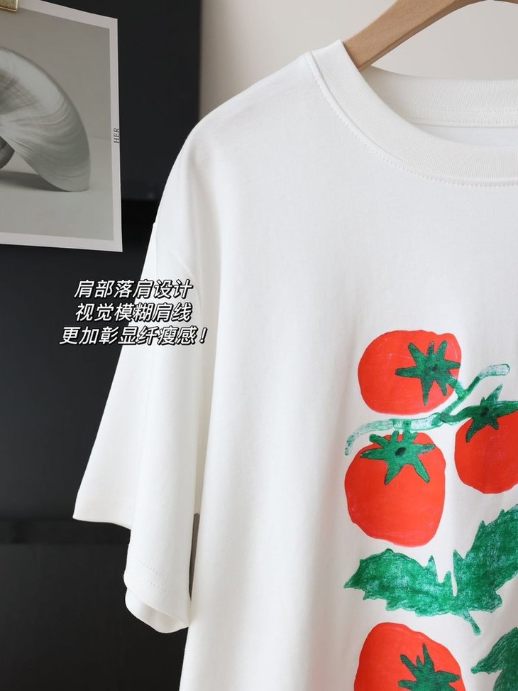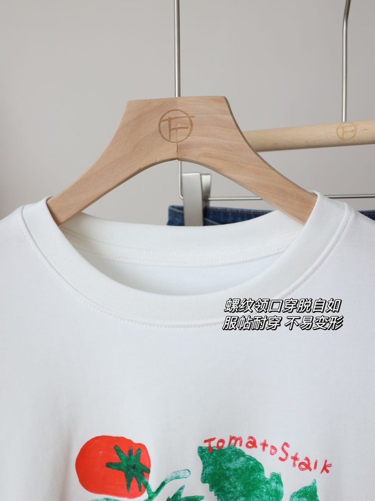 胸前番茄印花图案 颜色鲜艳亮眼,打破单调! 一下子唤醒记忆中的蔬果园~ 悠然且闲适 压烫胶印工艺,番茄印花清晰生动 柔软细腻,上身不磨皮肤 随意机洗!不用担心开裂掉落 很耐看!也很耐穿!