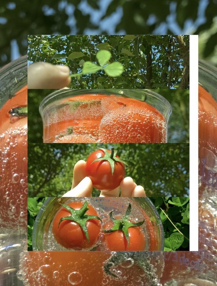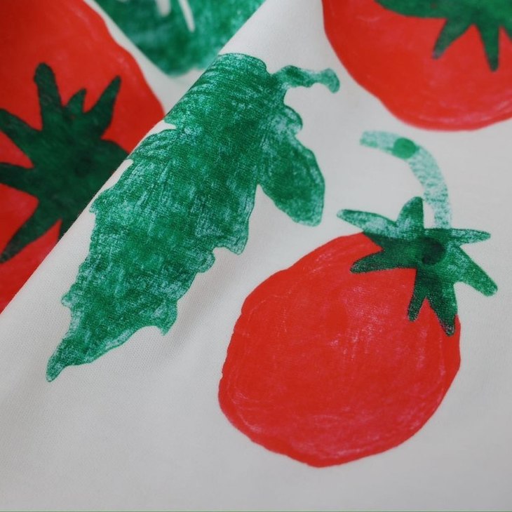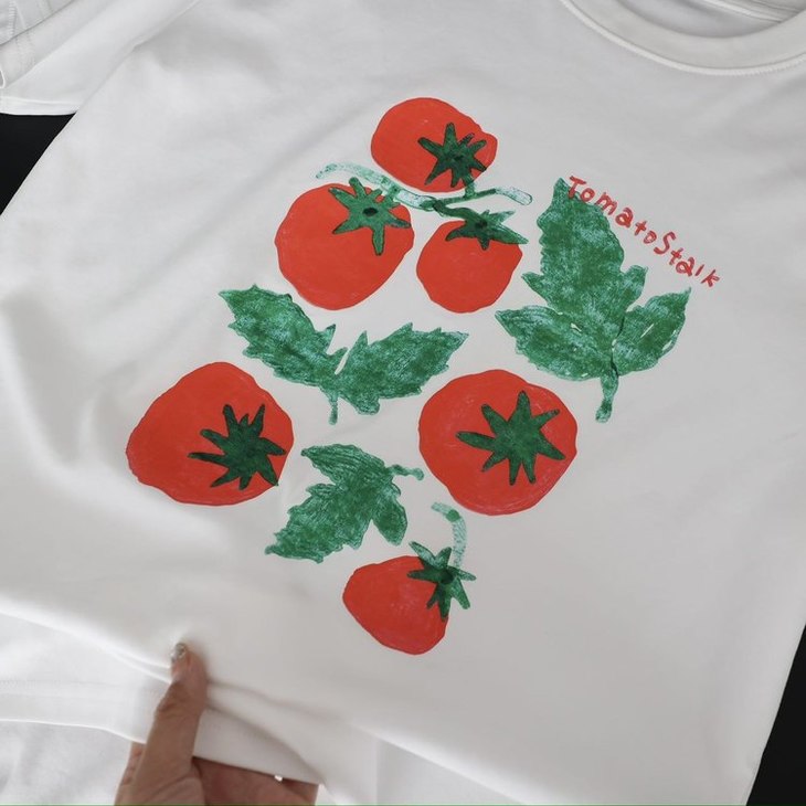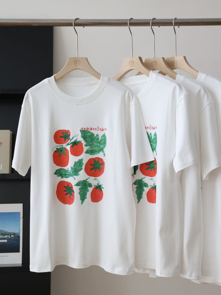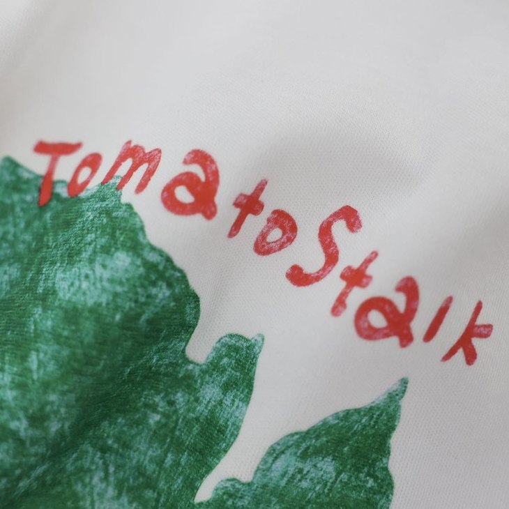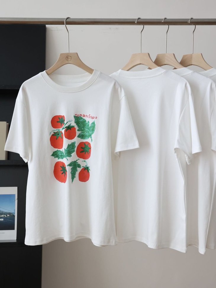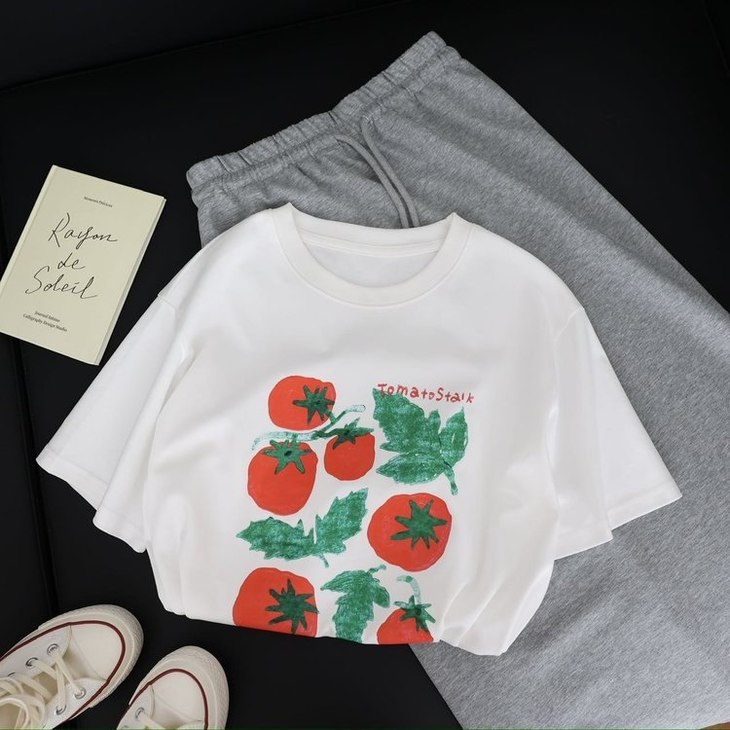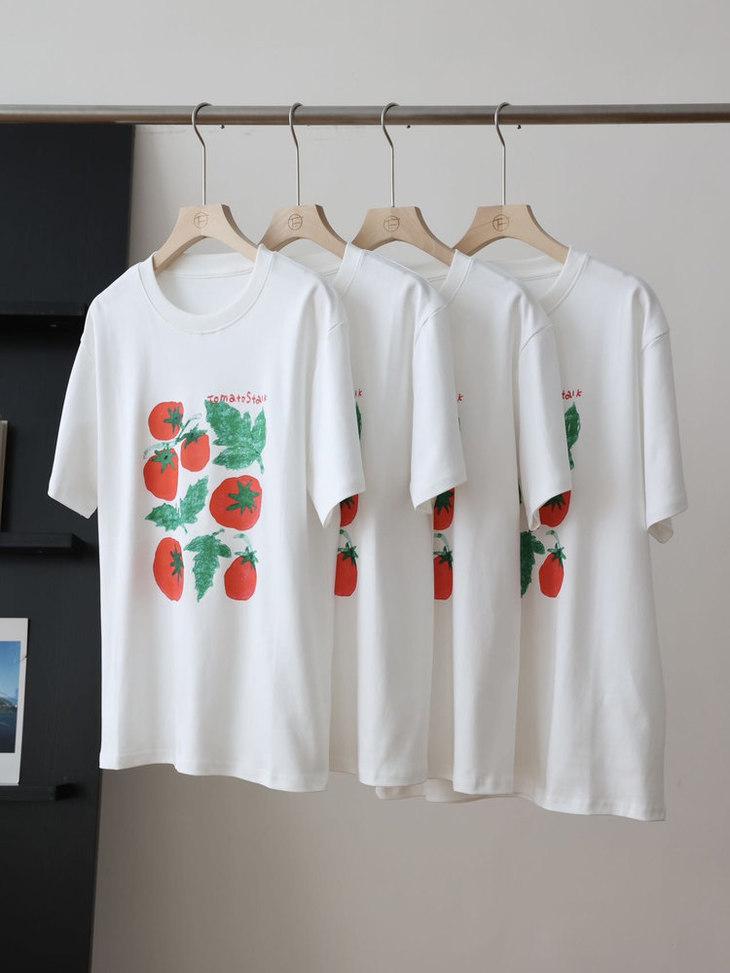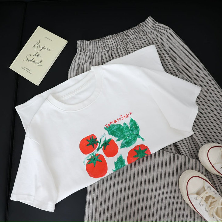 胸前番茄印花图案 颜色鲜艳亮眼,打破单调! 一下子唤醒记忆中的蔬果园~ 悠然且闲适 压烫胶印工艺,番茄印花清晰生动 柔软细腻,上身不磨皮肤 随意机洗!不用担心开裂掉落 很耐看!也很耐穿!