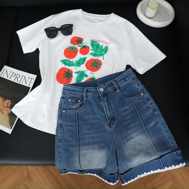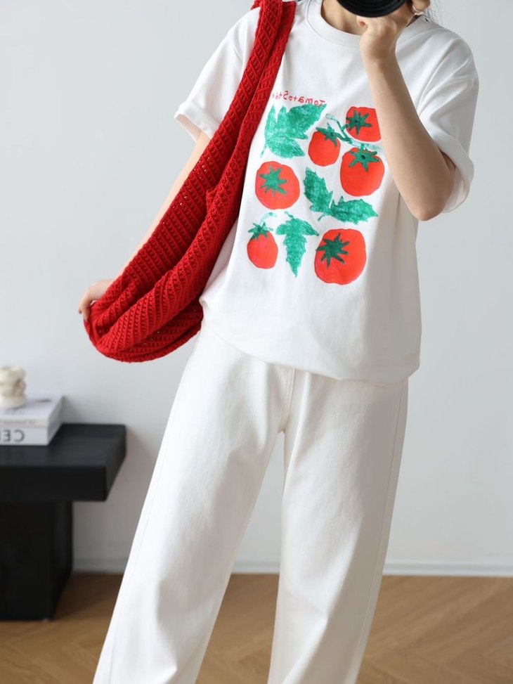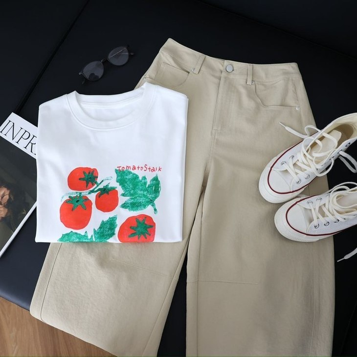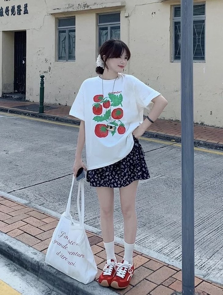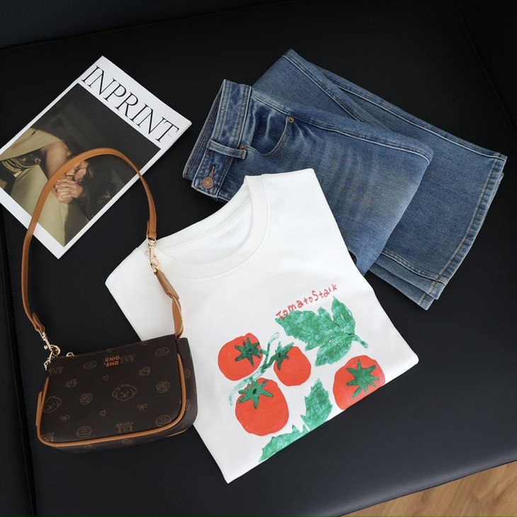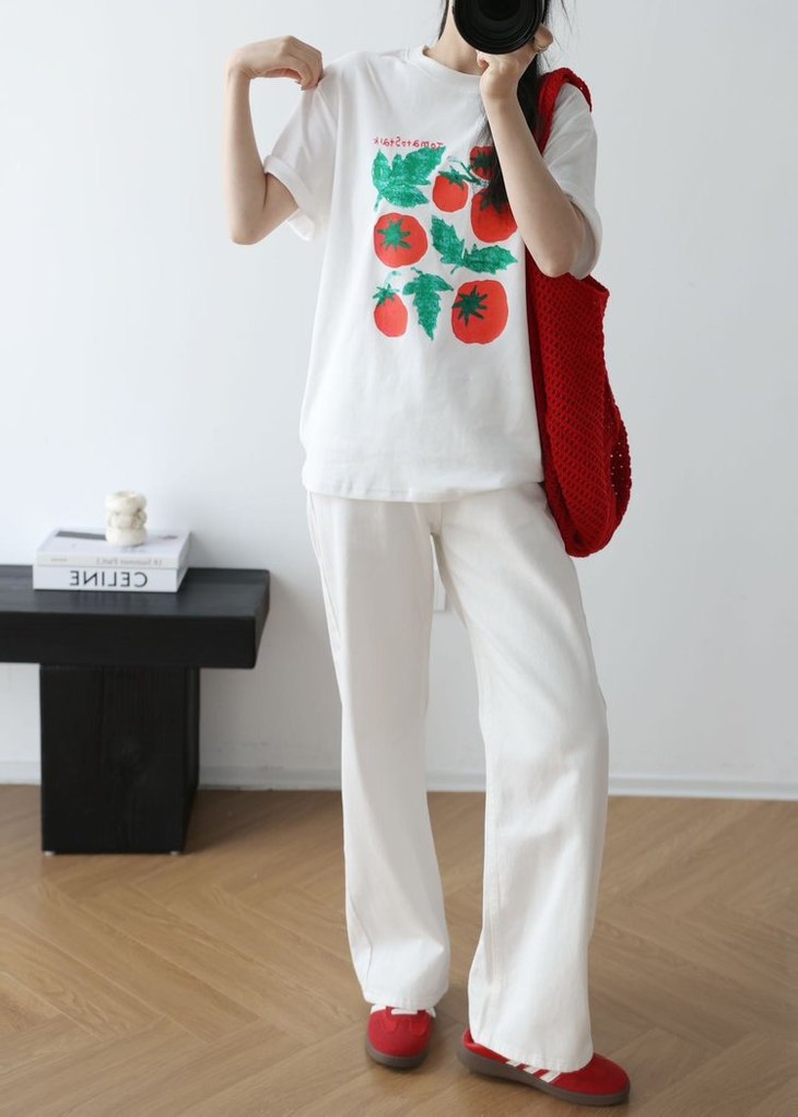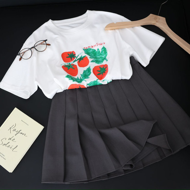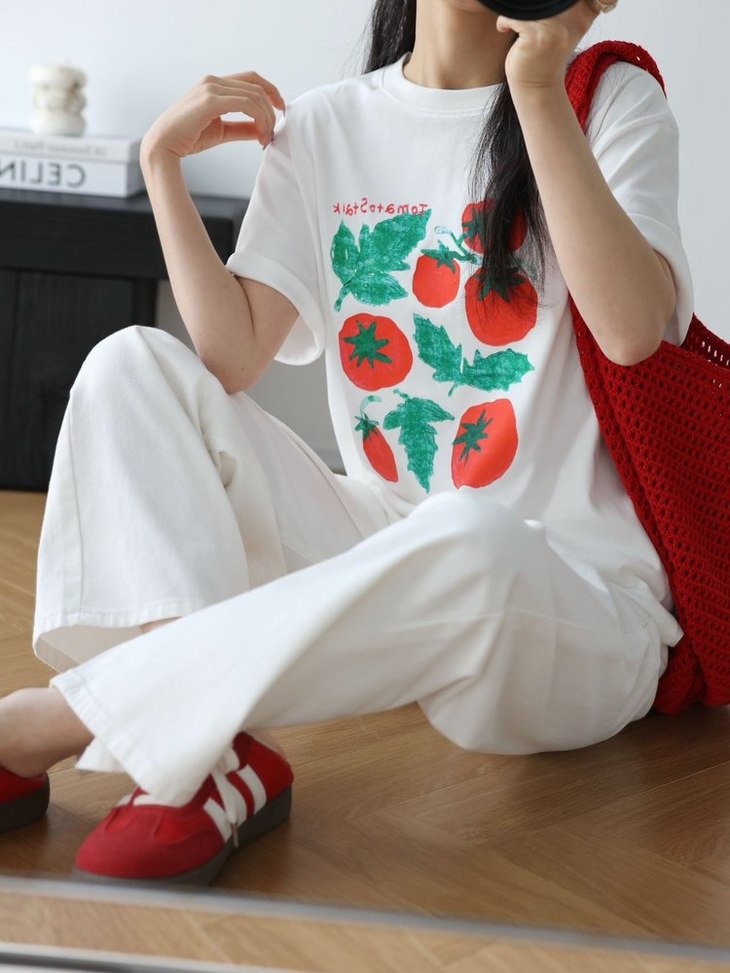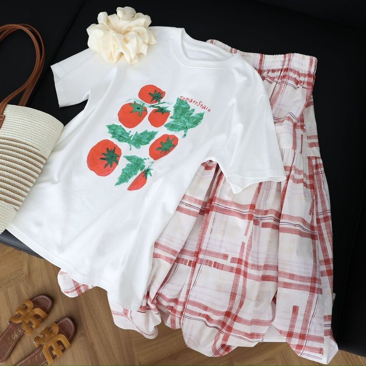 西红柿印花可可爱爱 白底衬托,更加浓郁鲜活 无论是搭配衣橱里的裙装还是牛仔裤 趣味性都直接拉满 看一下团长的搭配示例哦! 不管你的衣柜里有什么下装 都能给你盘活!完美适配! 这件短袖真的必入❗