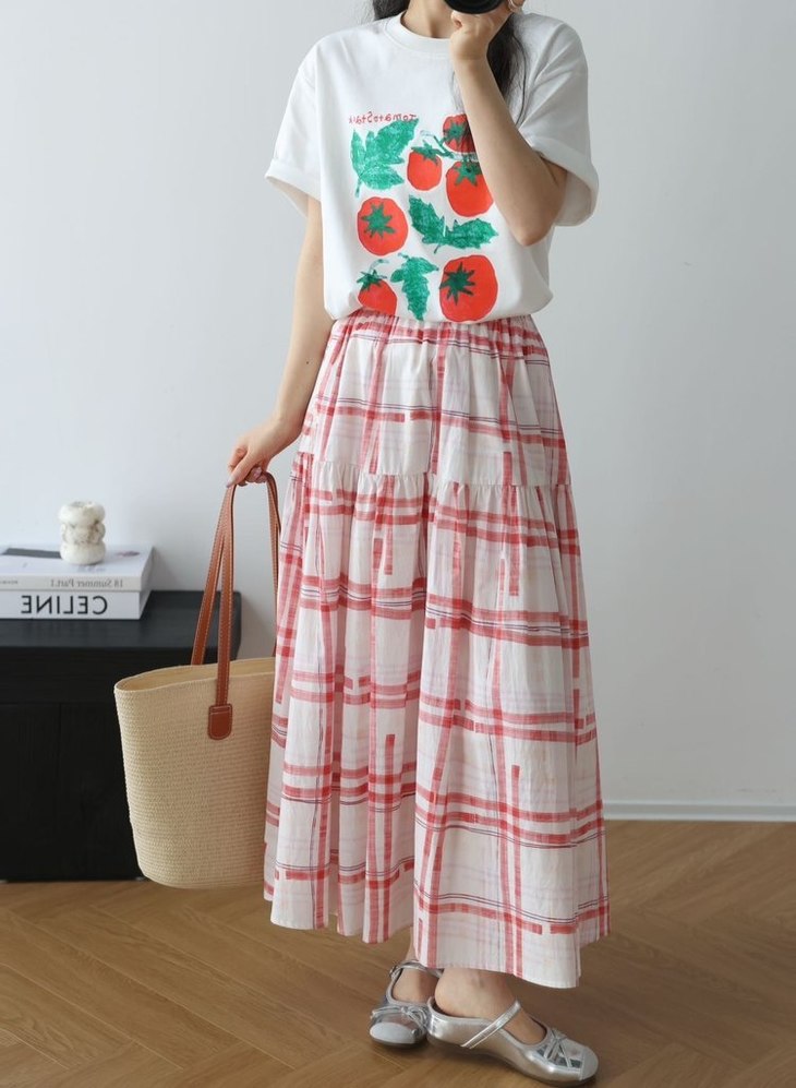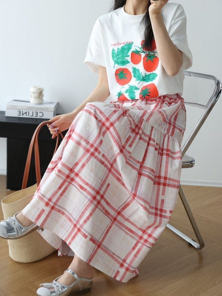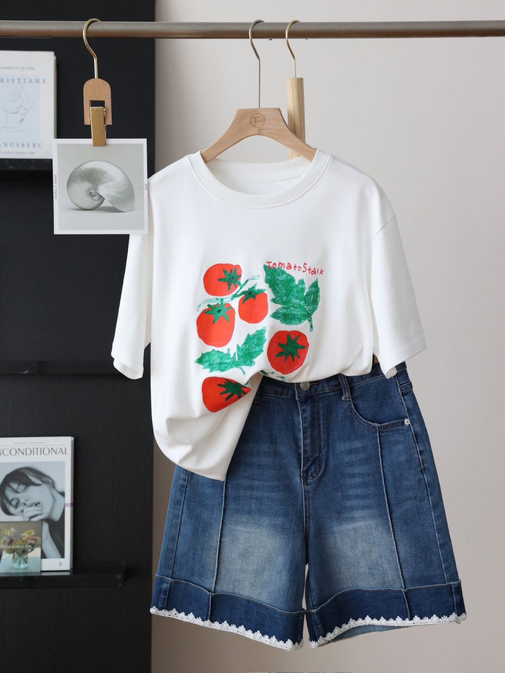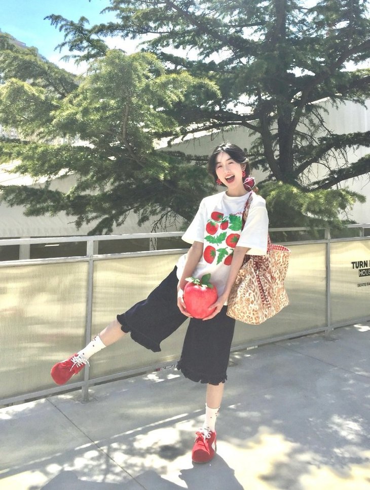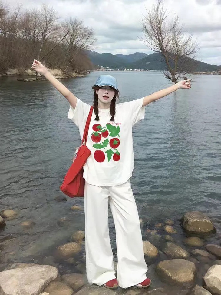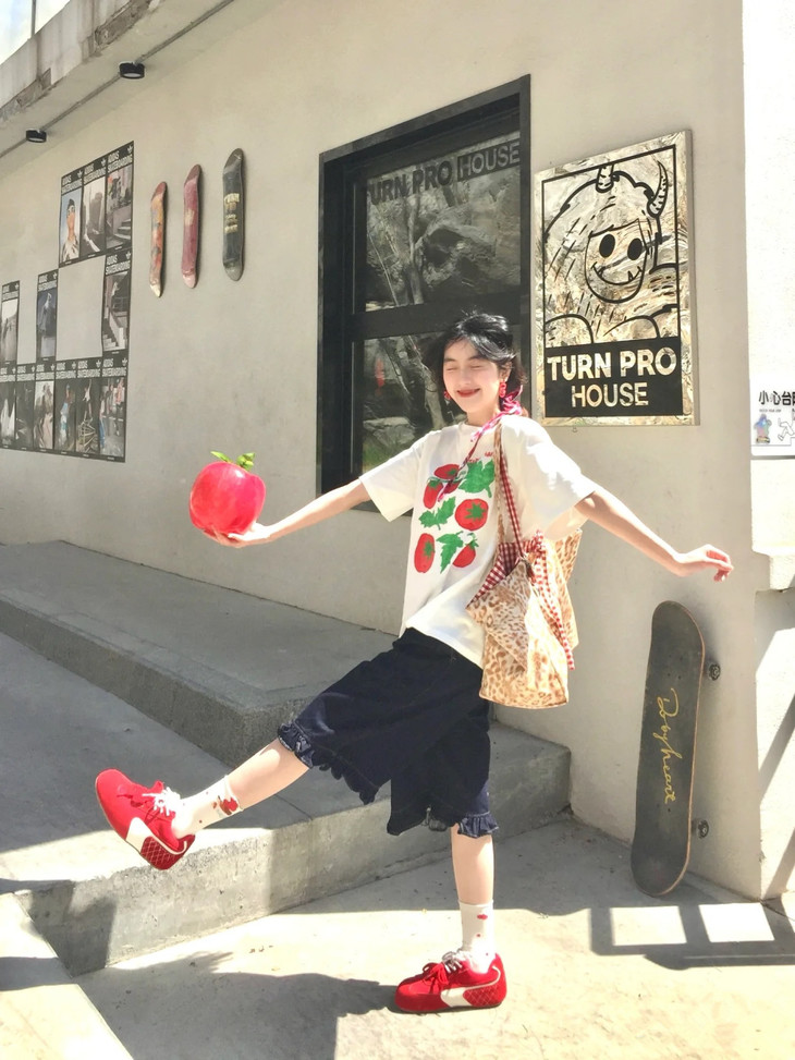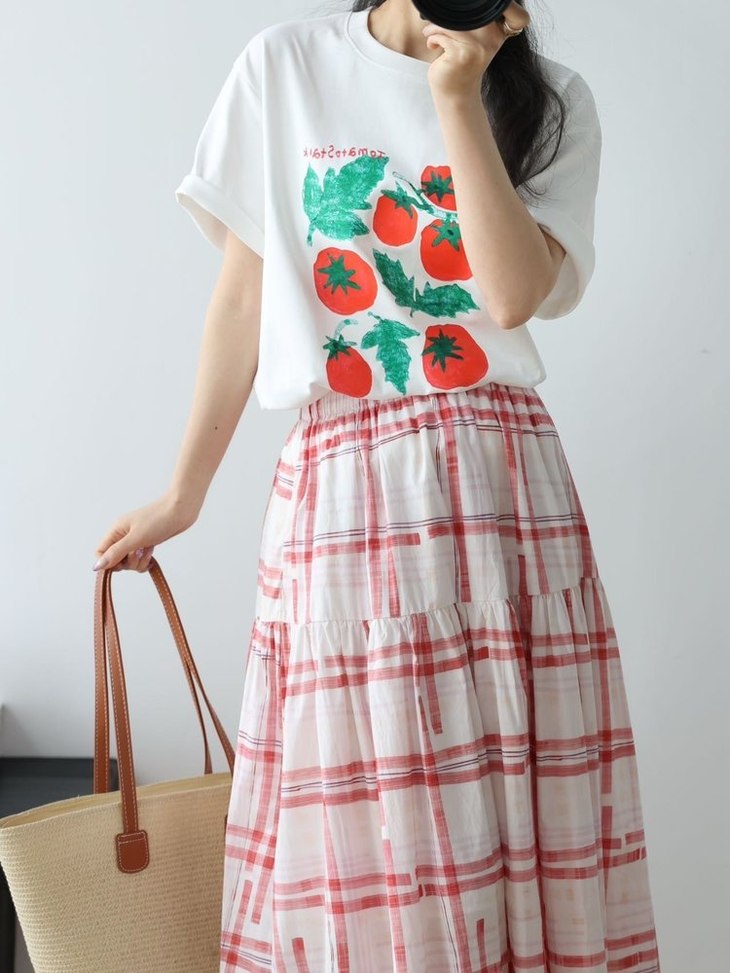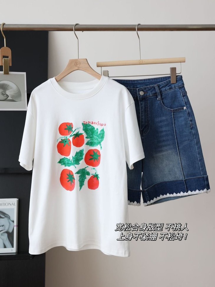 西红柿印花可可爱爱 白底衬托,更加浓郁鲜活 无论是搭配衣橱里的裙装还是牛仔裤 趣味性都直接拉满 看一下团长的搭配示例哦! 不管你的衣柜里有什么下装 都能给你盘活!完美适配! 这件短袖真的必入❗