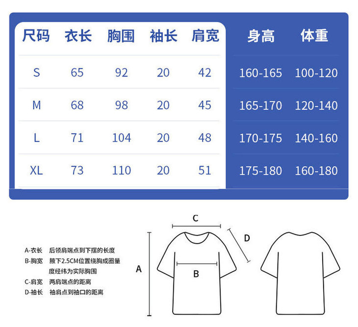 下单信息: 【尺码】S、M、L、XL S 胸围92 肩宽42 衣长65 适合(100-120斤) M 胸围98 肩宽45 衣长68 适合(120-140斤) L 胸围104 肩宽48 衣长71 适合(140-160斤) XL胸围108 肩宽51 衣长73 适合(160-180斤)