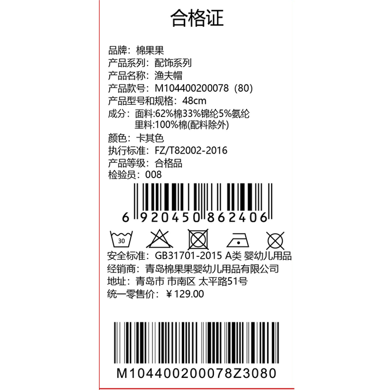 棉果果春季新品商场同款男童女童遮阳洋气百搭渔夫帽M104400200078