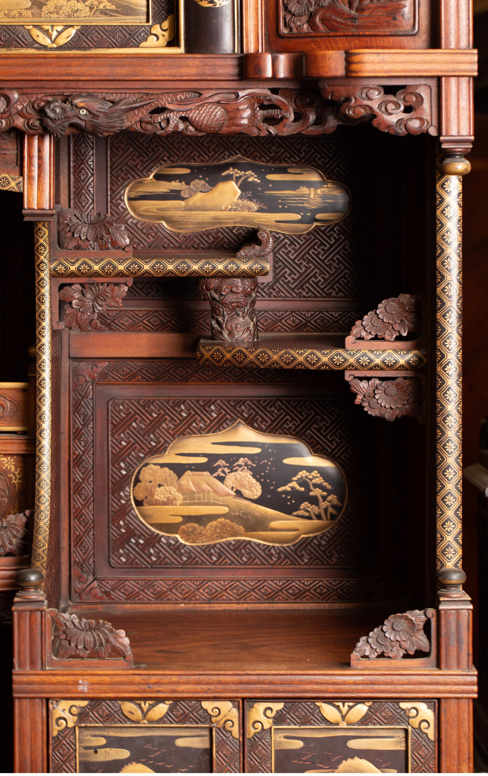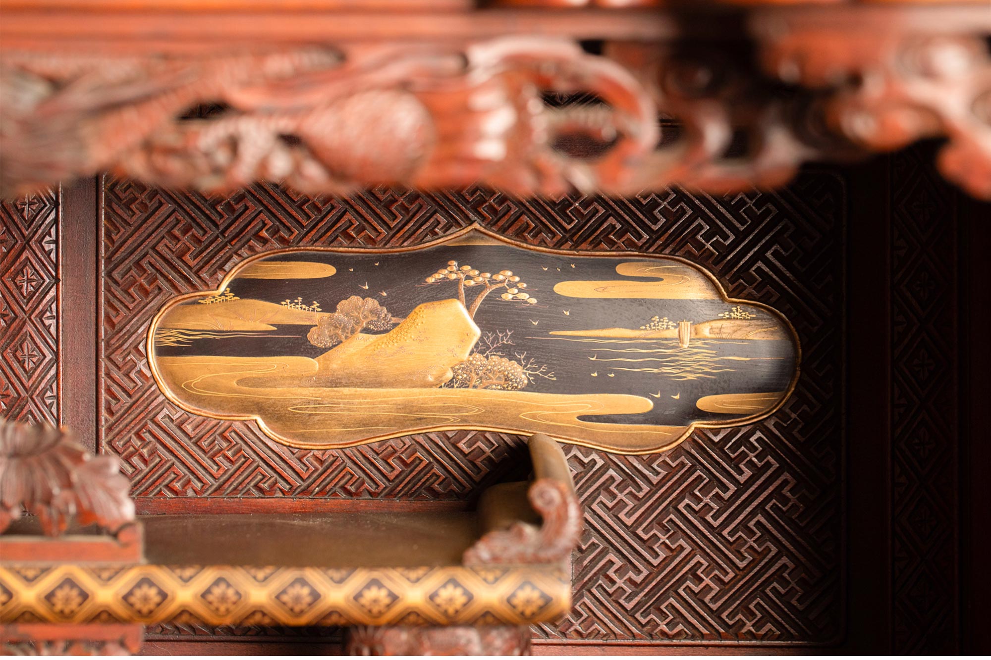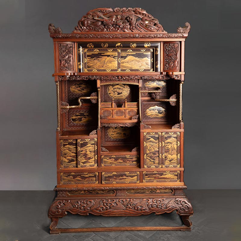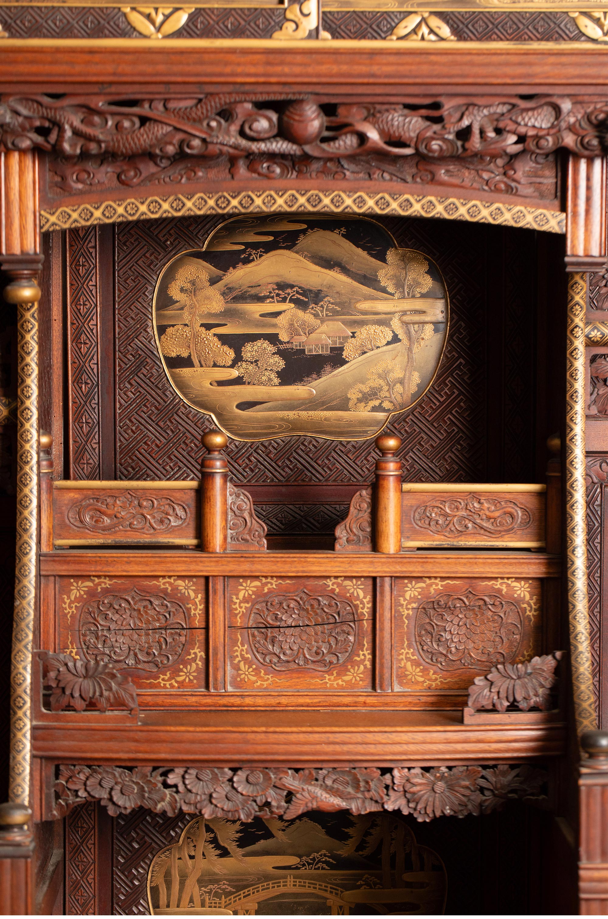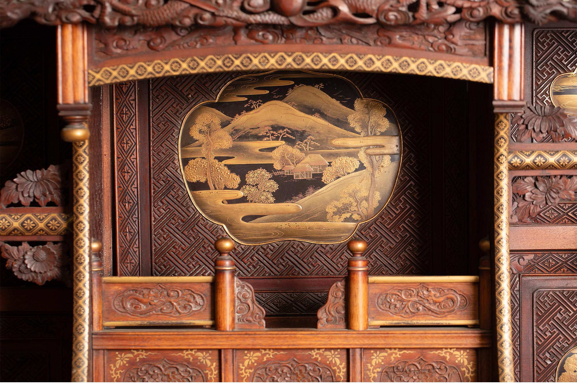 19世纪晚期日本明治时期出品神龙花鸟造型松木精雕装饰传统山水主题金漆莳绘大型多宝阁