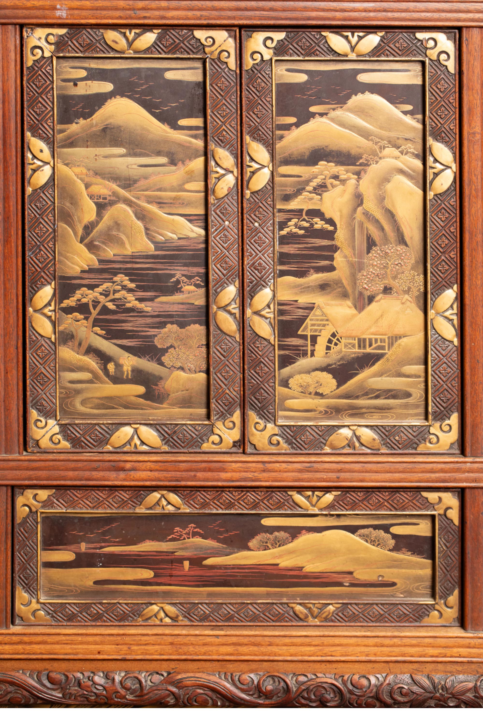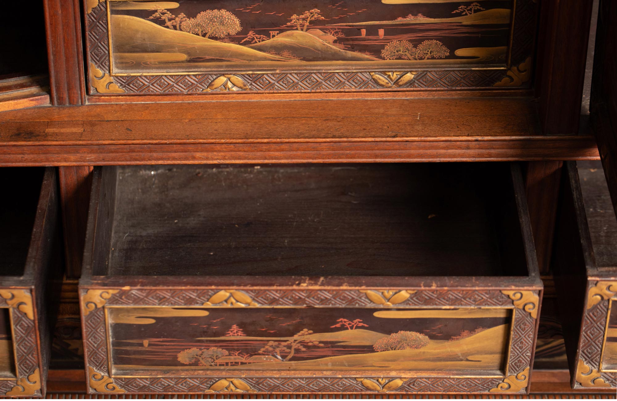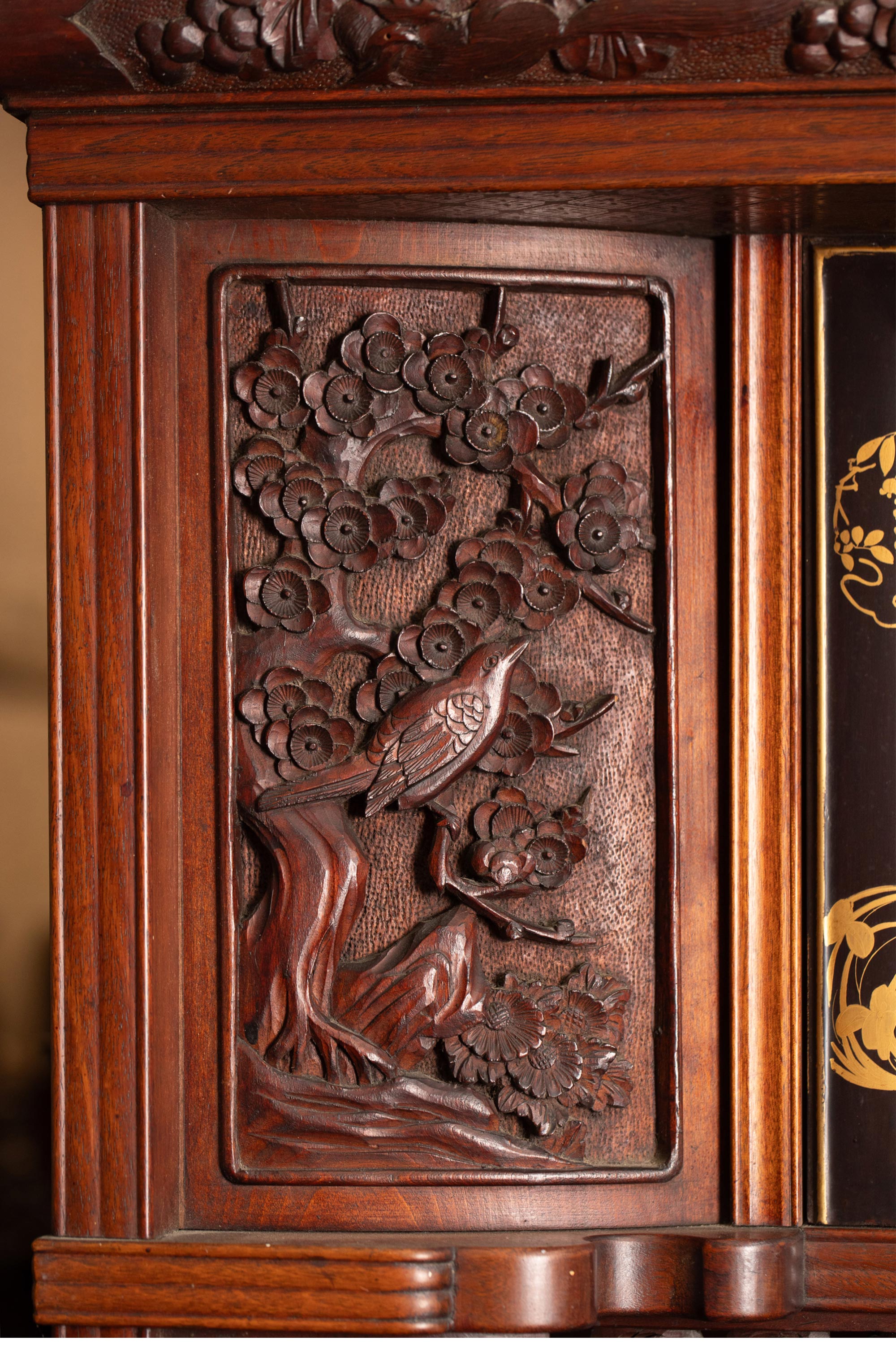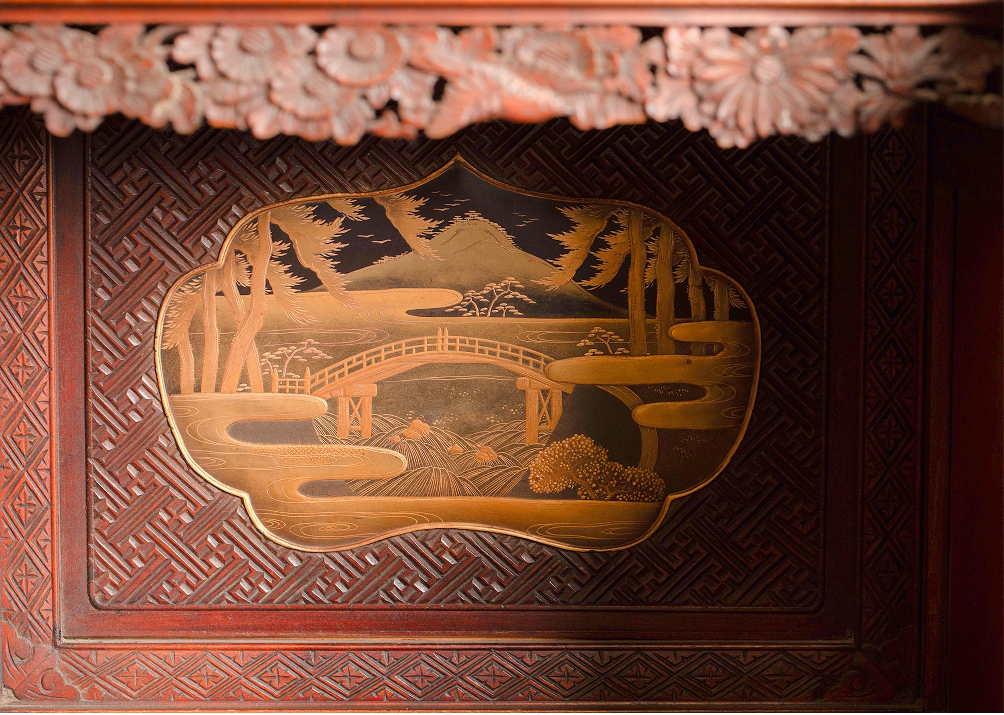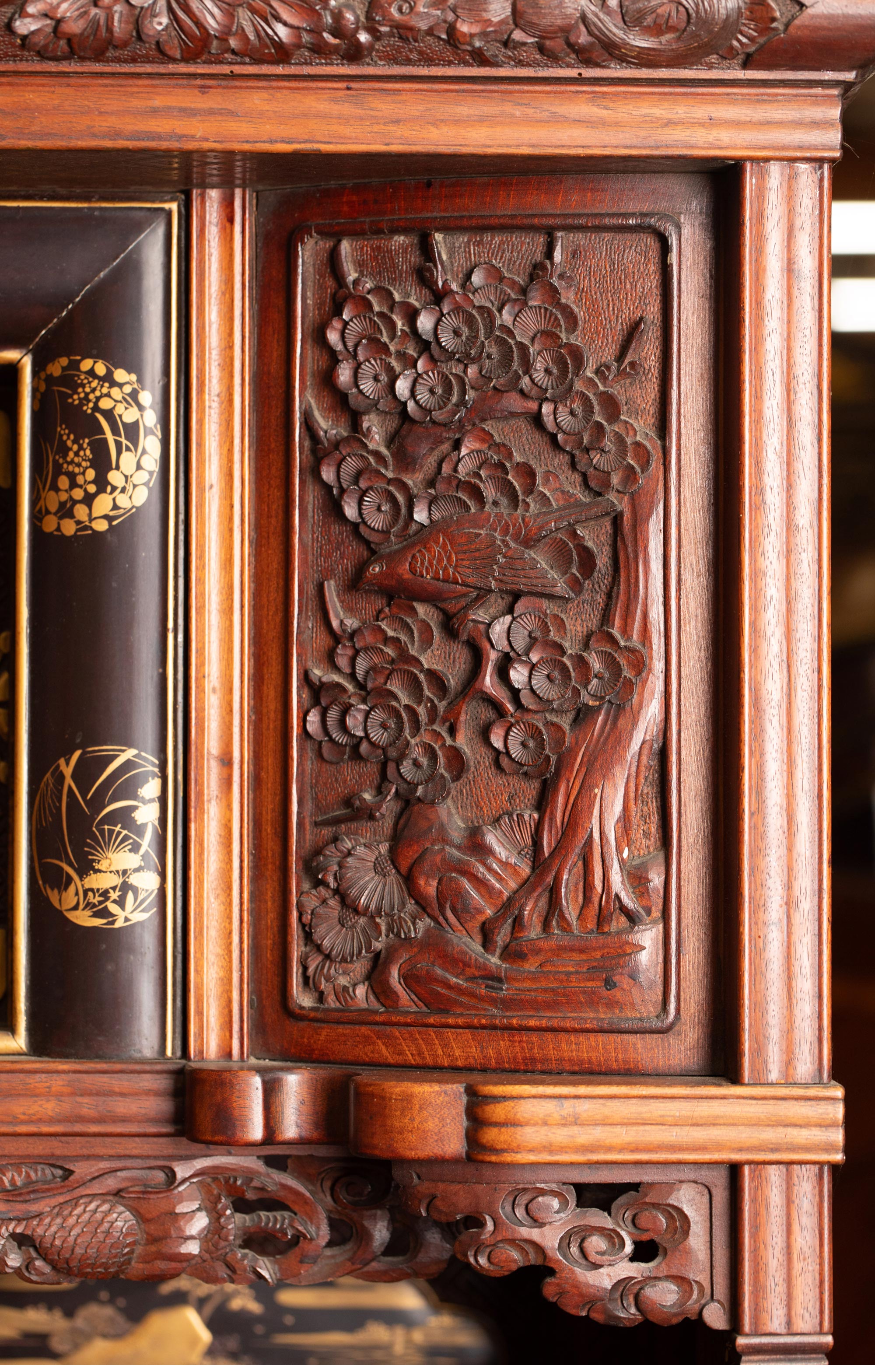 19世纪晚期日本明治时期出品神龙花鸟造型松木精雕装饰传统山水主题金漆莳绘大型多宝阁