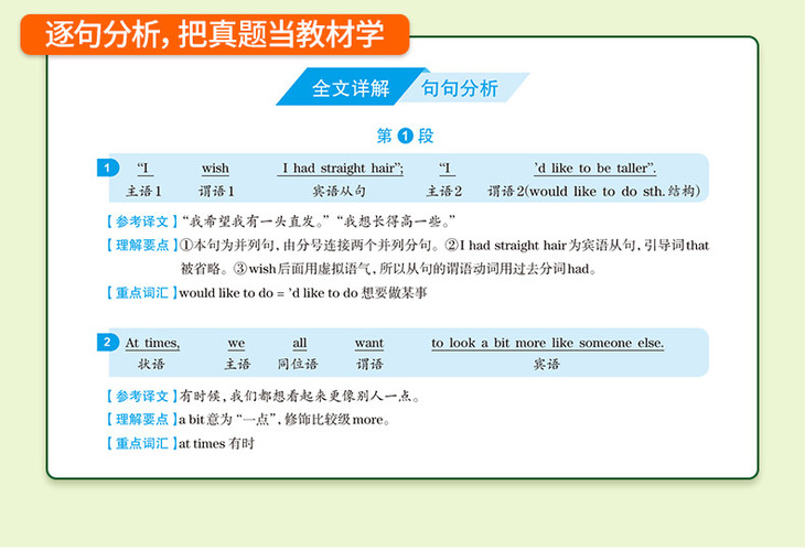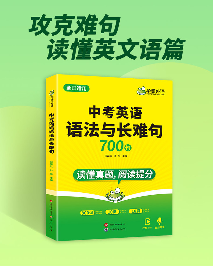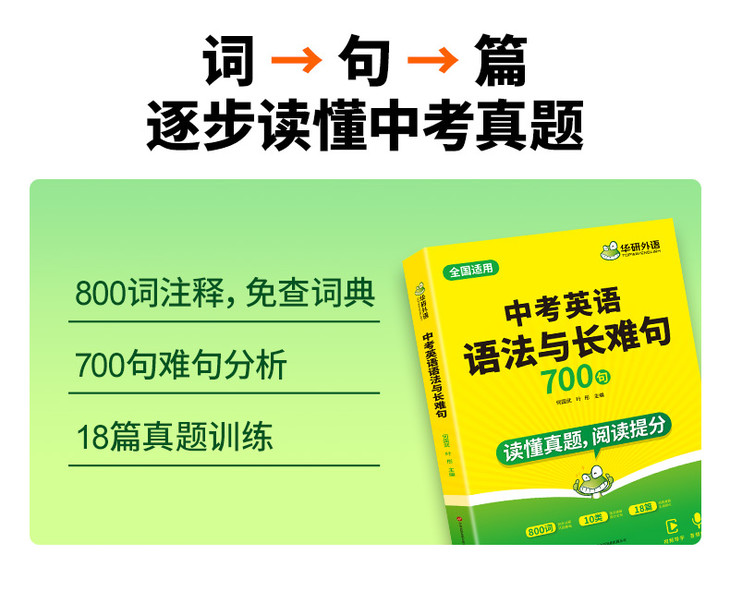 2. 800难词注释、200真题难句训练、18篇真题语篇训练,词→句→篇逐步推进,适用于零基础冲高分;