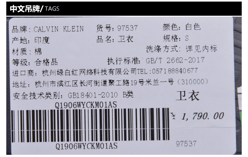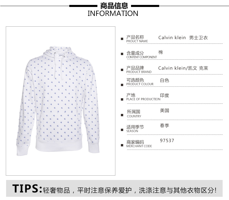 【特惠秒】CK 男士全棉休闲连帽卫衣外套 97537
