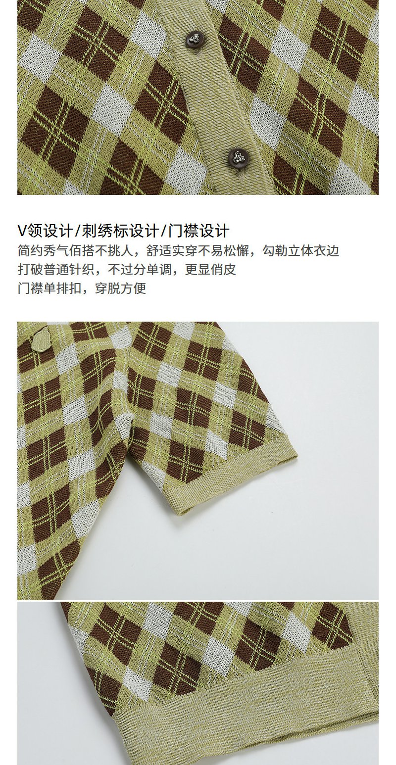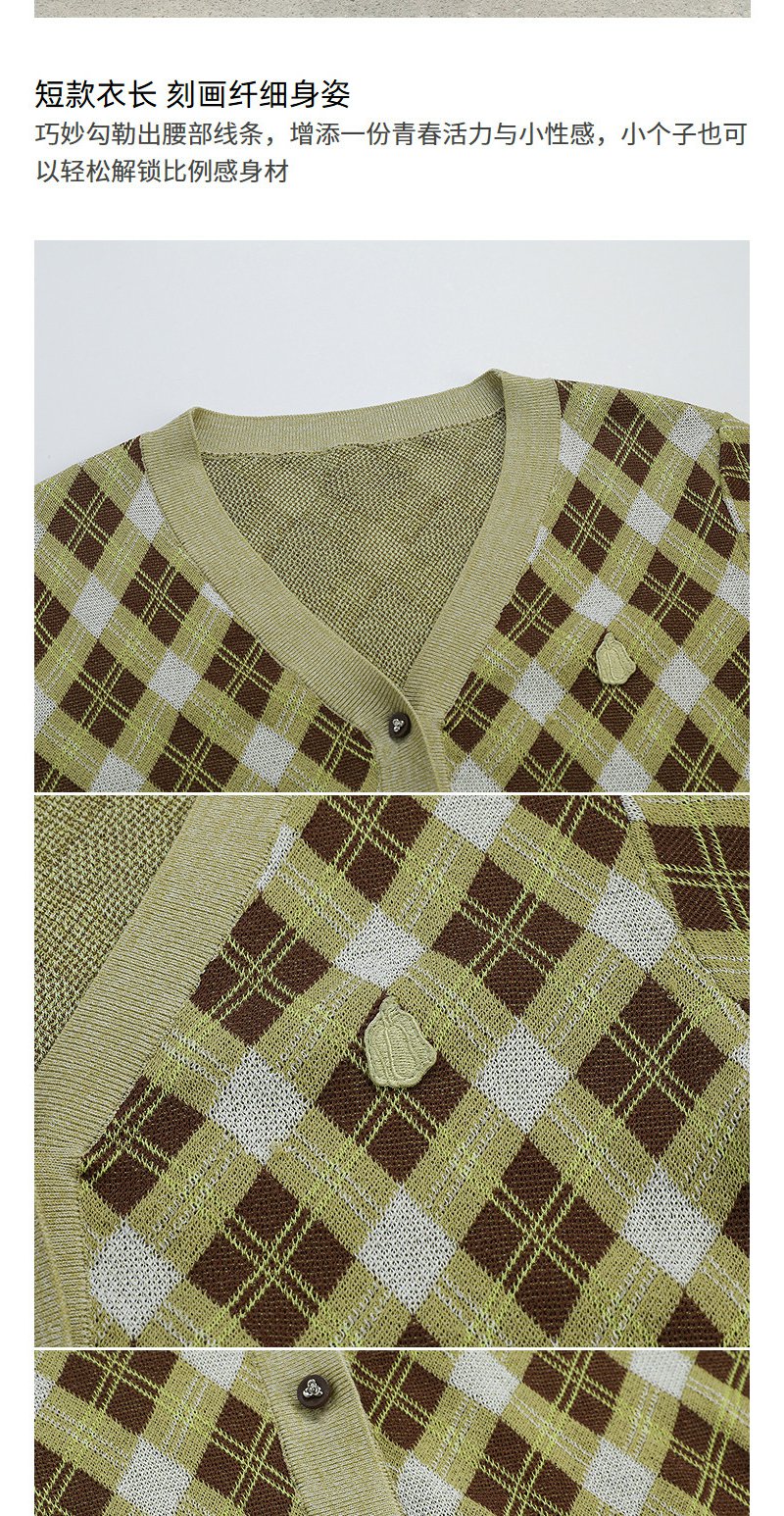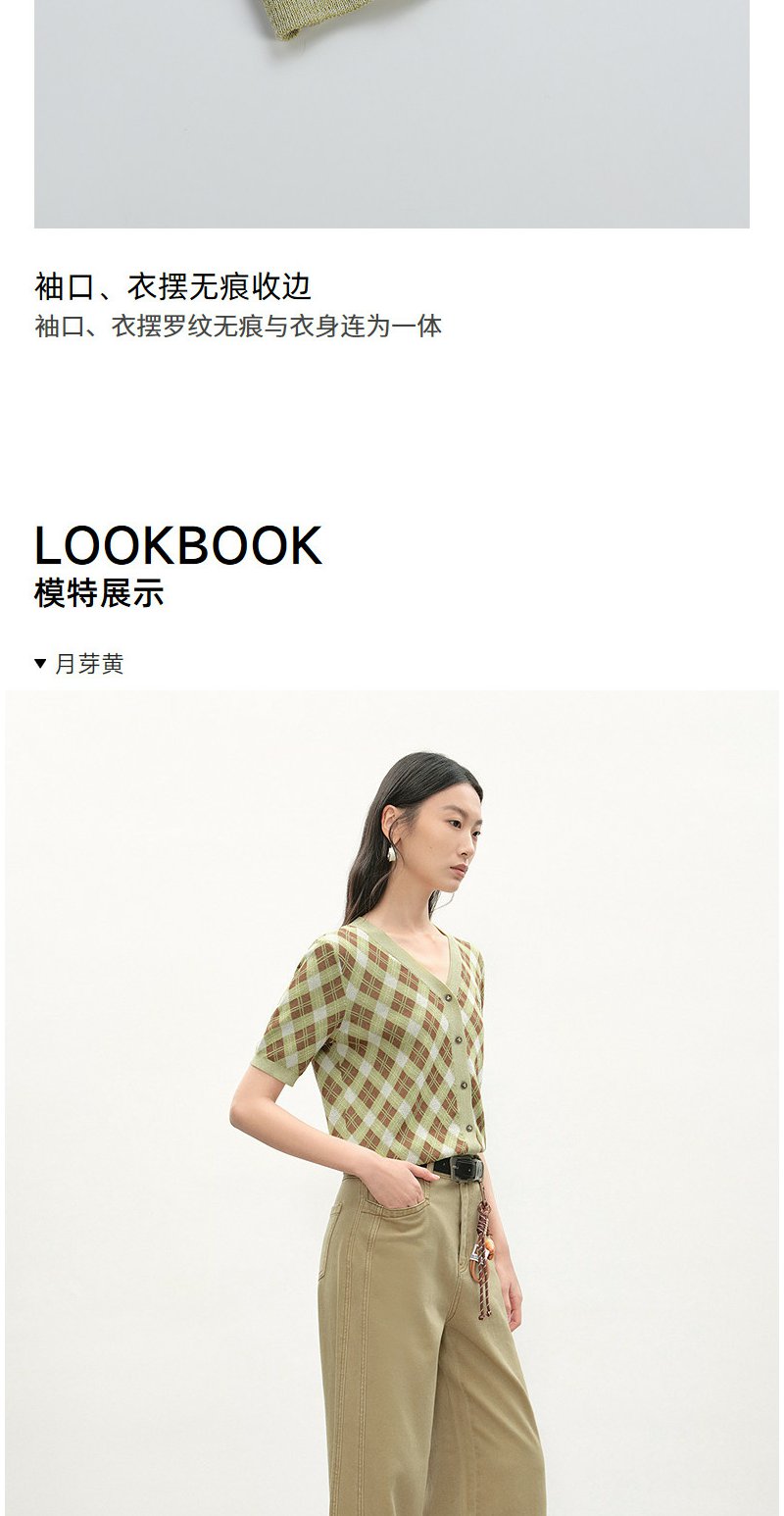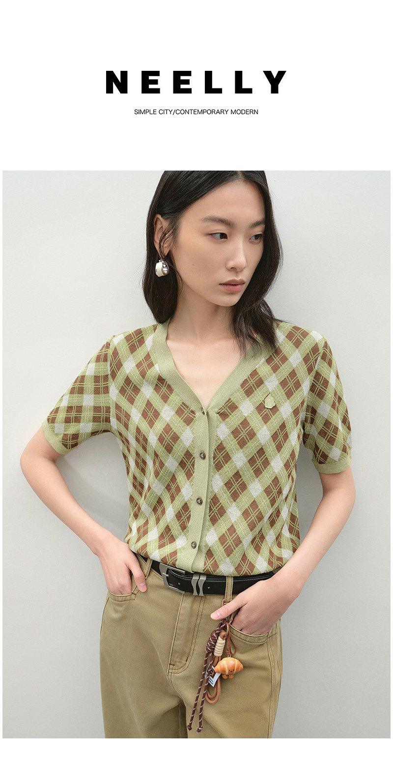 NEELLY纳俪商场同款夏新款V领格纹设计感针织开衫女撞色显白毛衣N26044A04513