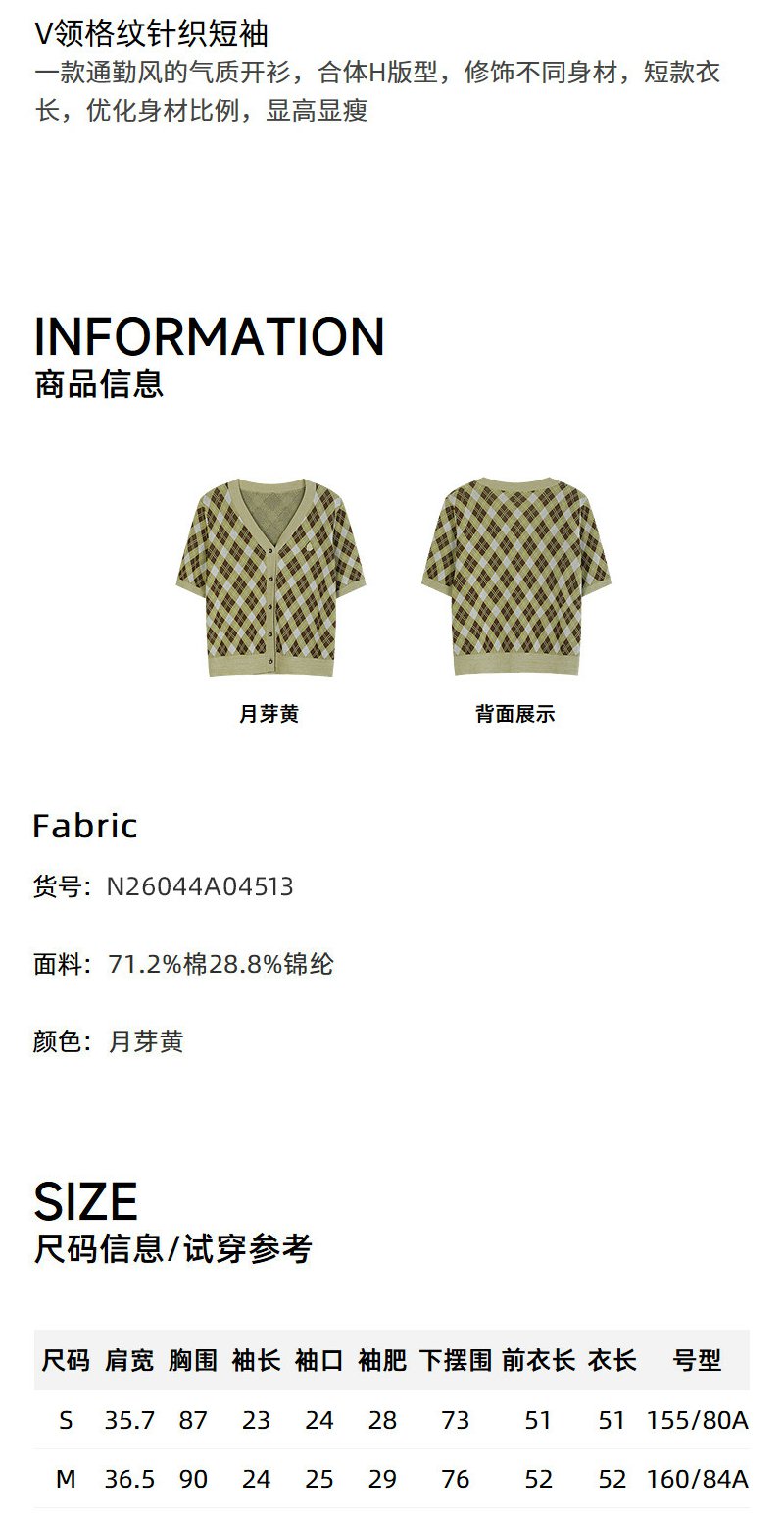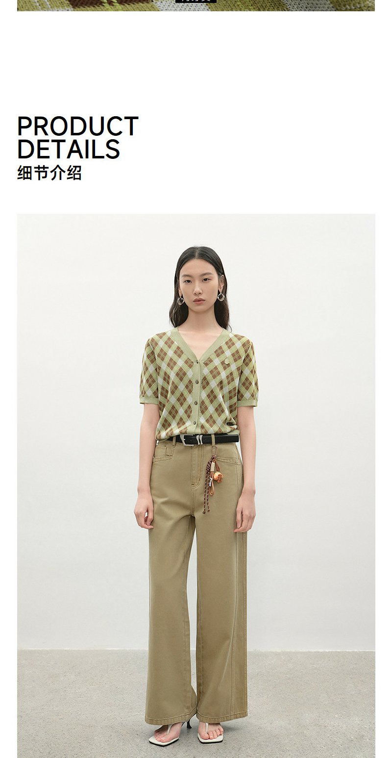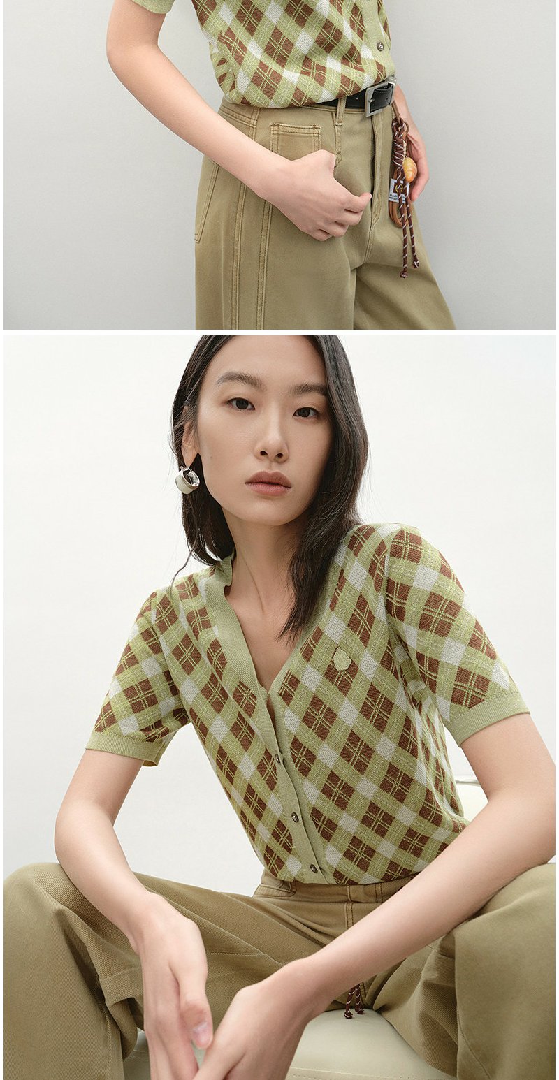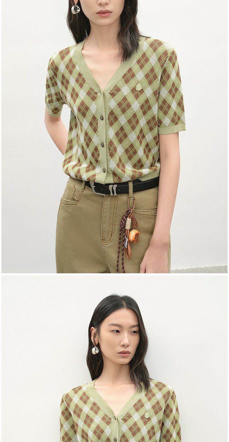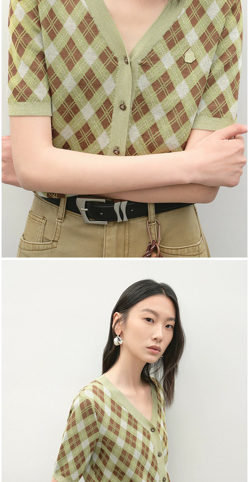 NEELLY纳俪商场同款夏新款V领格纹设计感针织开衫女撞色显白毛衣N26044A04513