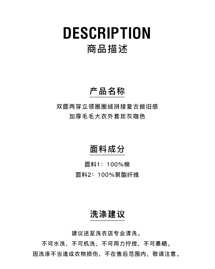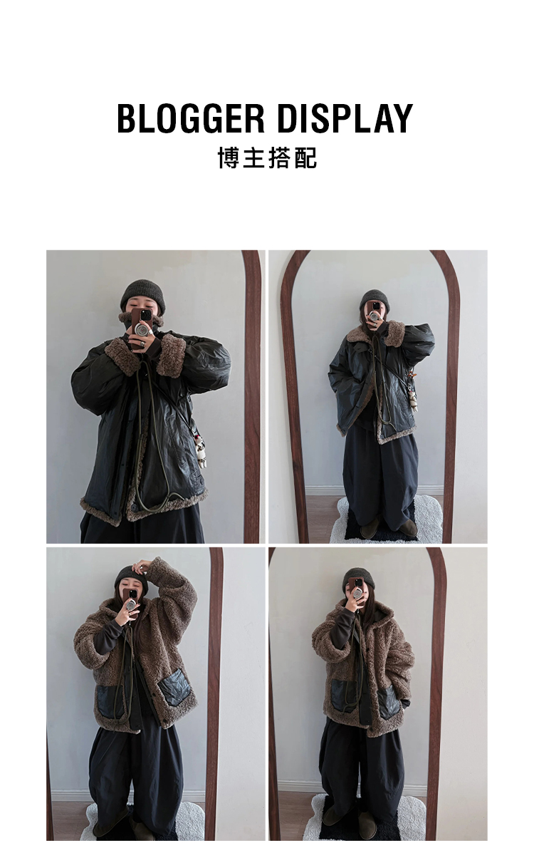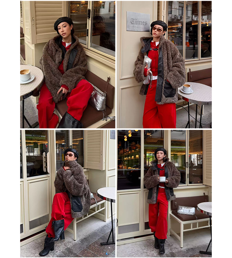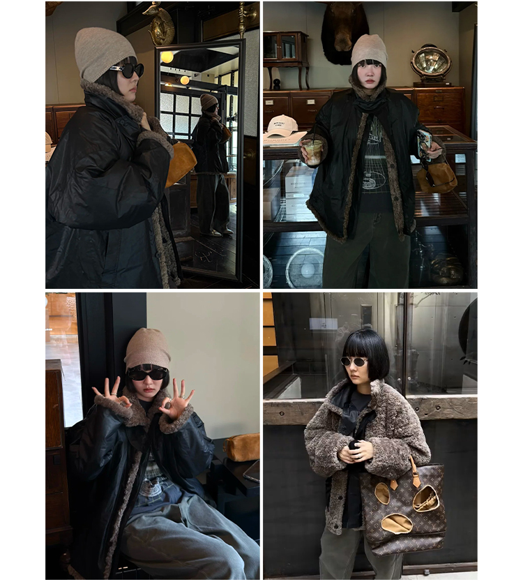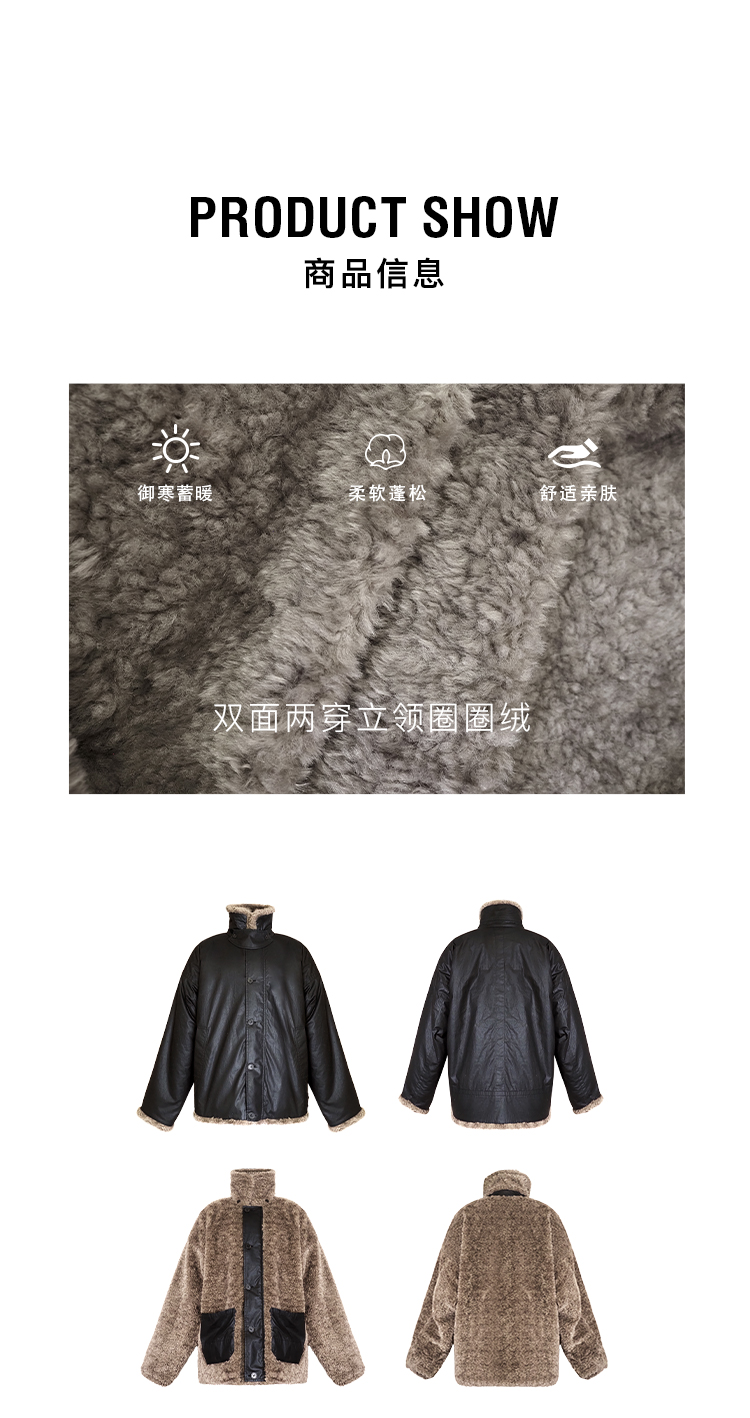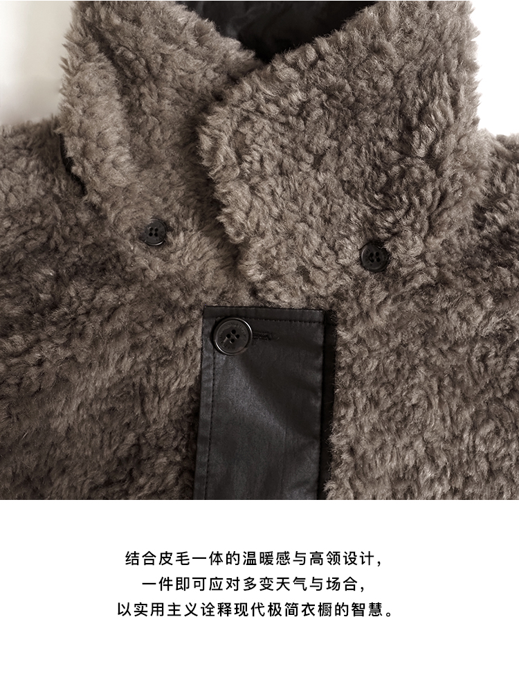HIDEMI 双面两穿立领圈圈绒拼接复古做旧感加厚毛毛大衣外套 炭灰咖色