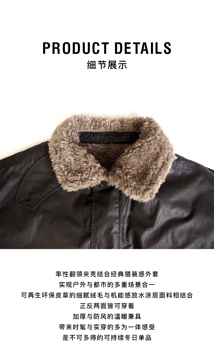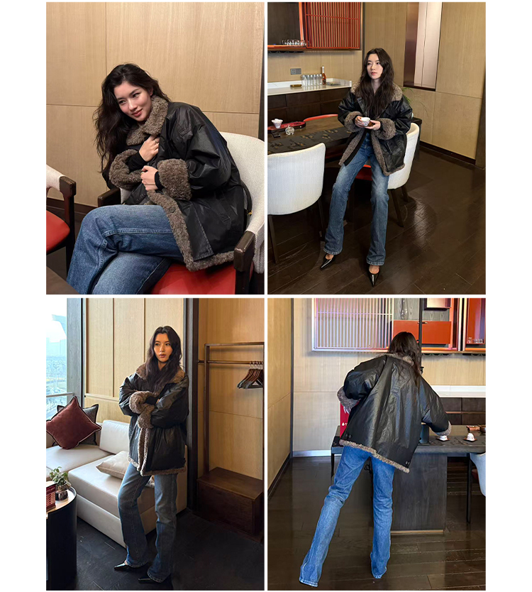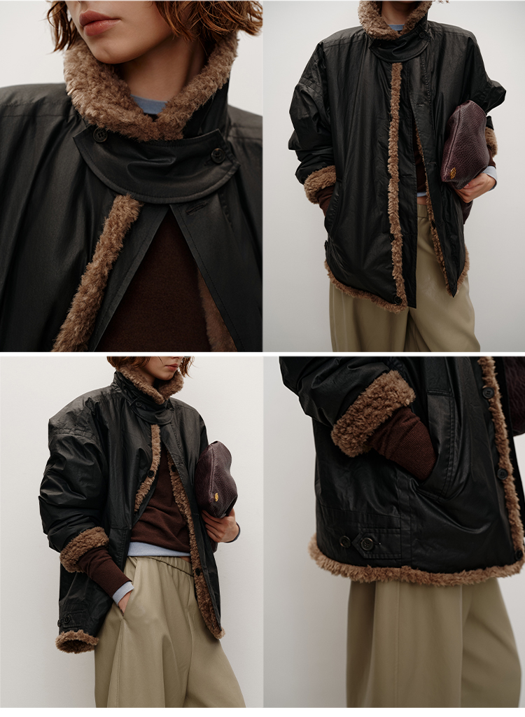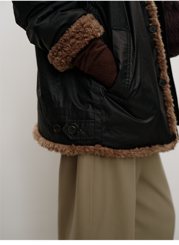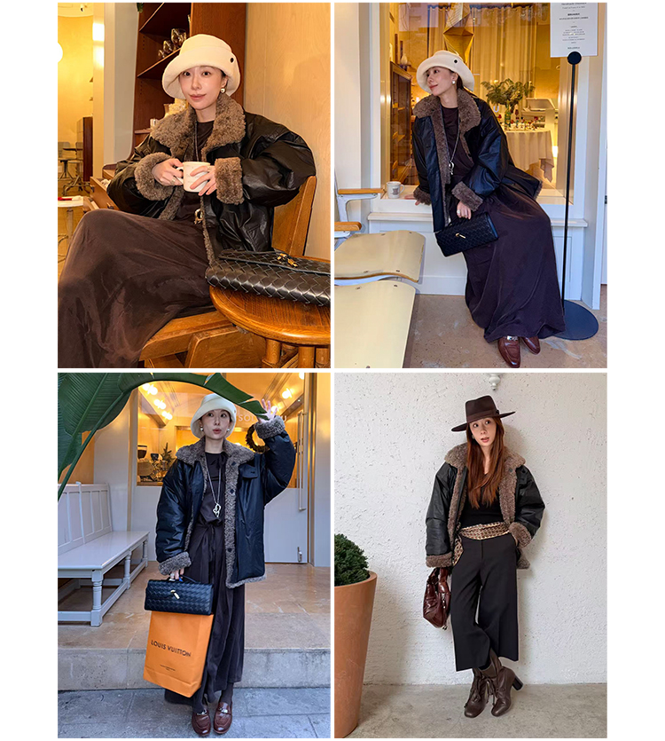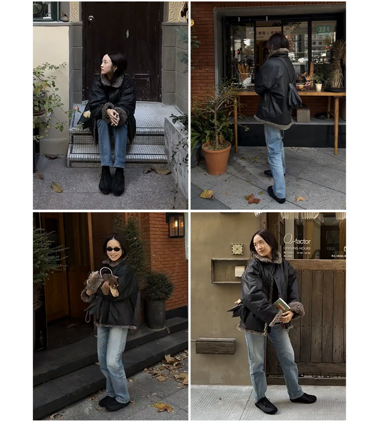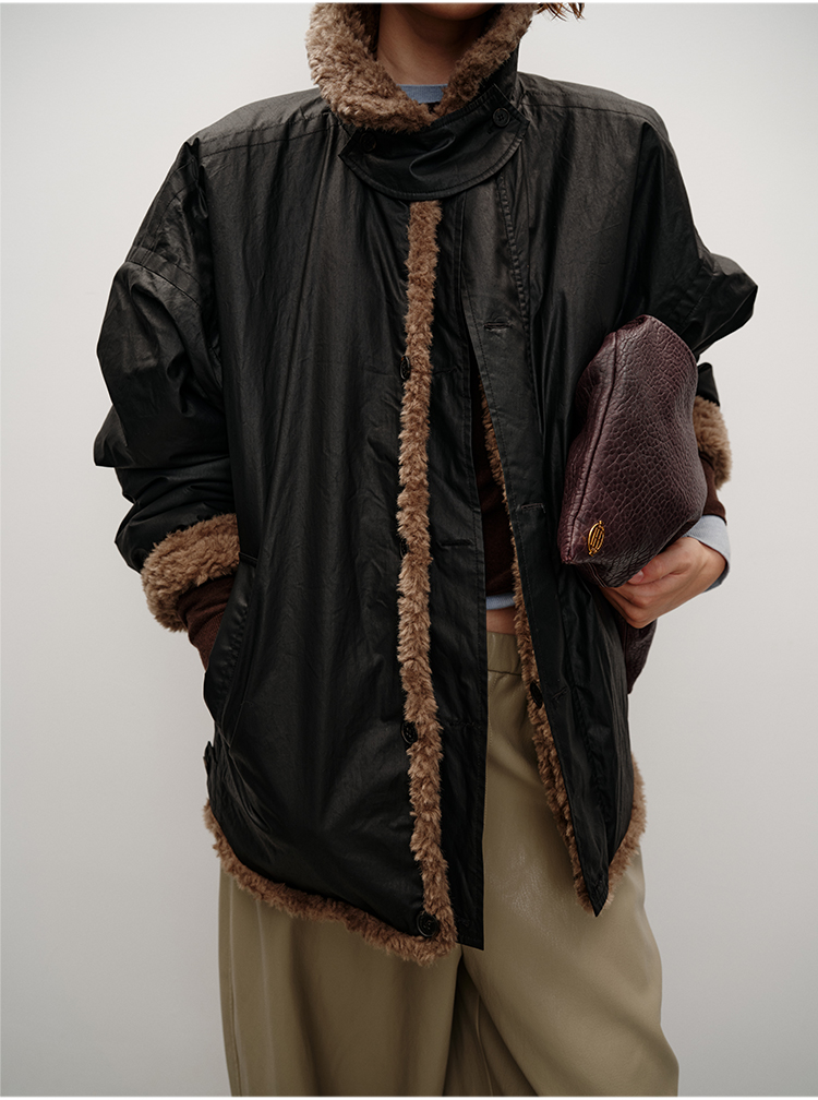HIDEMI 双面两穿立领圈圈绒拼接复古做旧感加厚毛毛大衣外套 炭灰咖色