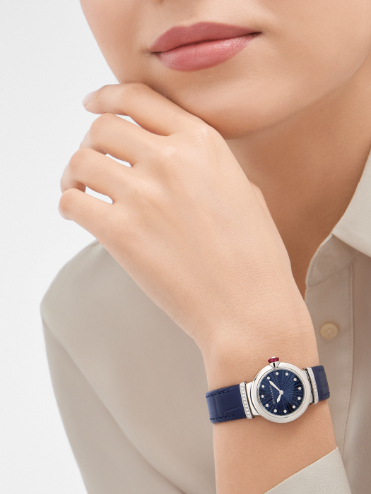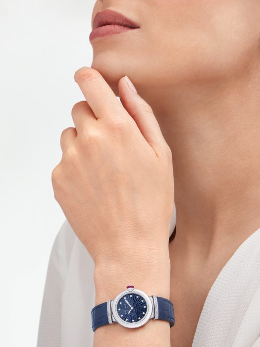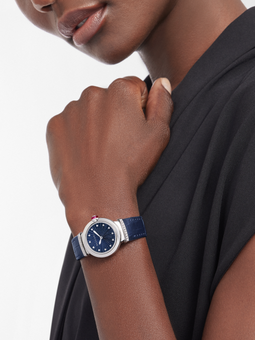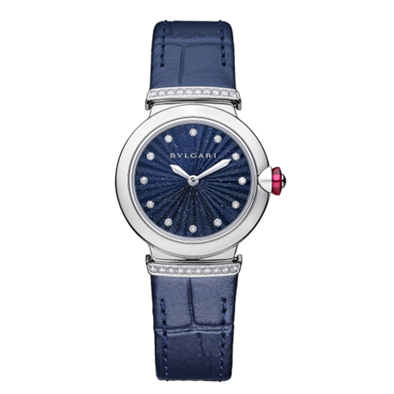 镜面 材质 | 蓝宝石水晶玻璃 | 表盘 | 精钢表壳 蓝色砂金石表盘采用细工镶嵌Intarsio图案,镶嵌12枚钻石时标 12颗镶钻时标 精钢表圈镶嵌圆形明亮式切割钻石,精钢表冠镶嵌一颗凸形蛋面切割科技红碧玺和一颗圆形钻石 |