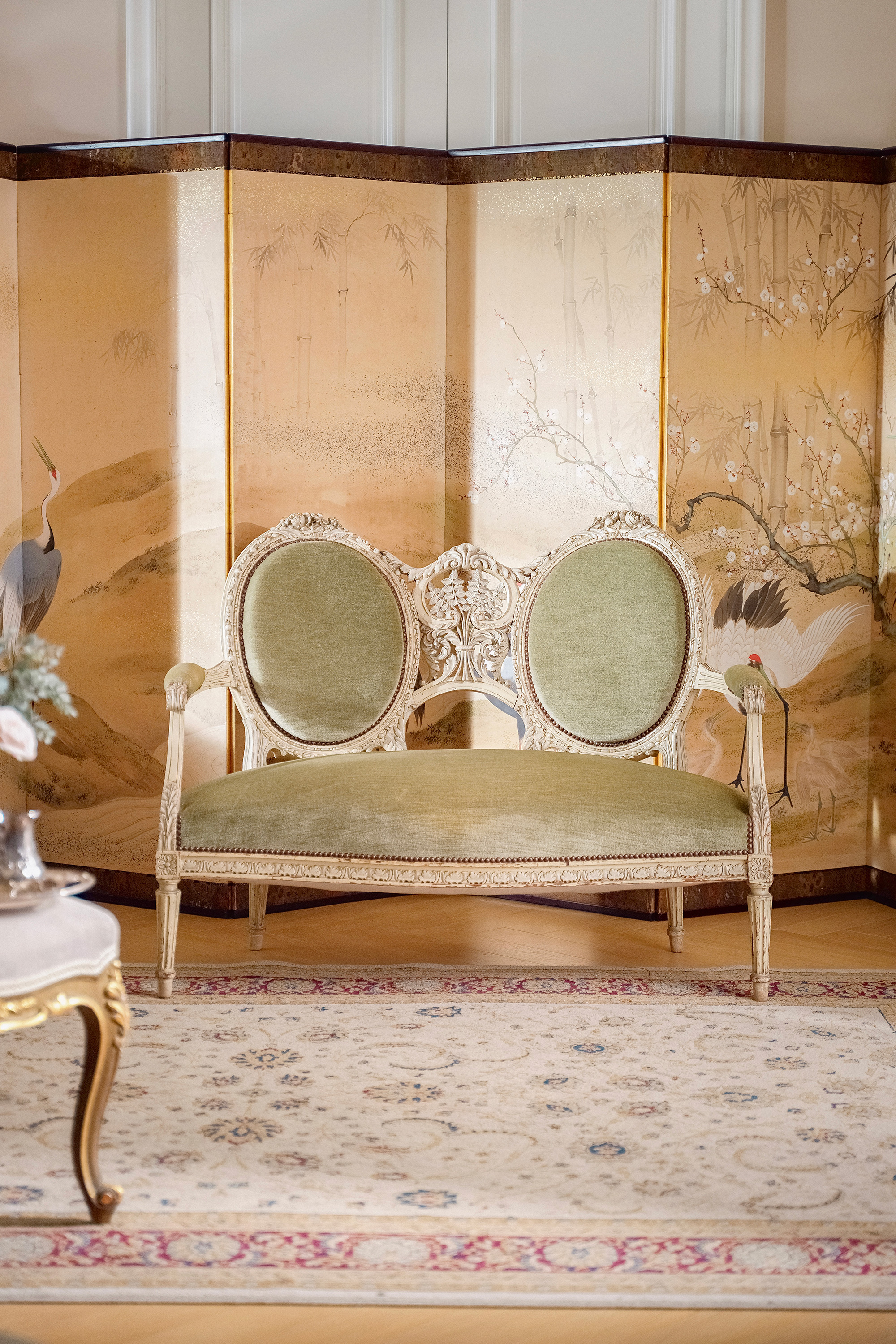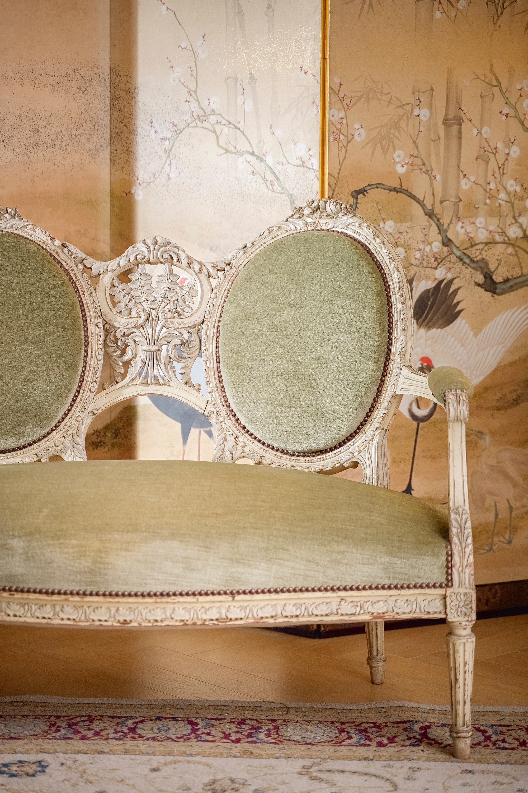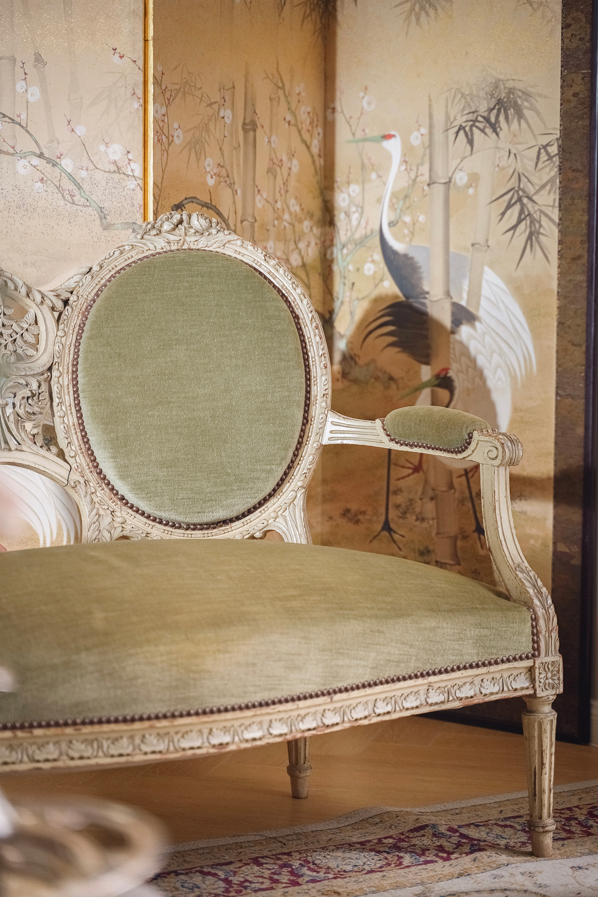 独角鹿西洋古董1950年代法国出品路易十五风格古典卷叶纹实木漆面精雕装饰绿色丝绒面双人位沙发