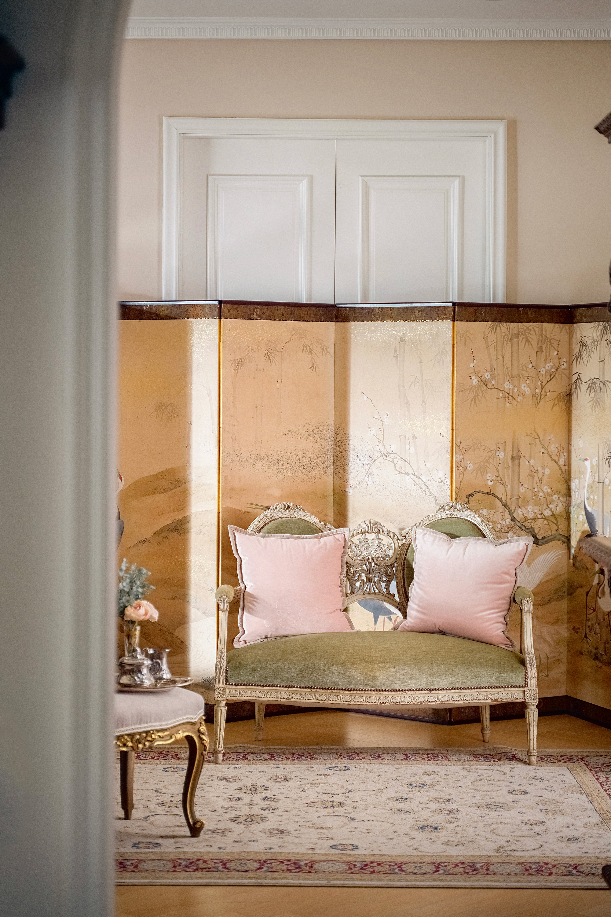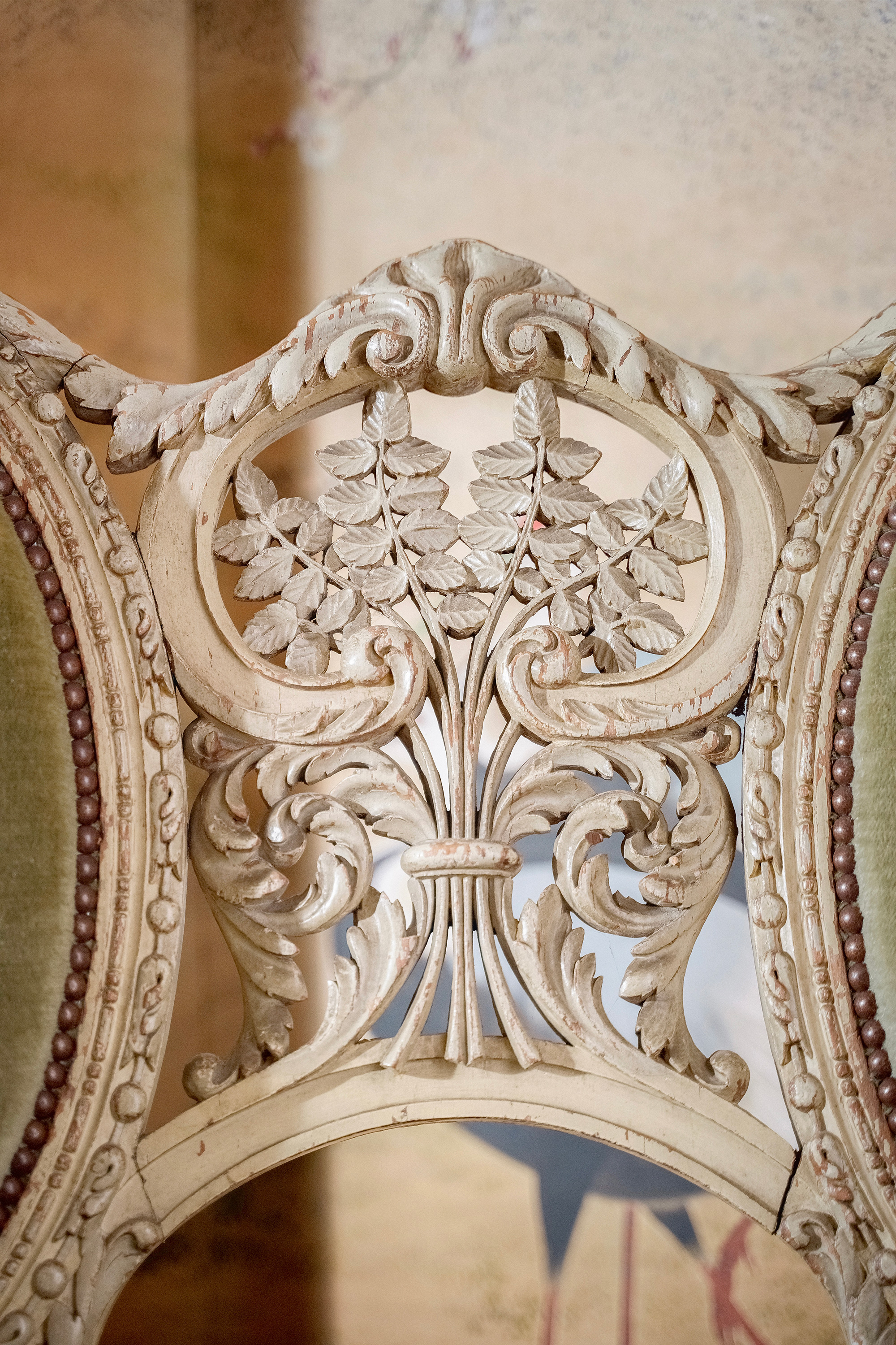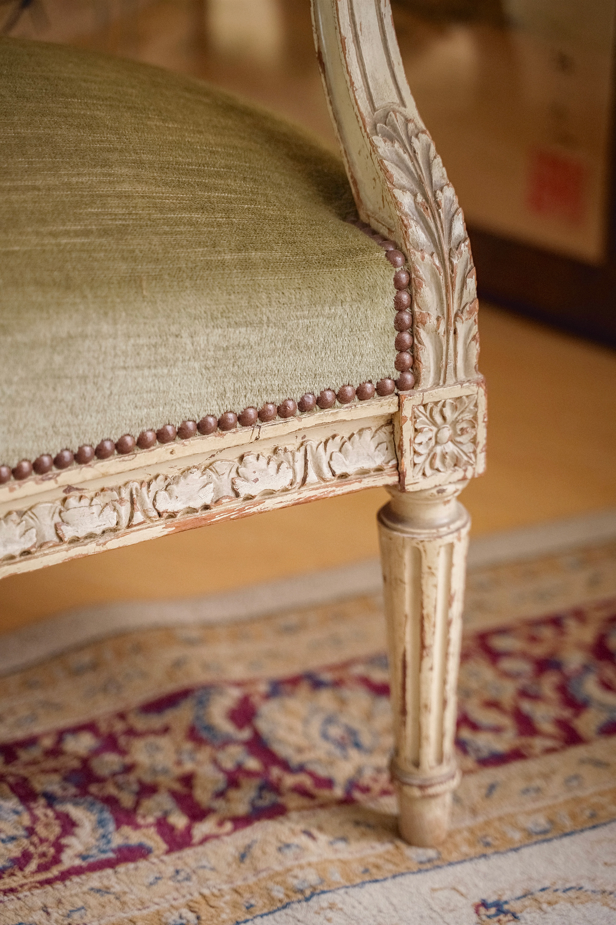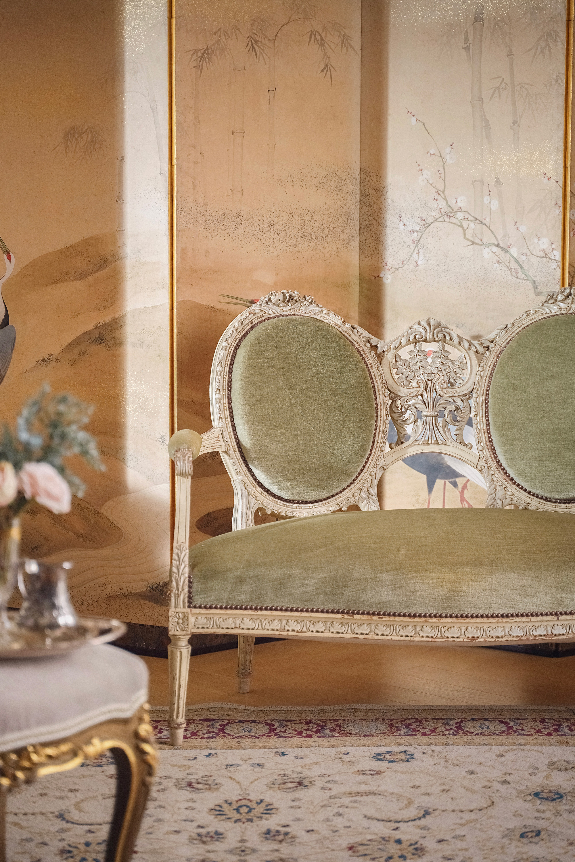 独角鹿西洋古董1950年代法国出品路易十五风格古典卷叶纹实木漆面精雕装饰绿色丝绒面双人位沙发