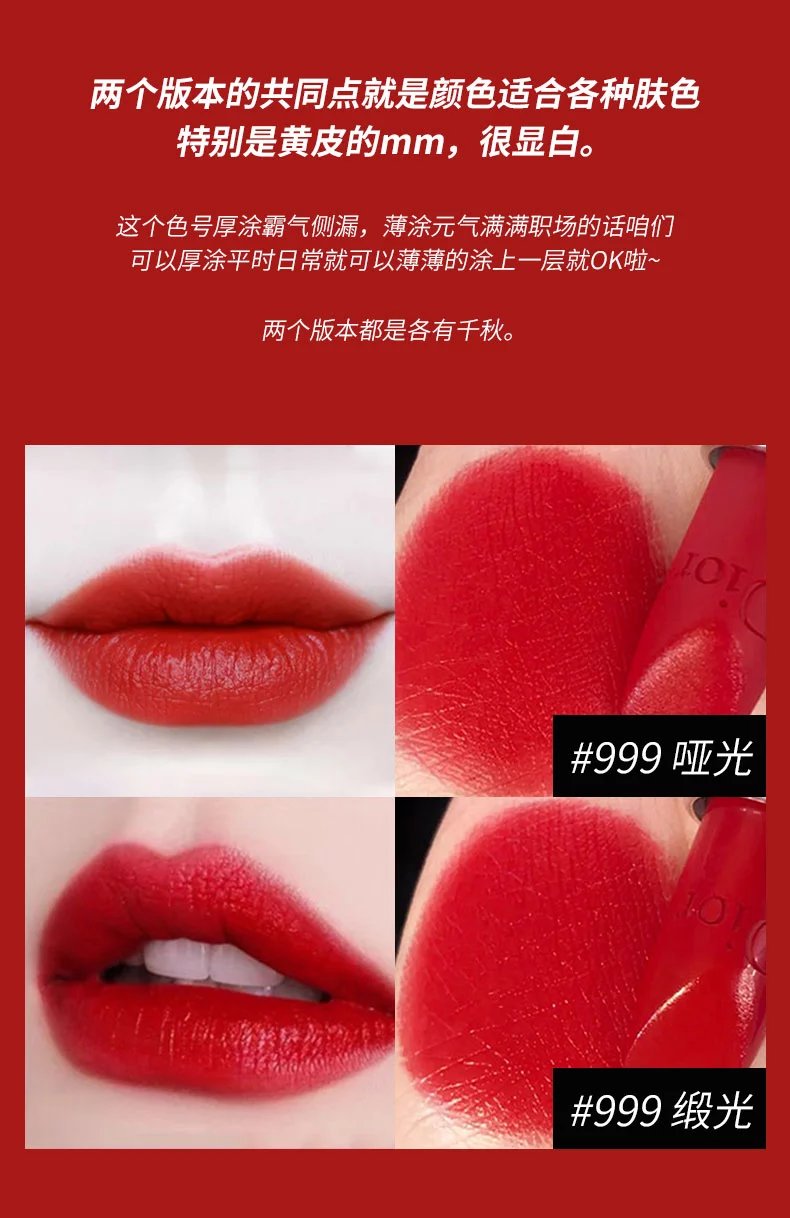1、迪奥#999(传奇红唇)是纯粹高饱和度的红,像饱读诗书,温柔优雅却带着棱角的『高知冷感美人』;