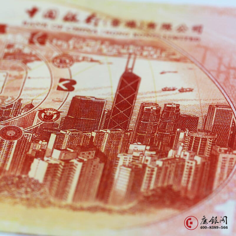 纪念钞背面以1919年中银香港分号升格为分行的开业报章广告剪影、1983年成立的中银集团在港其中12家成员行的标识,以及1994年中银首次发行港元钞票的背面主景一T从太平山远眺维港两岸景色!为中心,以票中票手法,展现中银一百年来根植香港、服务香港波澜壮活的发展历程;以现时繁华的维港景色、现代的货柜码头为侧写,新旧映照,生动刻画了中银与香港同发展、共繁荣的历史印记,彰显了中银为促进经济社会发展,巩固和提升香港国际金融中心地位作出的贡献。