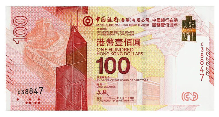 2017年9月25日,中银(香港)有限公司正式宣布发行港币100元面值“中银(香港)百年华诞纪念钞票,庆祝并纪念中银在香港服务100周年,纪念中银国际化经营100周年。