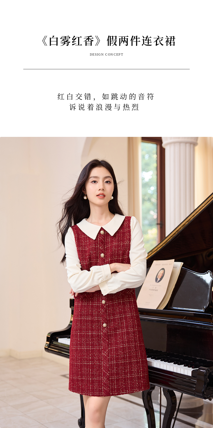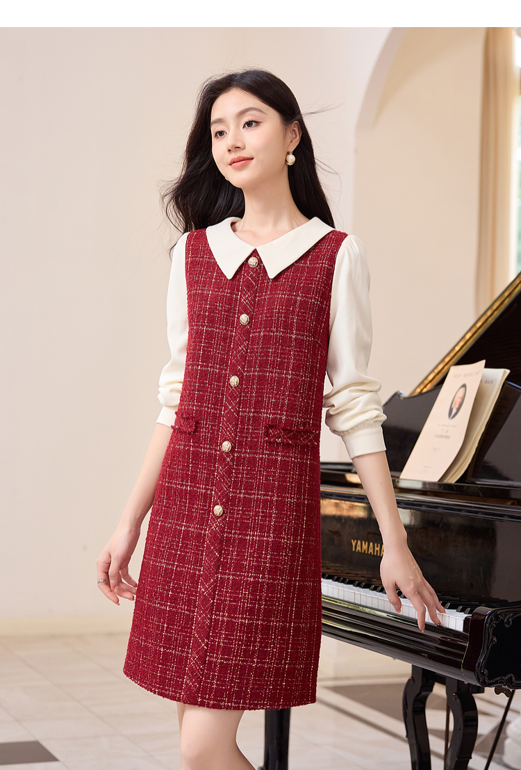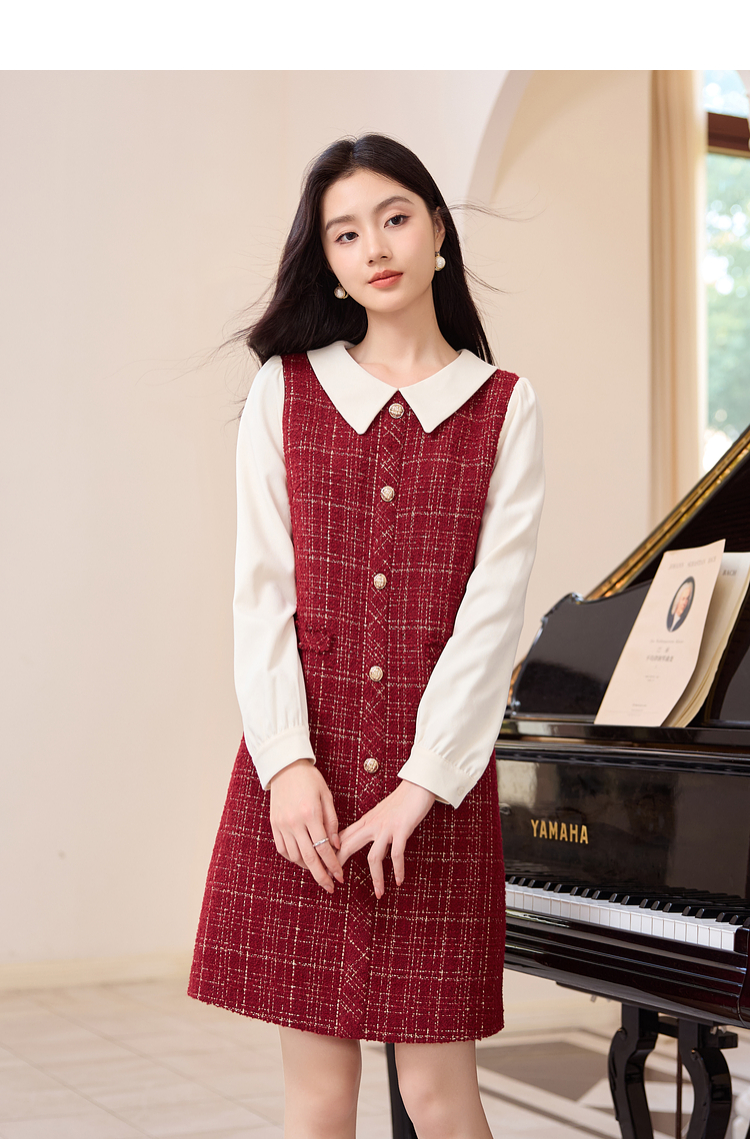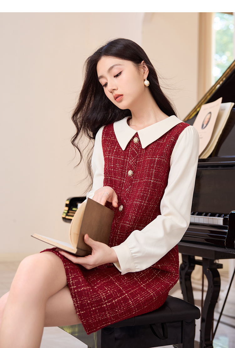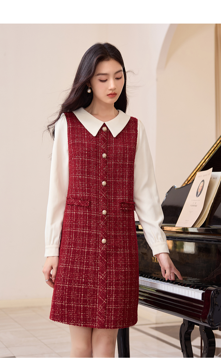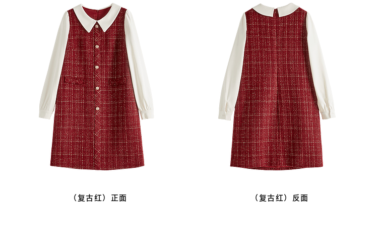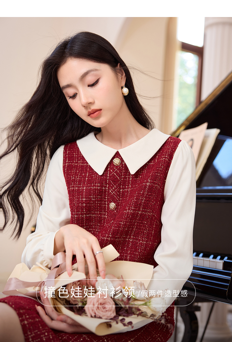 【专属特价】熙世界红色小香风假两件连衣裙女设计感粗花呢娃娃衬衫领裙子秋冬