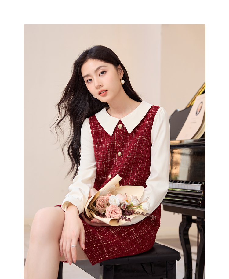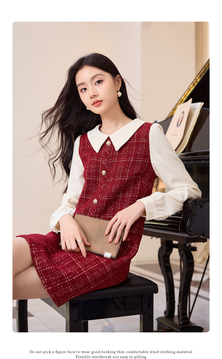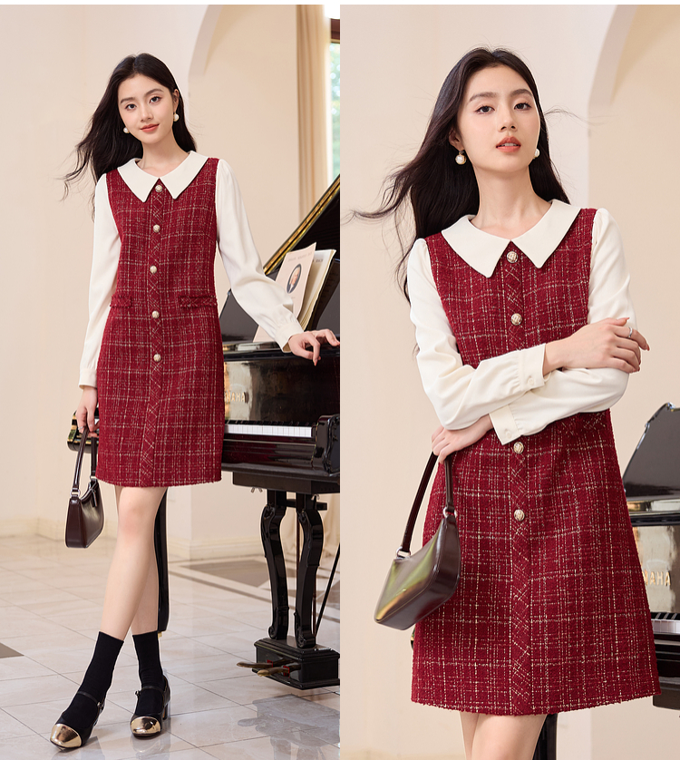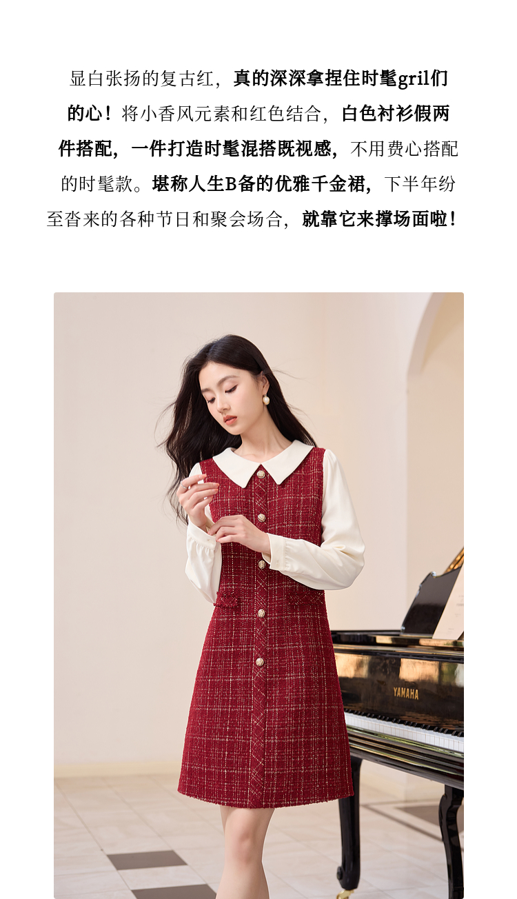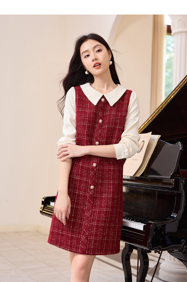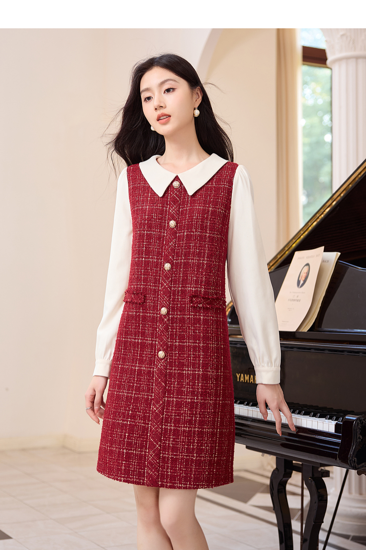 【专属特价】熙世界红色小香风假两件连衣裙女设计感粗花呢娃娃衬衫领裙子秋冬
