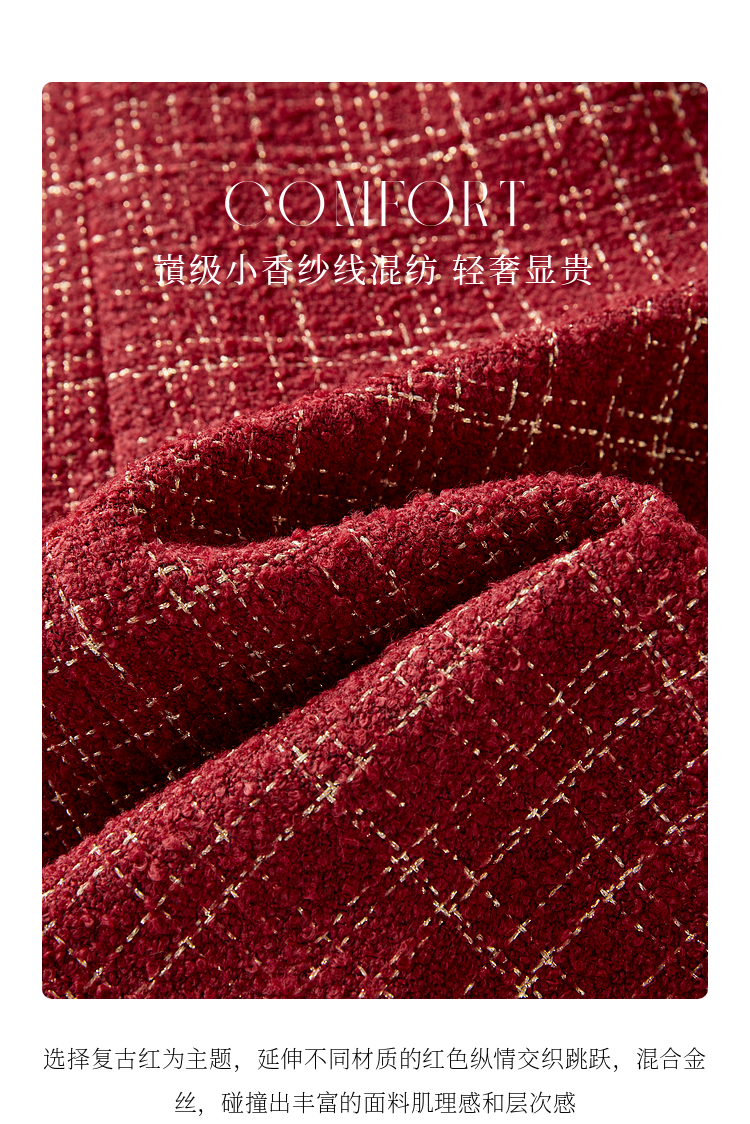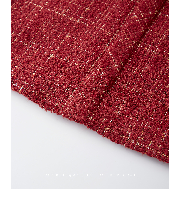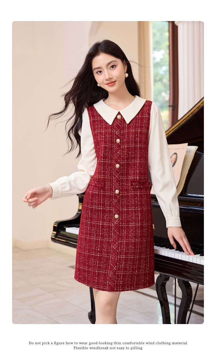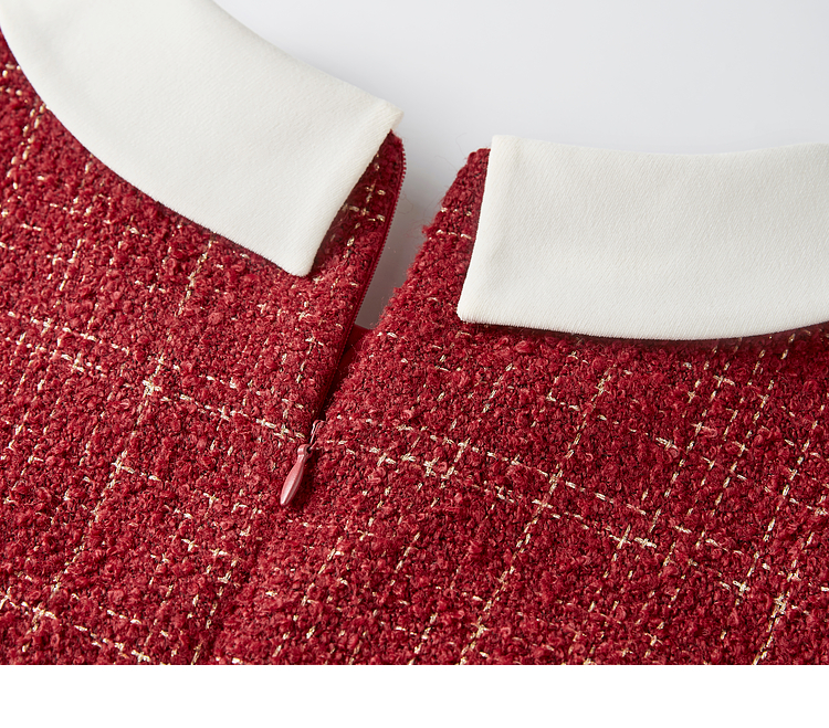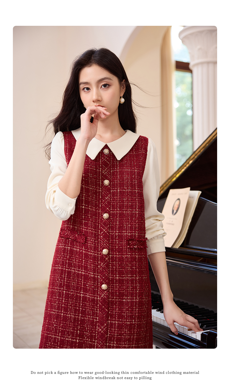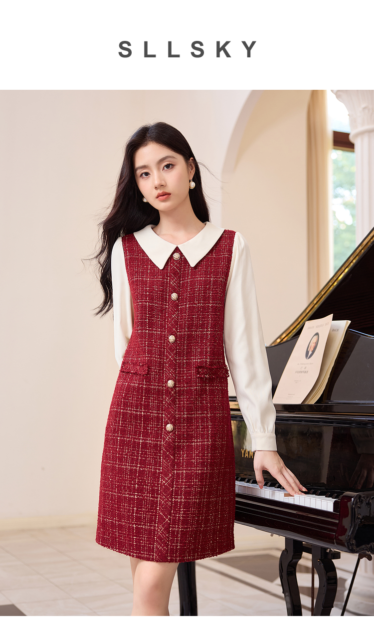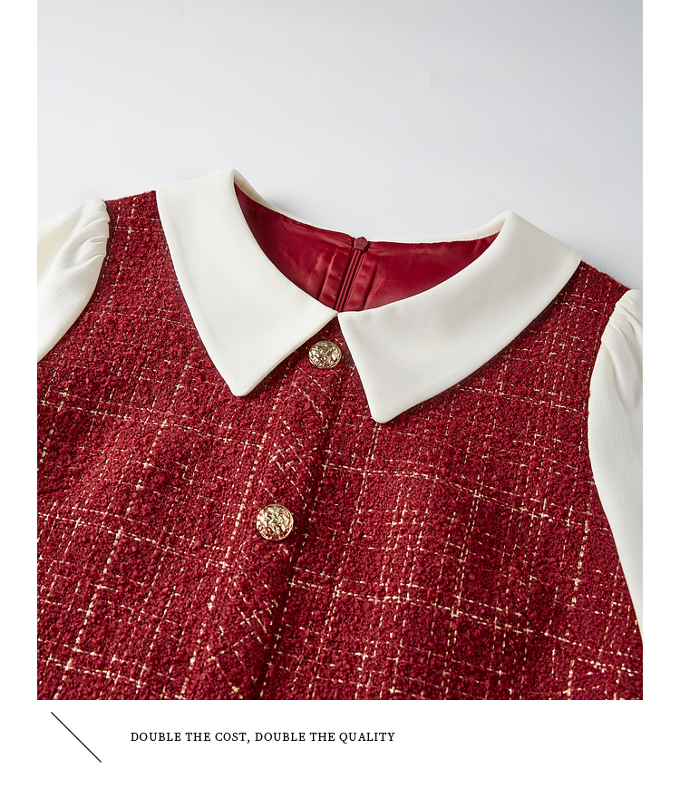 【专属特价】熙世界红色小香风假两件连衣裙女设计感粗花呢娃娃衬衫领裙子秋冬