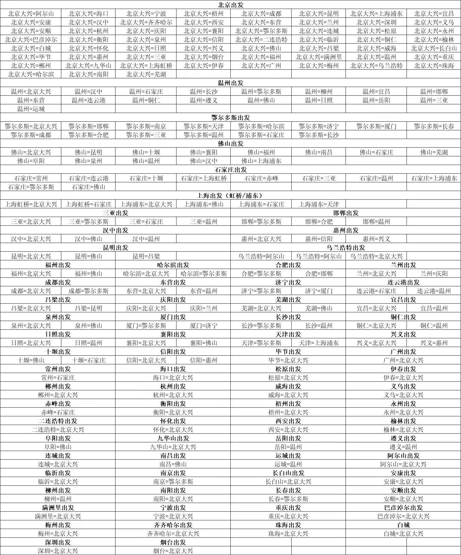(一)一年内任选3次往返航班乘坐(允许缺口程)。航线如下(具体航班计划以航空公司发布为准):