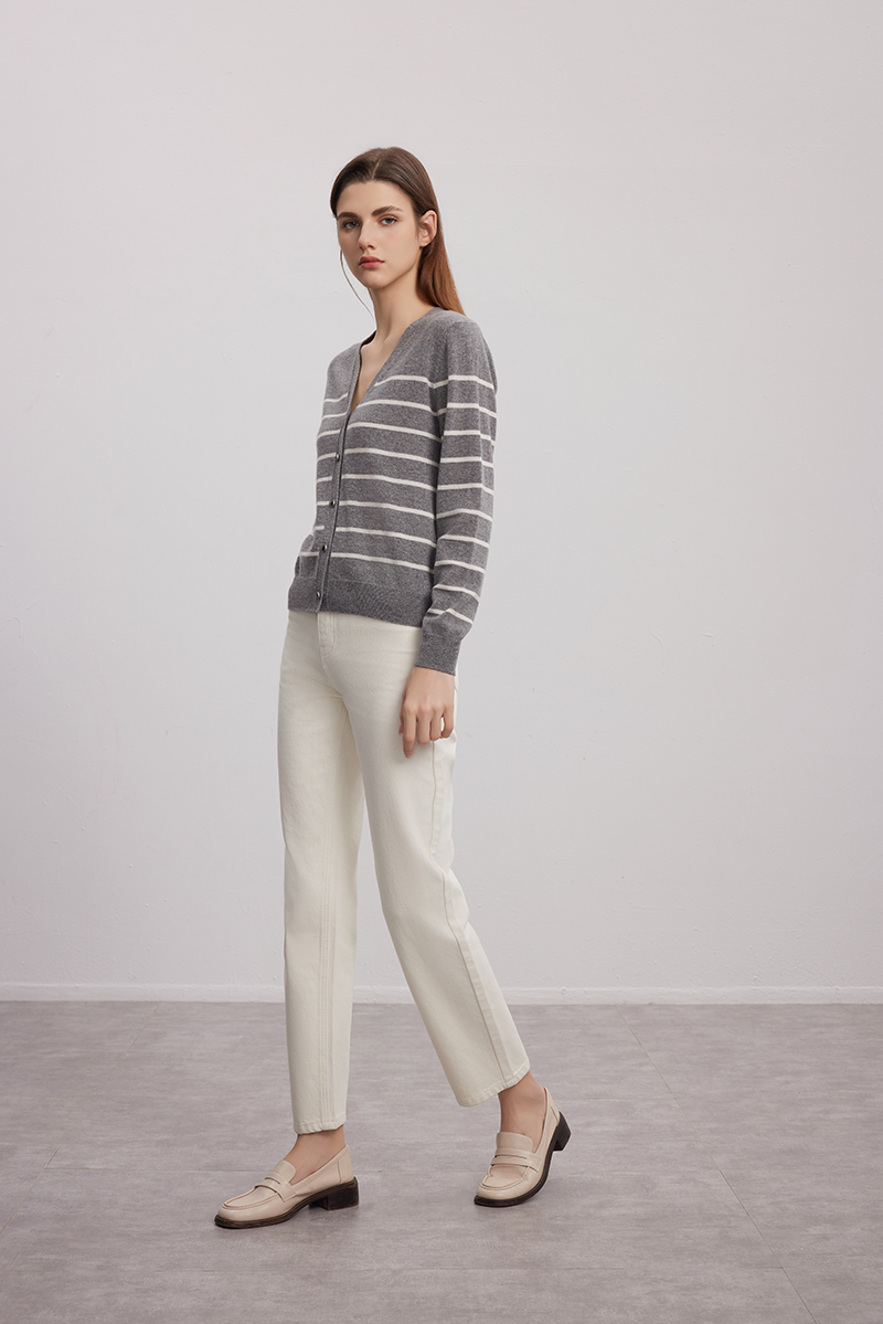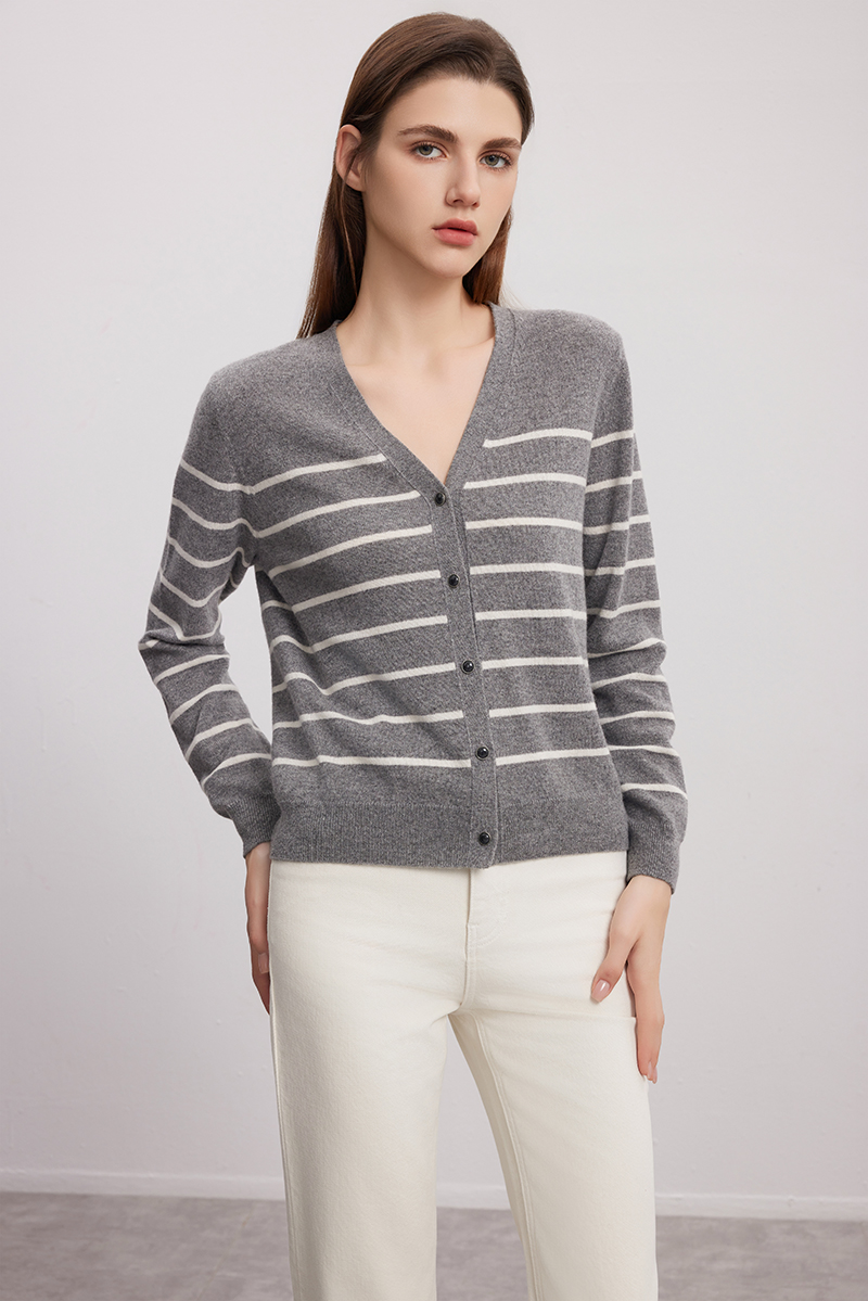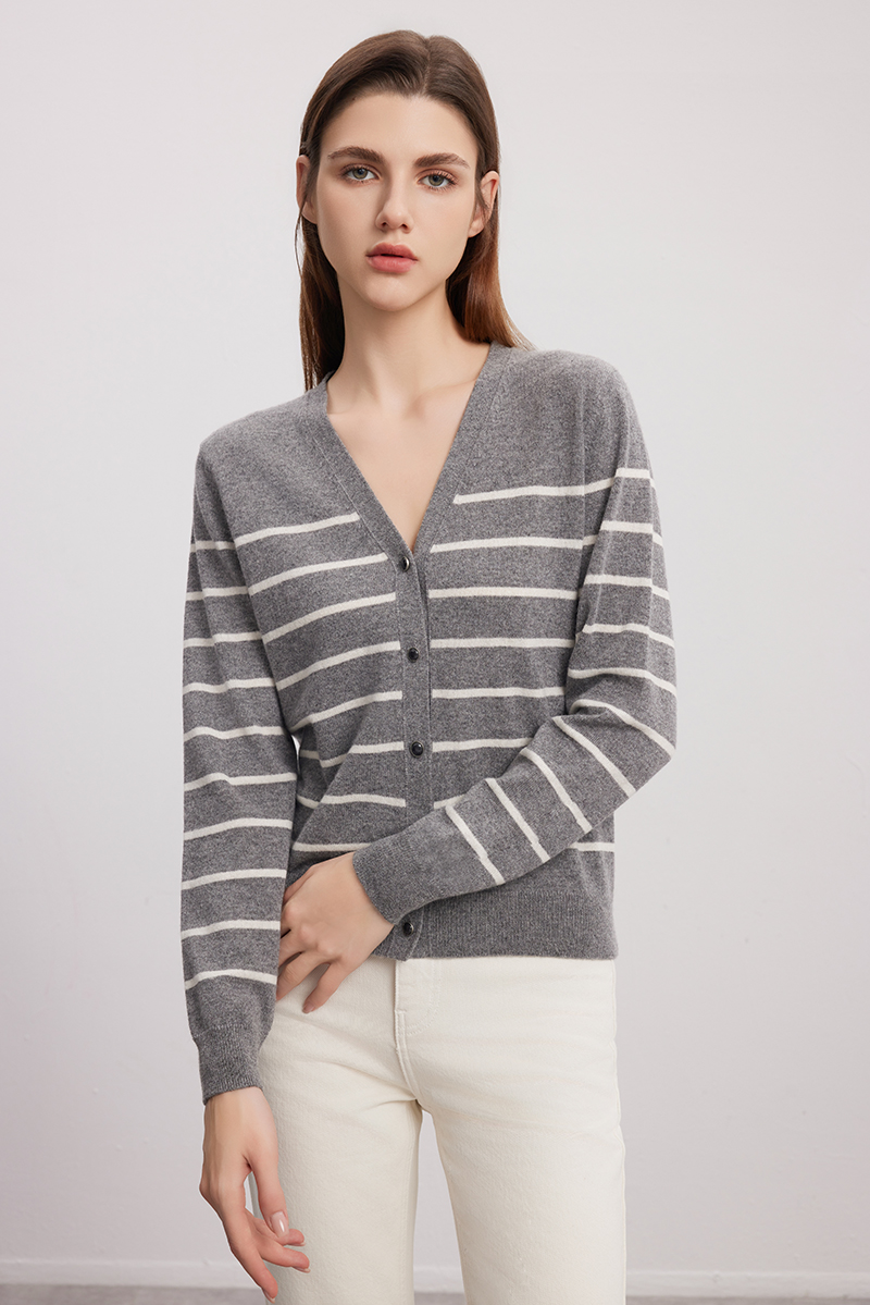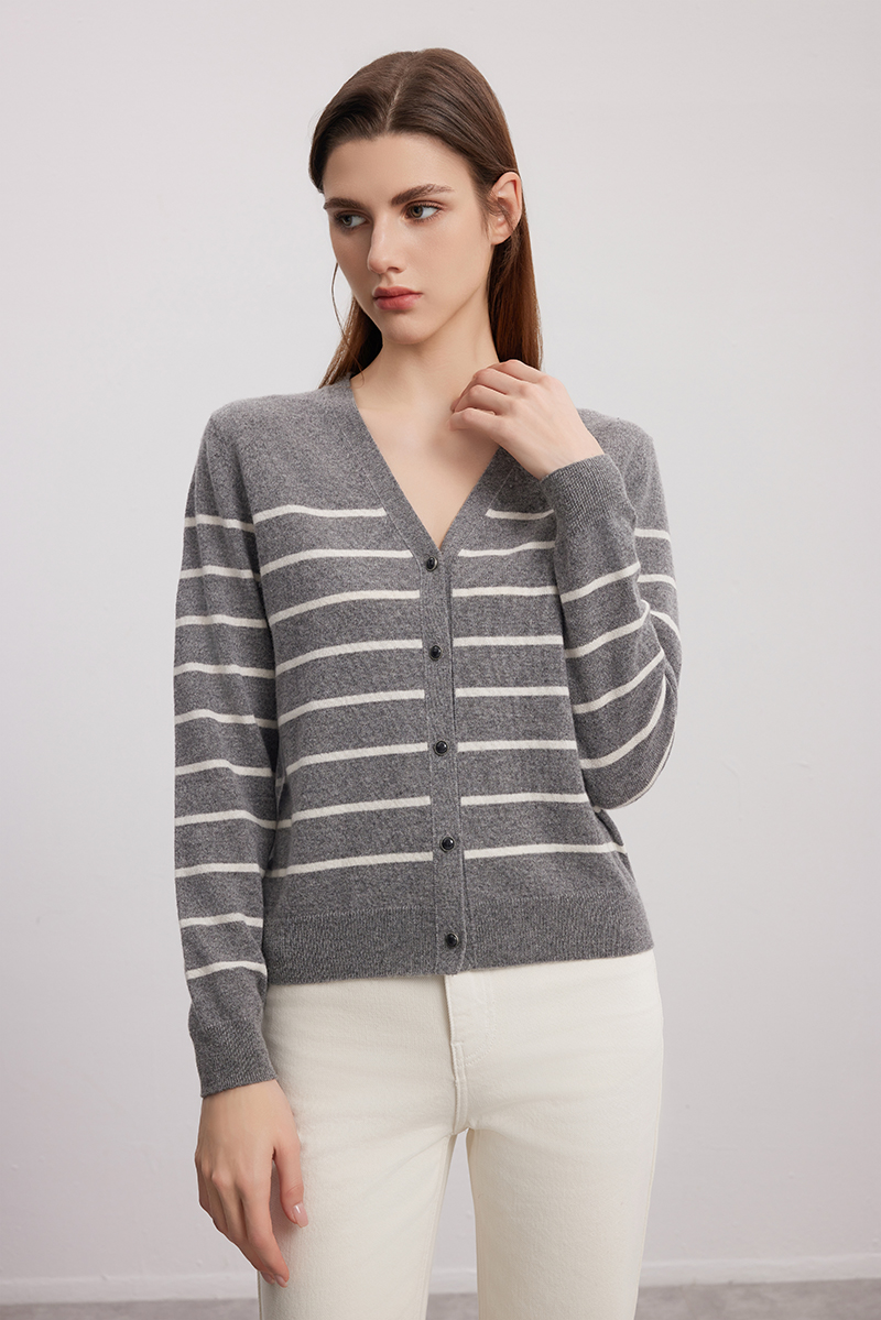 【V领条纹撞色开衫】羊绒世家秋冬新品女士100%山羊绒针织开衫小外套