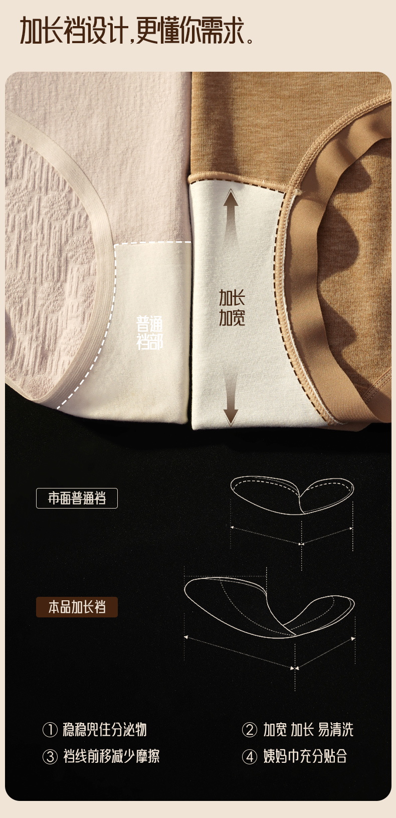 •加长裆设计 稳稳兜住分泌物 加宽 加长 易清洗 裆线前移减少摩擦