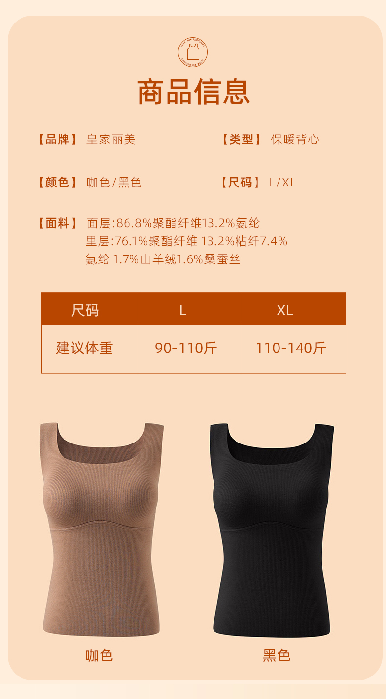皇家丽美一体自带胸垫不臃肿7A抗菌保暖背心马甲BND8F33