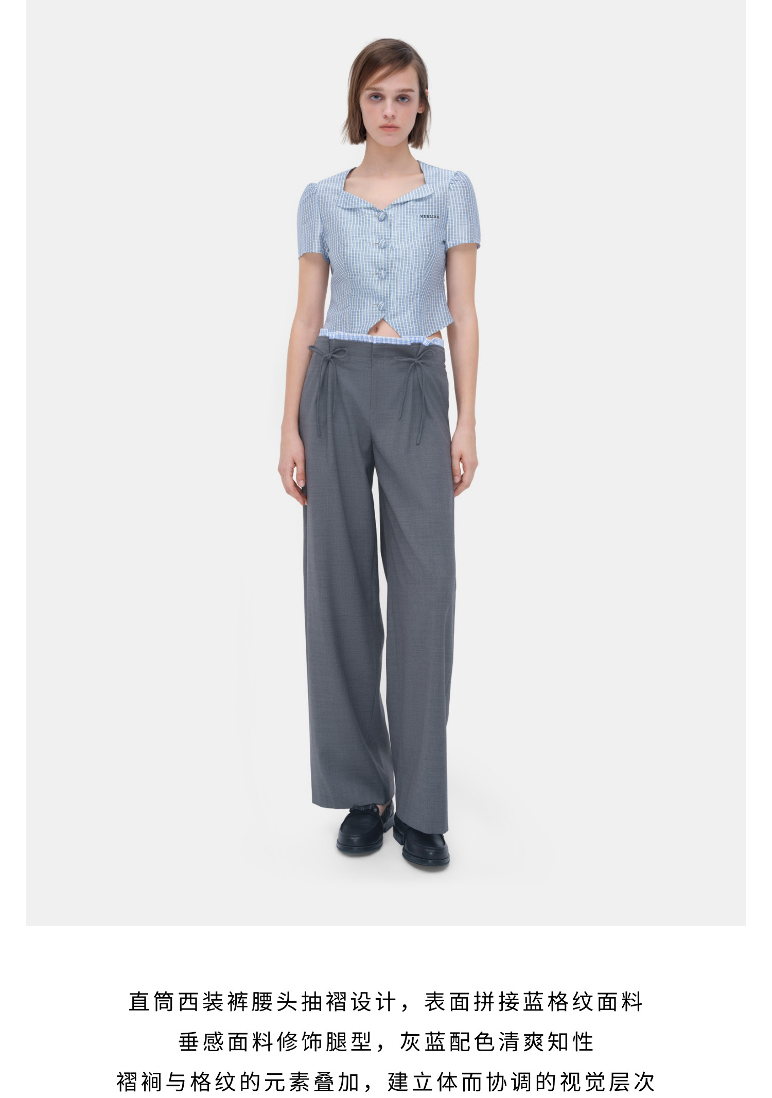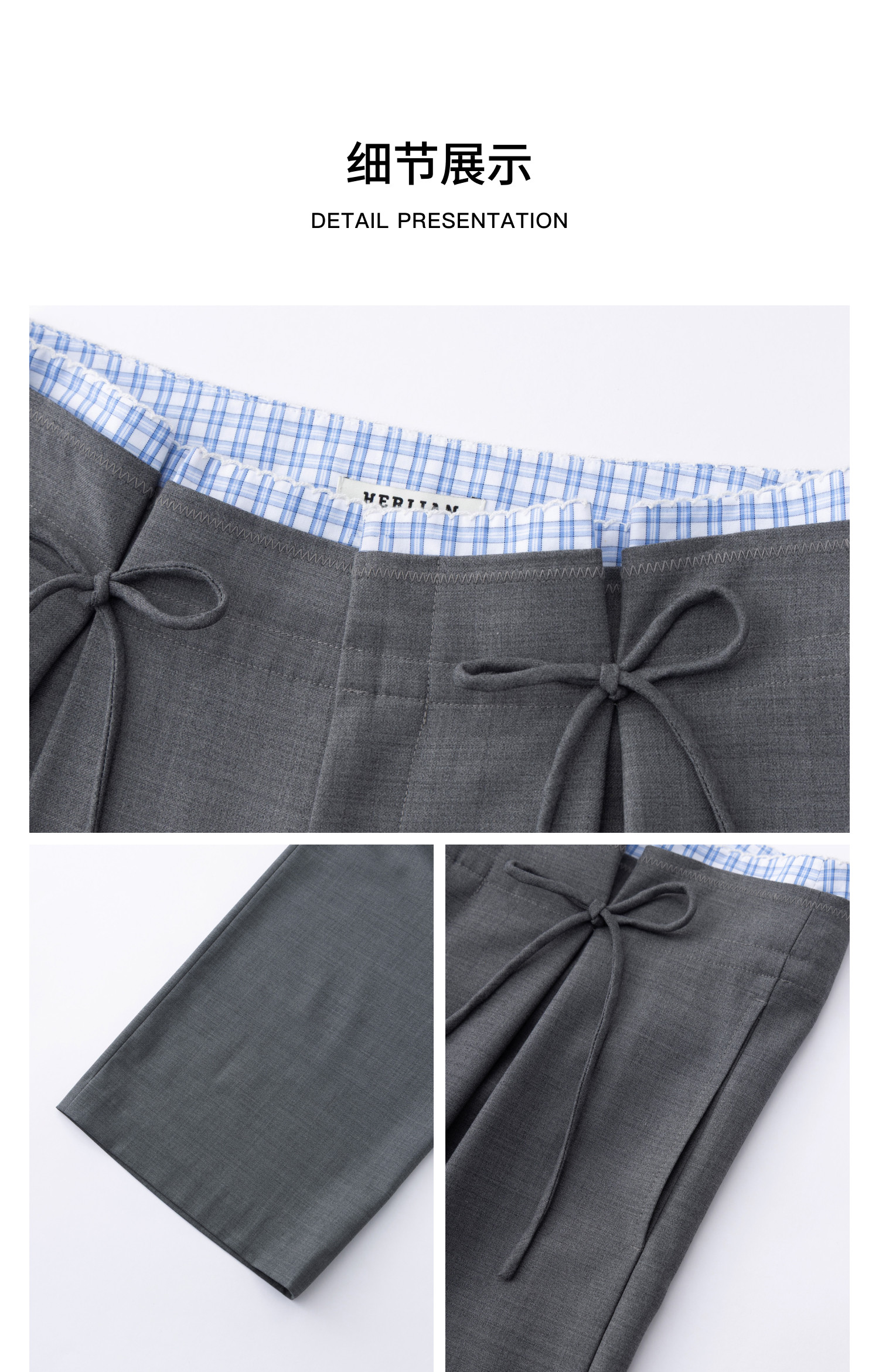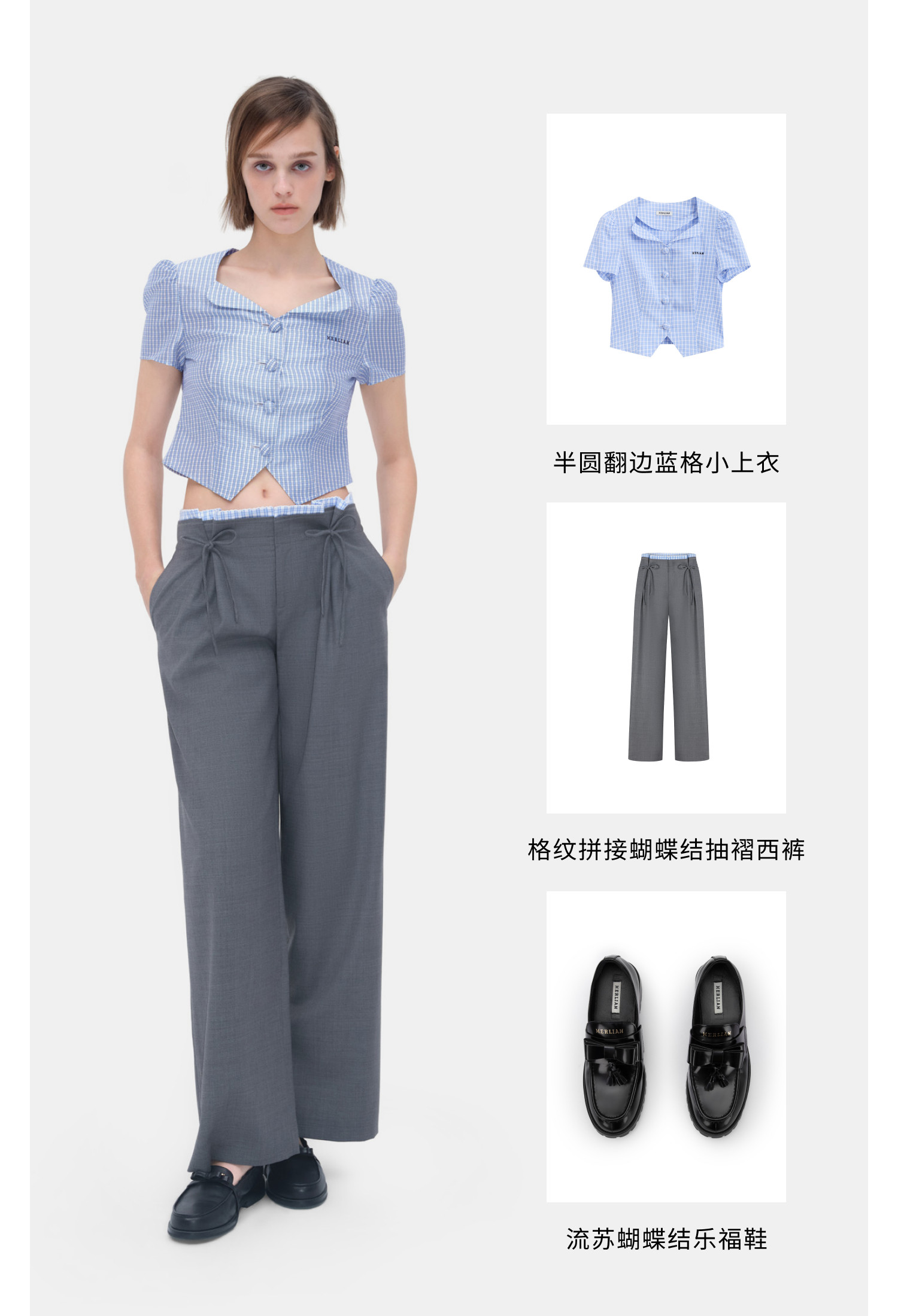 HERLIAN 2026年春季新品格纹拼接蝴蝶结抽褶设计西装裤直筒长裤