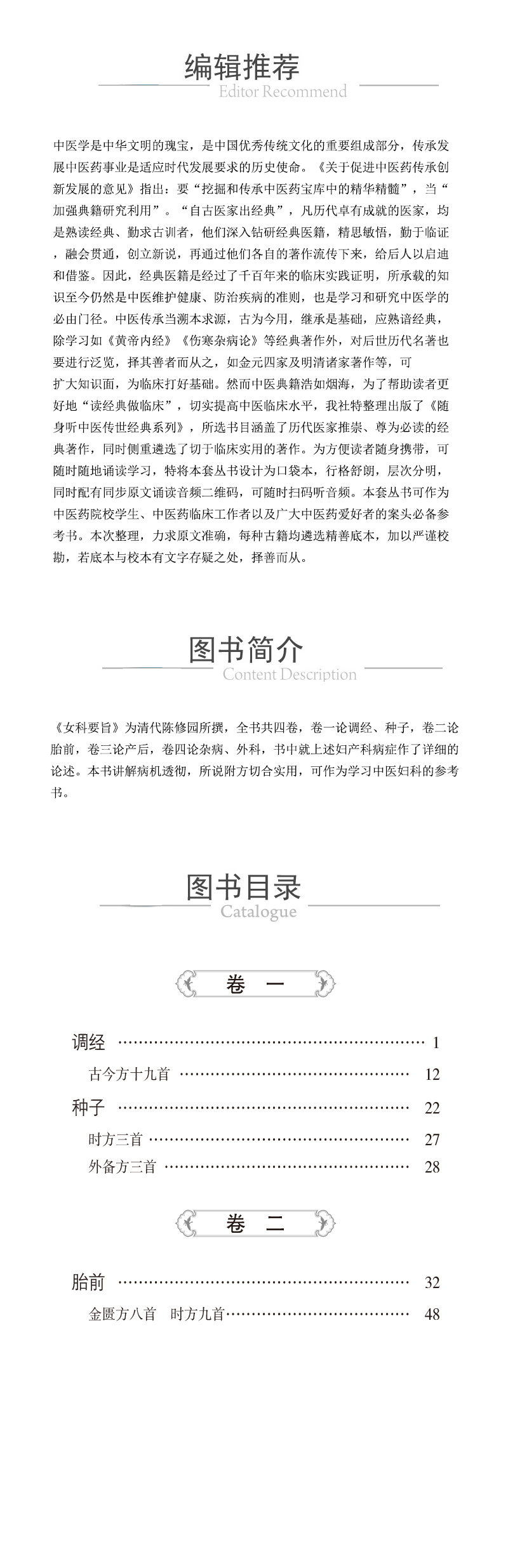 《女科要旨》是清代名医陈修园所著,全书共四卷,全书分为四卷,主要就调经、种子、胎前、产后、杂病及几种常见外科病症等作了比较详细的论述。作者根据《内经》之旨、《金匮》之法,提山了个人的见解,综合了前人的心得,介绍了妇科相关的理论知识。讲解病机简明透彻,所选附方切于实用,可作为学习中医妇科的参考书。本书配有原文诵读音频二维码,便于读者随时随地阅读学习。本书适合中医药院校学生、中医药从业者及广大中医药爱好者阅读。